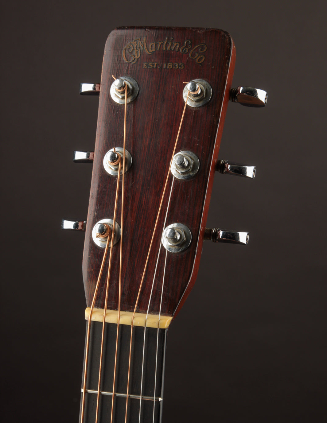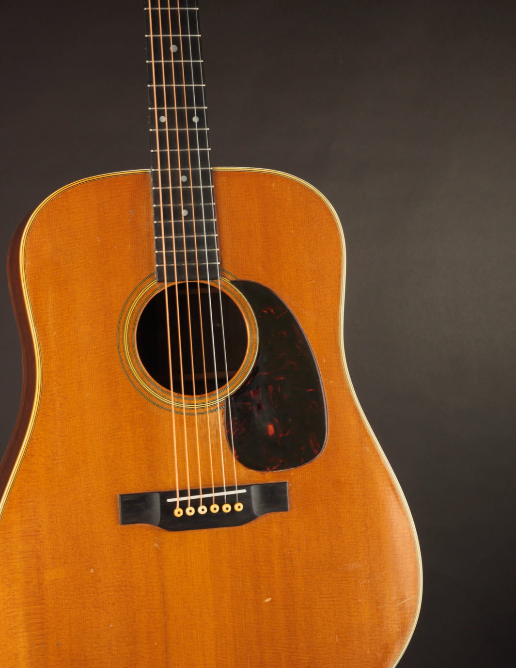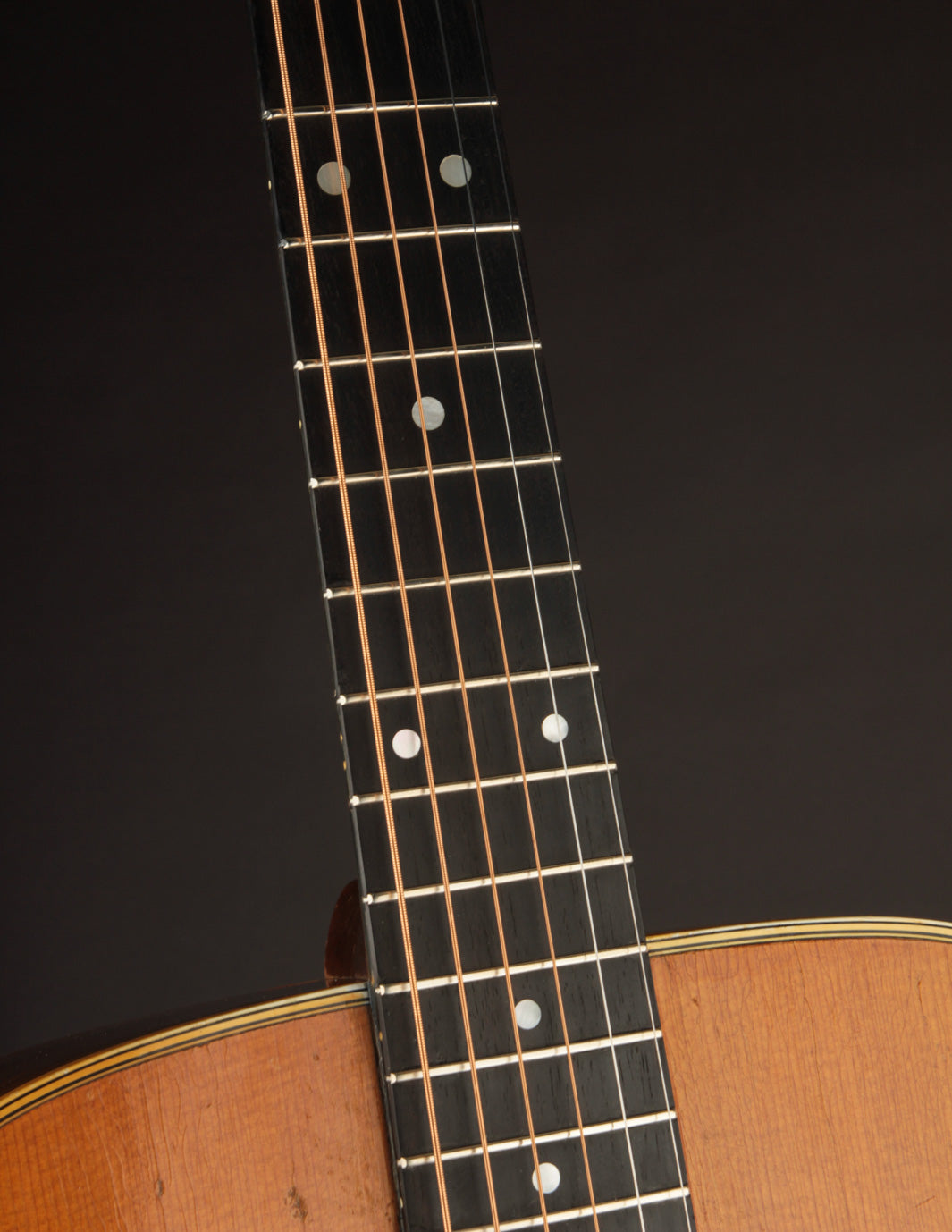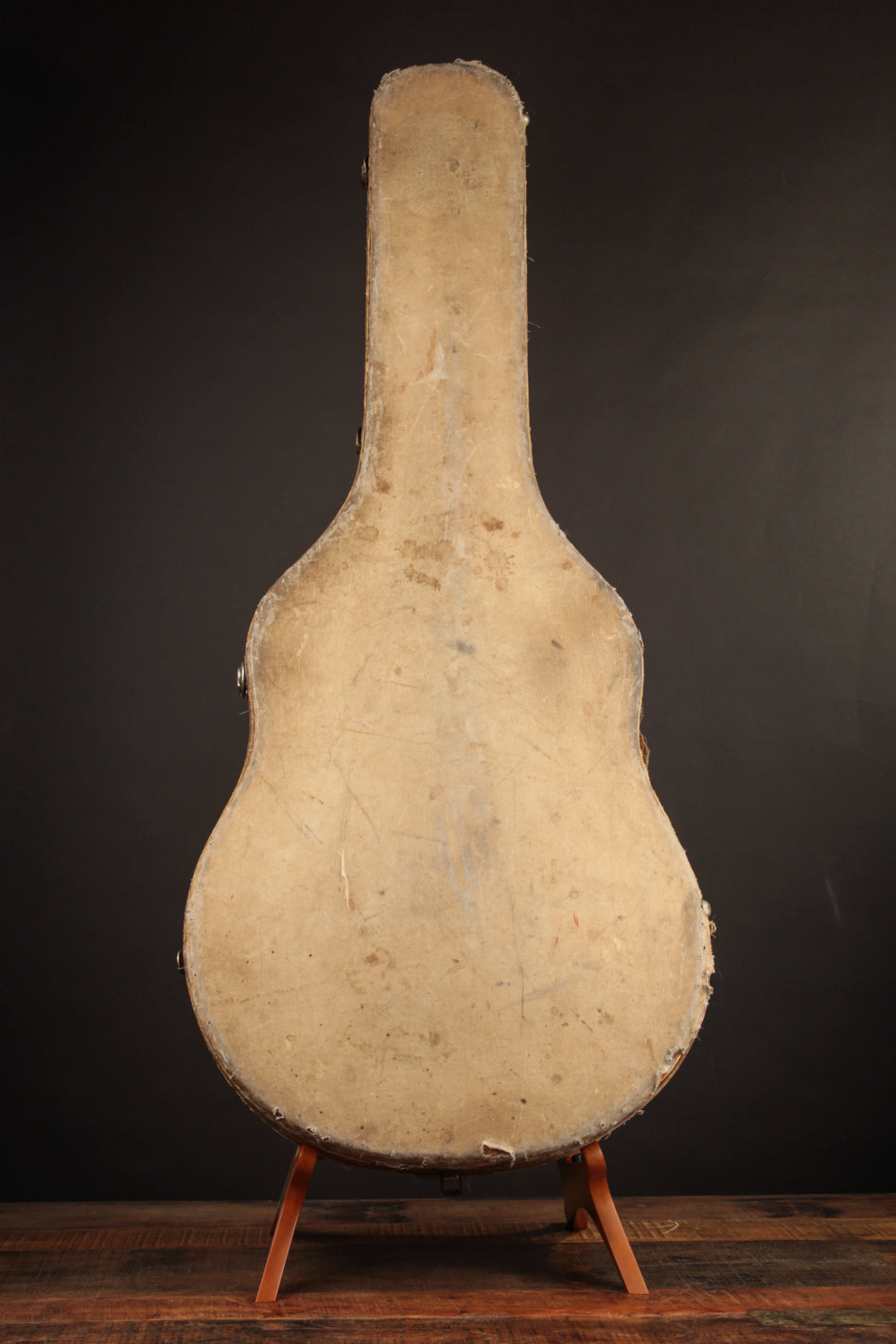 Our repair techs performed a neck reset, bridge replacement, refret, and glued cracks in the top and binding. The original pickguard had been replaced some time ago (though we think the tortoise one on the guitar looks better than an original black one would). All internal components are original and in good condition. We've kept the guitar with the original owner's case, though as the photos show it's a bit worse for the wear. We have new Martin dreadnought cases in stock if an upgrade is desired. Please note that expedited shipping is required at online checkout ~ interested buyers are welcome to contact us for Ground options.