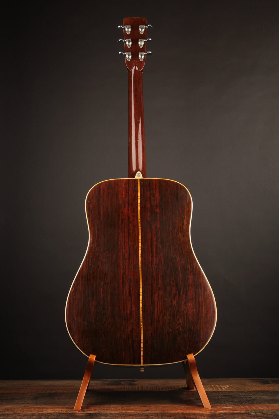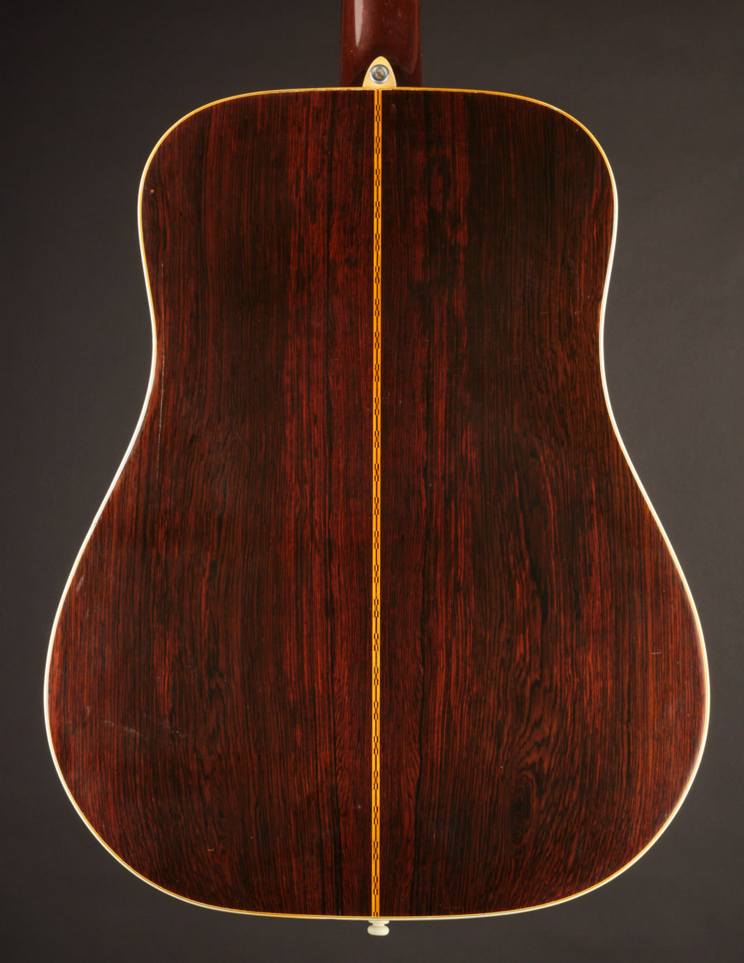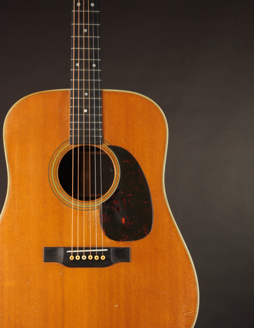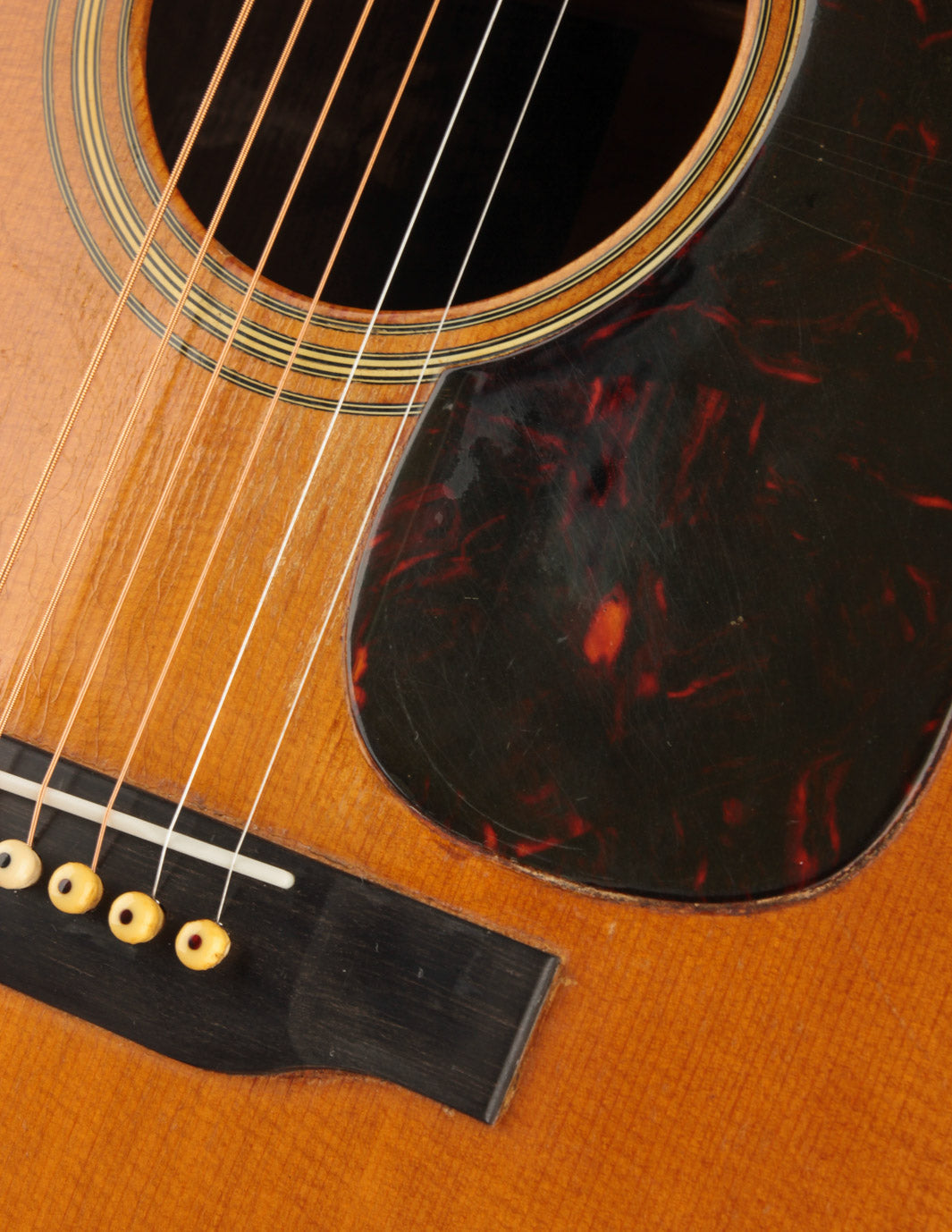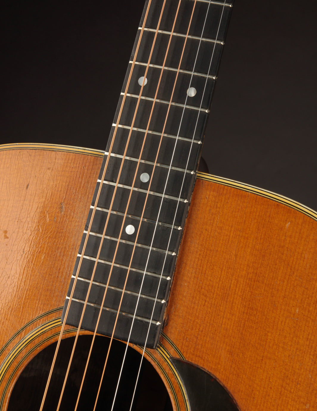 Our repair techs performed a neck reset, bridge replacement, refret, and glued cracks in the top and binding. The original pickguard had been replaced some time ago (though we think the tortoise one on the guitar looks better than an original black one would). All internal components are original and in good condition. We've kept the guitar with the original owner's case, though as the photos show it's a bit worse for the wear. We have new Martin dreadnought cases in stock if an upgrade is desired. Please note that expedited shipping is required at online checkout ~ interested buyers are welcome to contact us for Ground options.