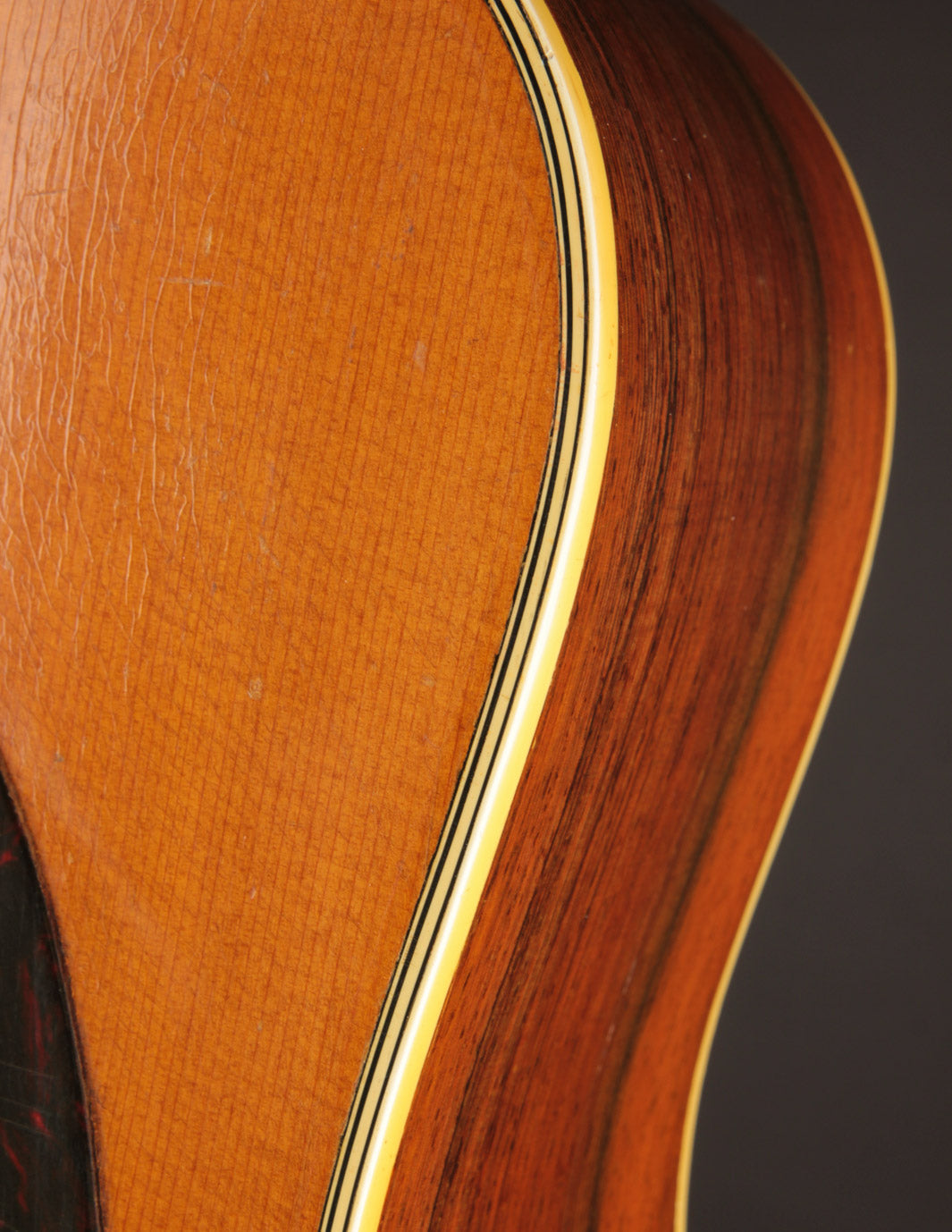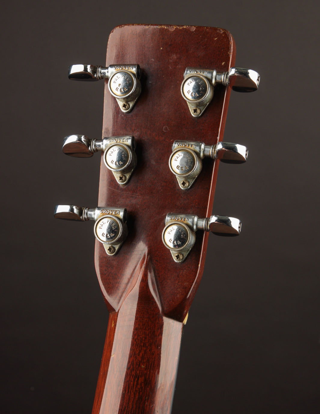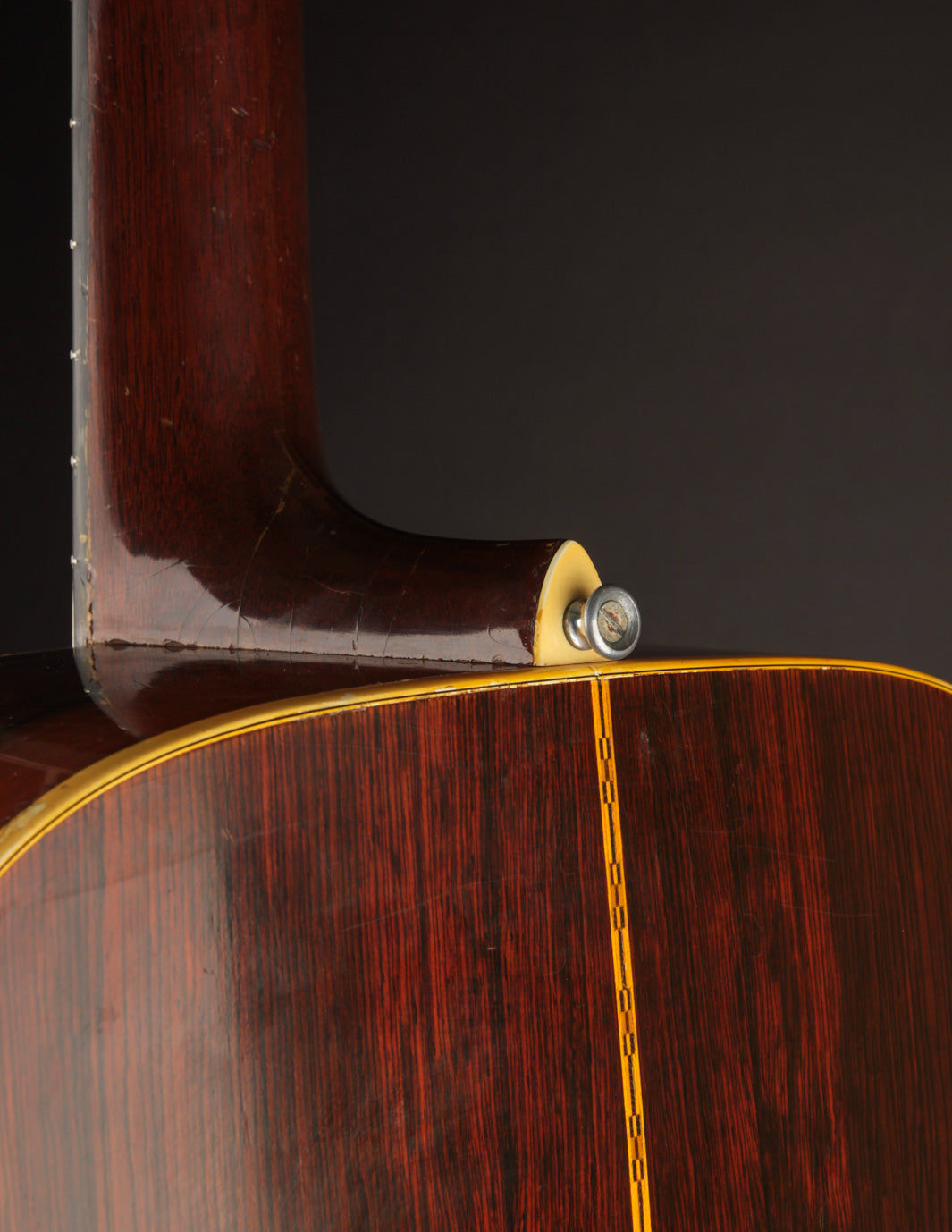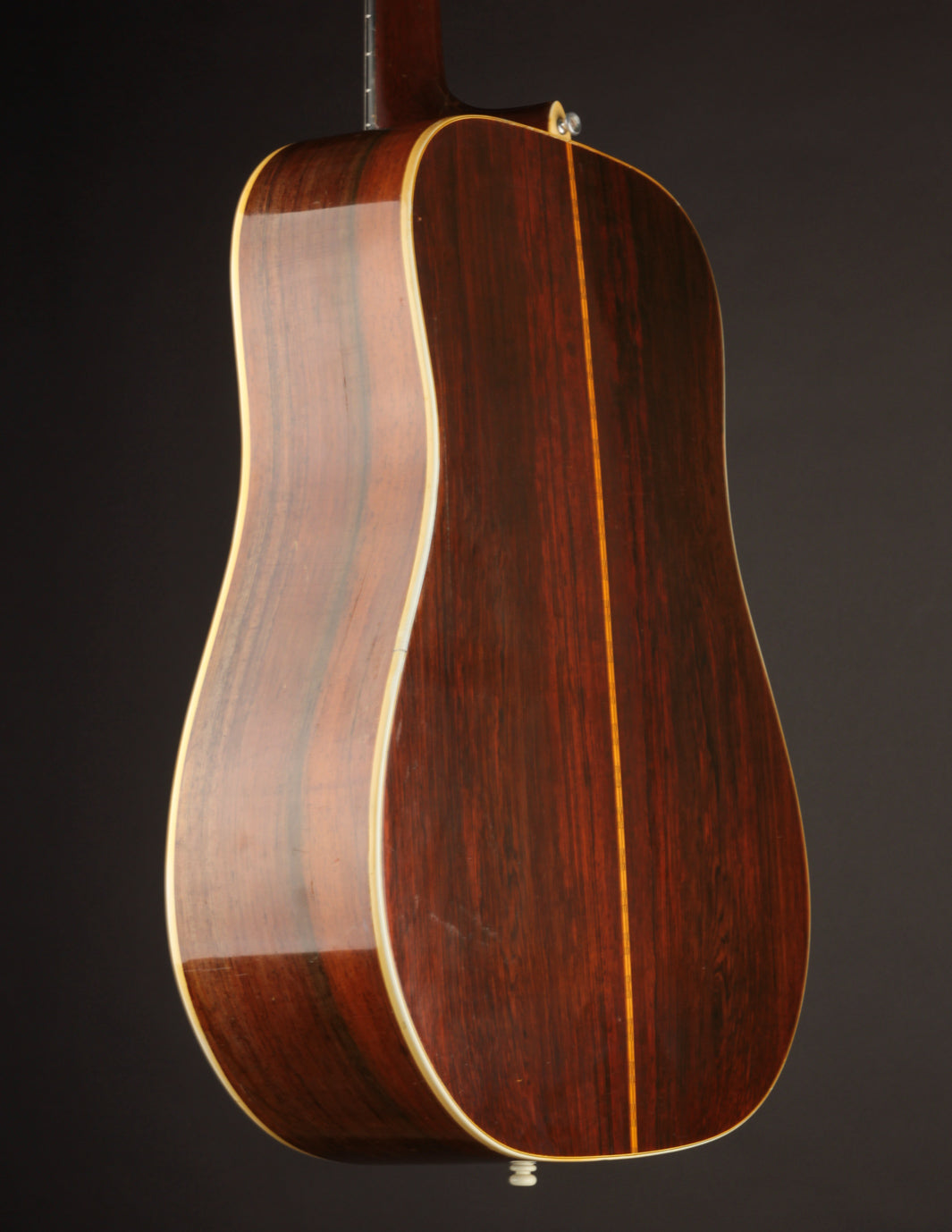Our repair techs performed a neck reset, bridge replacement, refret, and glued cracks in the top and binding. The original pickguard had been replaced some time ago (though we think the tortoise one on the guitar looks better than an original black one would). All internal components are original and in good condition. We've kept the guitar with the original owner's case, though as the photos show it's a bit worse for the wear. We have new Martin dreadnought cases in stock if an upgrade is desired. Please note that expedited shipping is required at online checkout ~ interested buyers are welcome to contact us for Ground options.