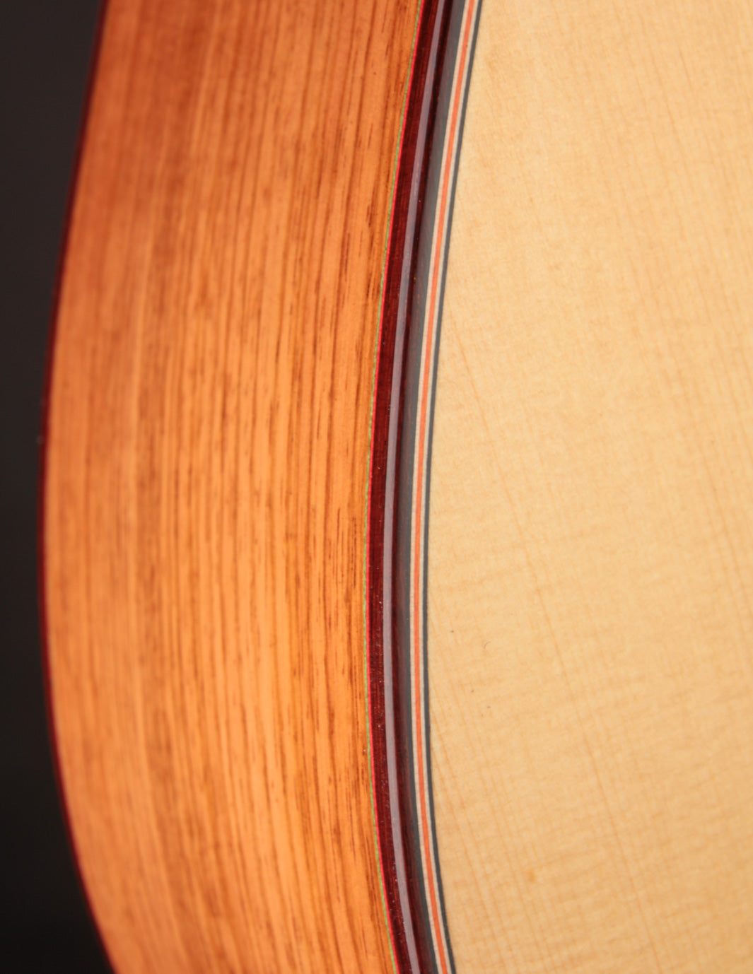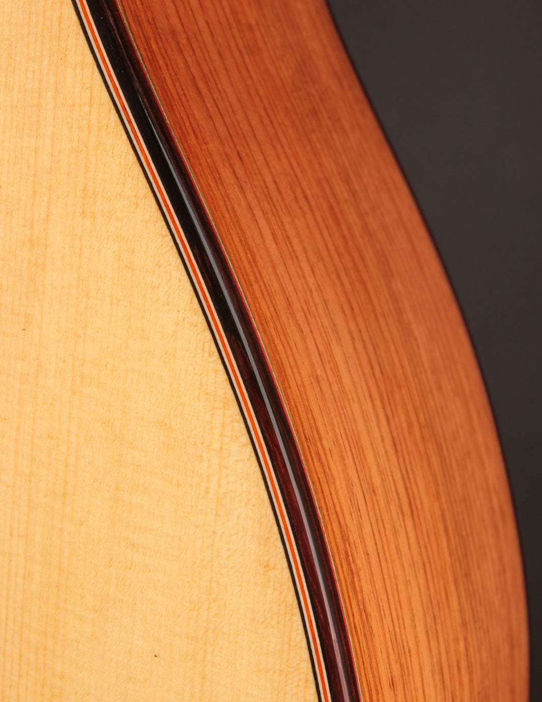Dark wood binding and a multicolored rosette with matching purflings complete the very tasteful aesthetic.