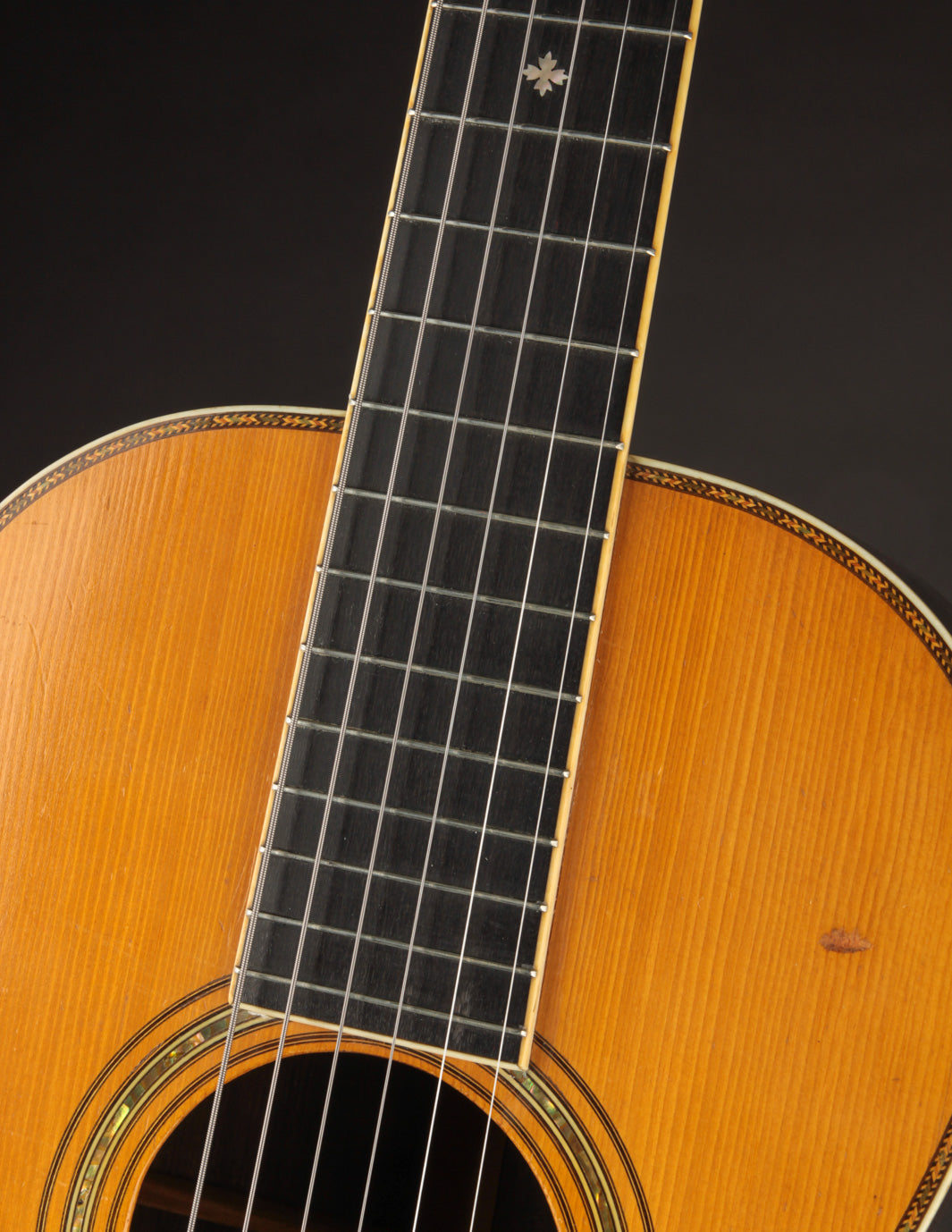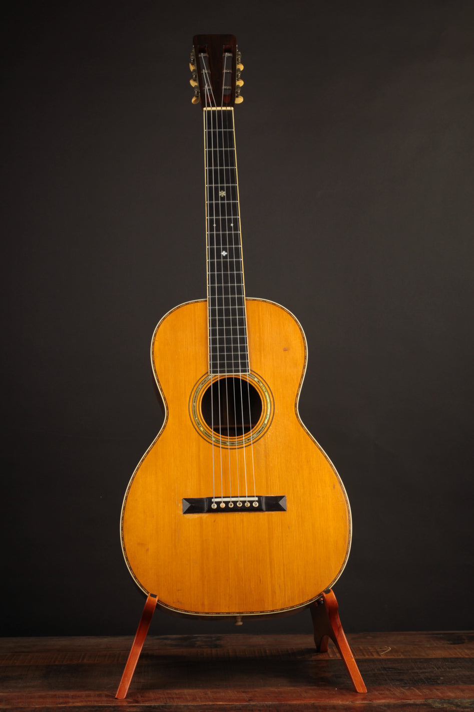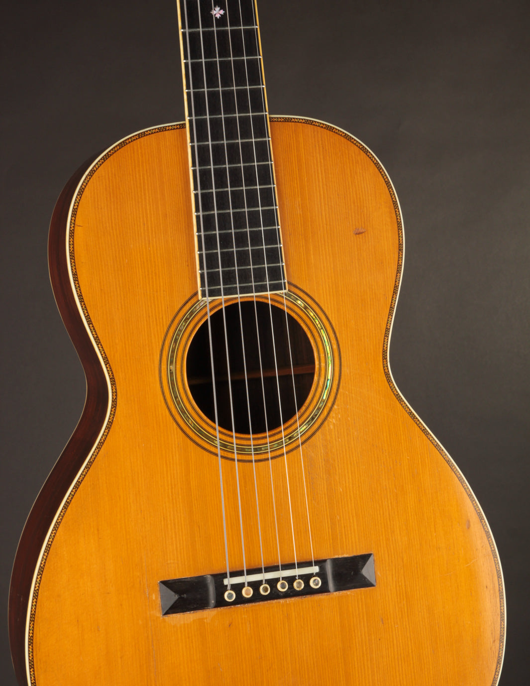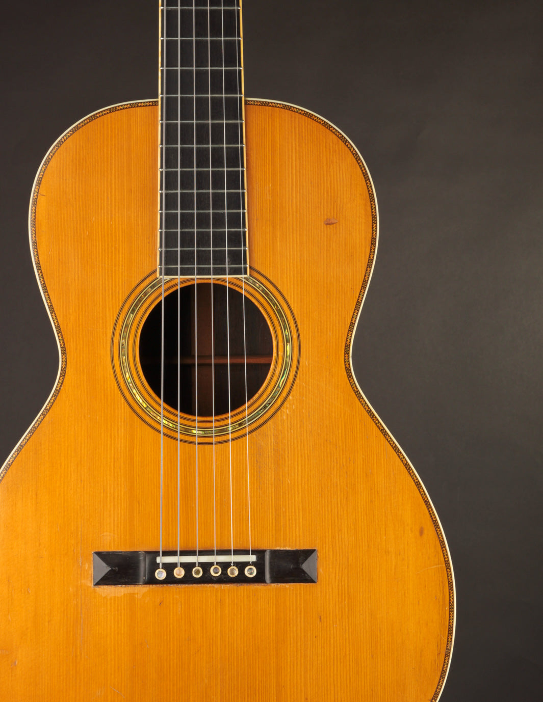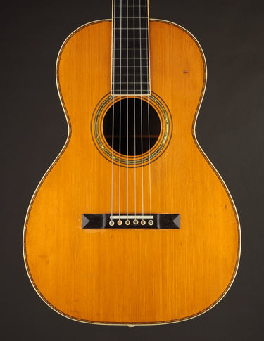 Condition: in vintage terms, this guitar falls somewhere between "very good" and "excellent." Certainly, for a 110-year old guitar, it's in great shape! There's one previously repaired top crack near the bass foot of the bridge, and an almost-invisible, hairline crack in the top (treble side, upper bout) that isn't through the wood. There are scattered dings and fingernail wear across the soundboard (remember, this guitar was played!). And the back shows a small assortment of scratches and a spot of smudgy wear (possibly from a rubber guitar stand). Our shop has installed a new saddle (the original is in the case), and the guitar plays easily with a straight neck and minimal top belly. The included case is the only one the guitar ever had, to the best of the family's knowledge -- it's a 1960's chipboard hard case. On consignment; expedited shipping required.