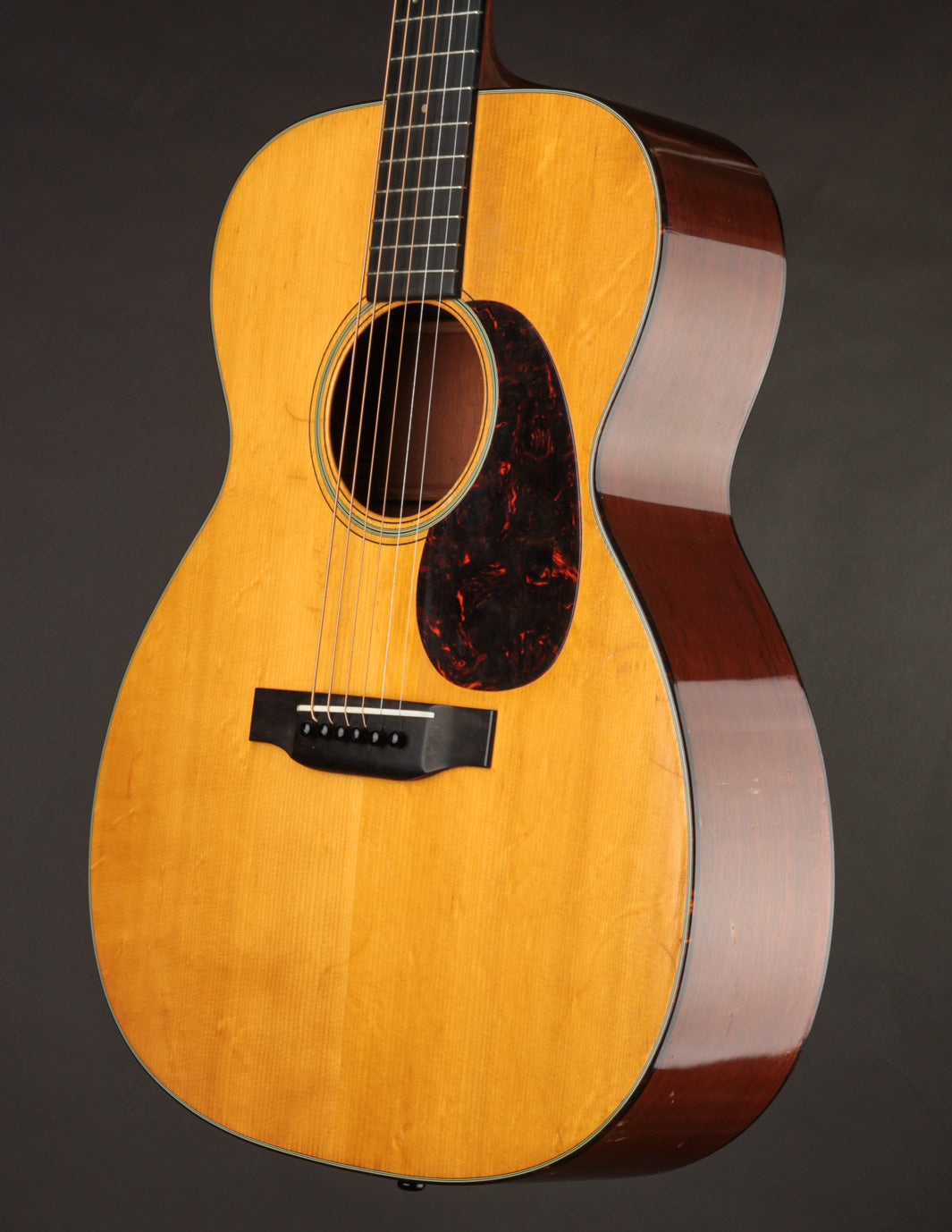 Condition: near mint, as far as vintage Martins are concerned. The perfect replica bridge was made by luthier, Jim Baggett, of Mass Street Music. All other structural components are original, including the internal bracing and the bridge plate. The finish is original throughout; and it would be accurately described as shockingly clean ~ even the amount of (expected) crazing that's present is extremely minimal by vintage standards. There's one extremely tight, sealed side crack (bass side, upper bout) which is virtually undetectable to the naked eye. The scattered small scratches present are the byproduct of regular use; and these too are scant compared to most other 80-year-old guitars. Simply put, this is a wonderful sounding 000-18, in the sort of condition that would excite players and collectors alike. On consignment; priced with non-original hardshell case. Payment is requested by check or wire transfer.