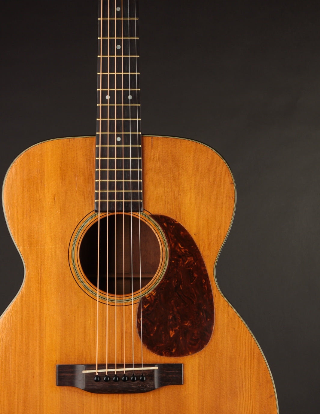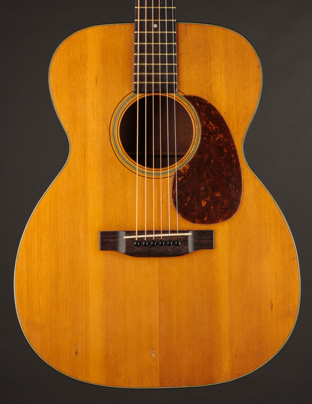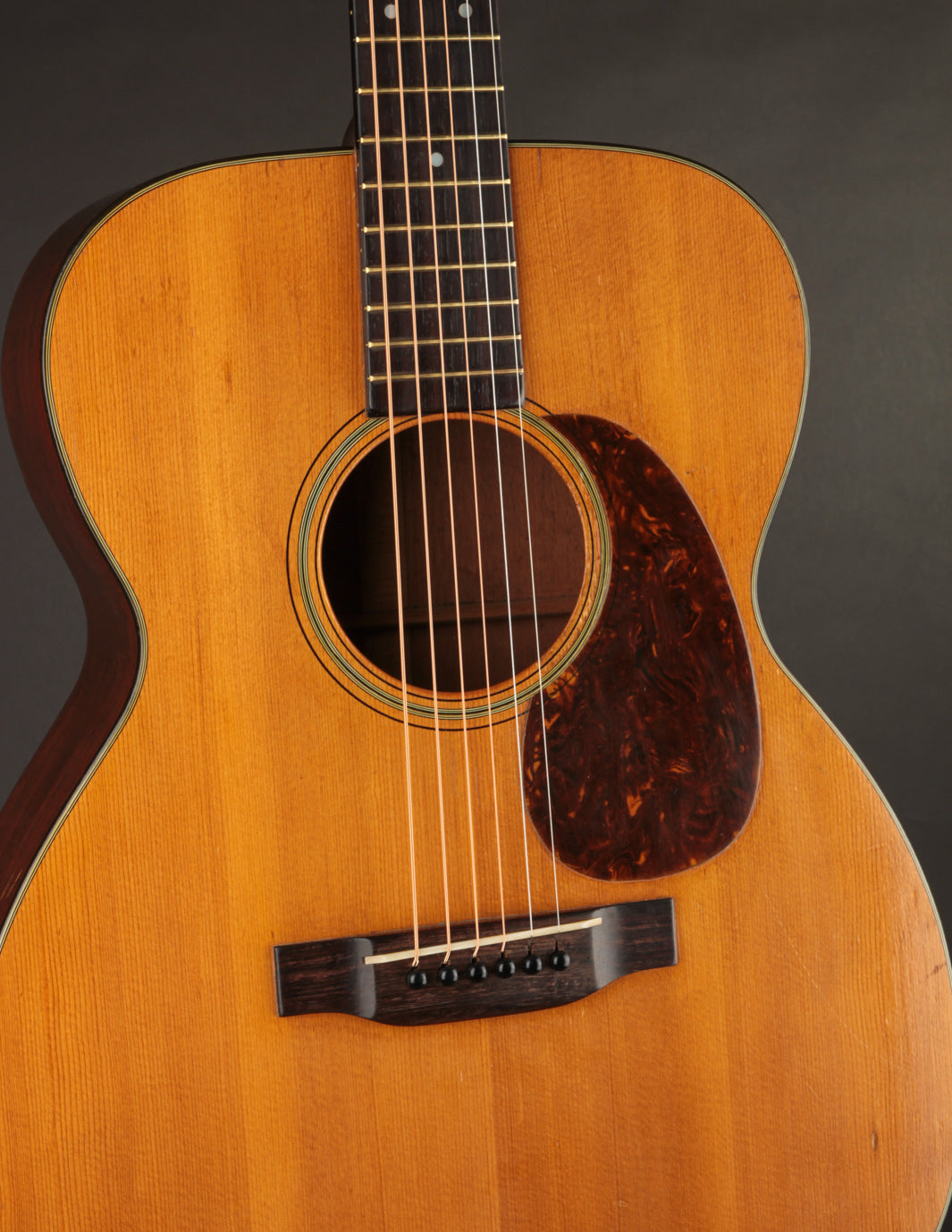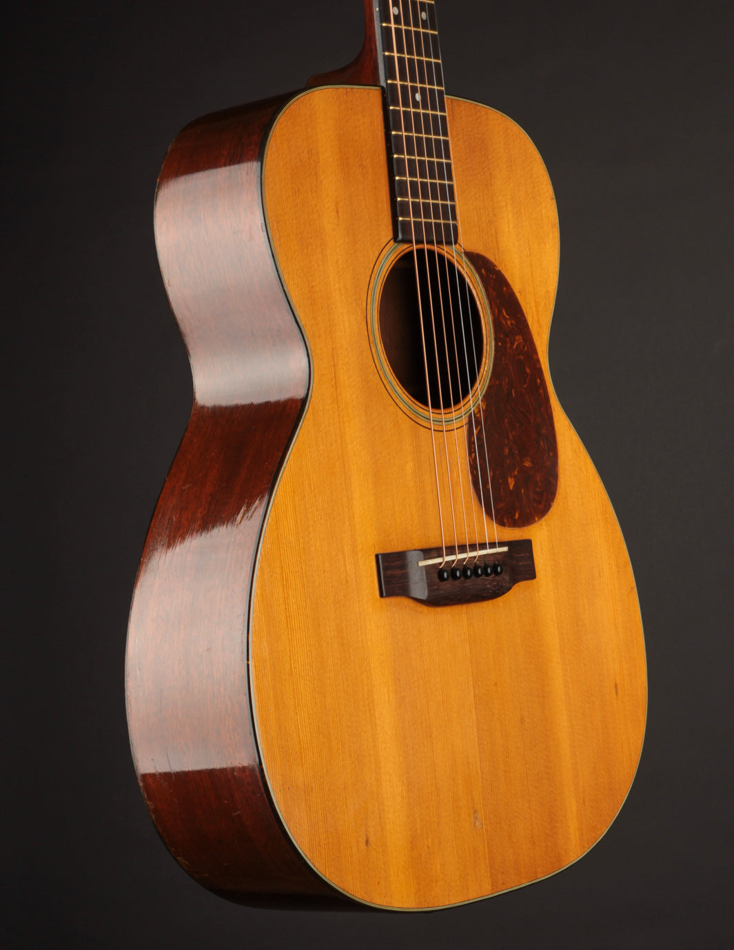 The guitar has had a recent neck reset, and plays cleanly up and down the neck. Our shop has installed a new nut, to replace an older replacement with too-narrow spacing. The back has been refinished, and the back and sides show light overspray. The bridge is original, and the bridge plate appears so as well. It's likely that a luthier has thinned the neck a bit at some point in the past: it feels a bit thinner in the first position than other Martins from this period, and the neck finish shows signs of alteration in that area. To reiterate, the takeaway with this guitar is: excellent sounding instrument for a player who doesn't mind a few alterations. Priced with new hard case from the "Original Case Co." Expedited shipping only online -- please contact us for other options!