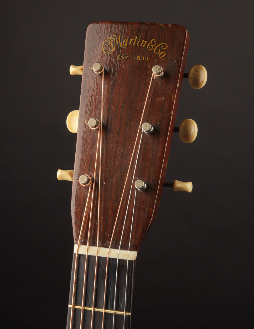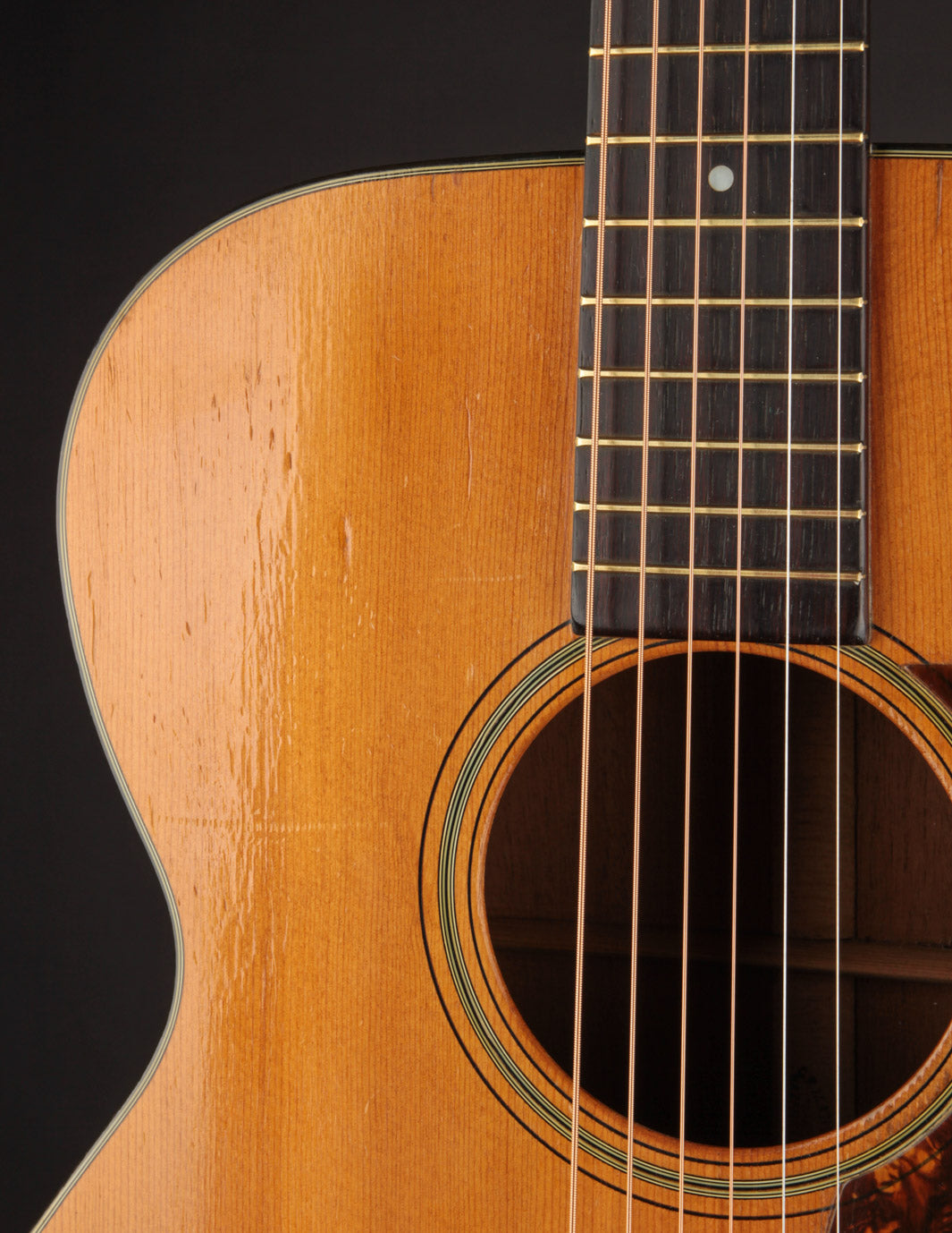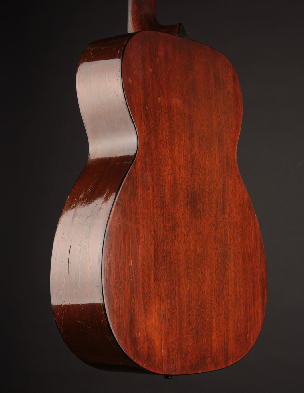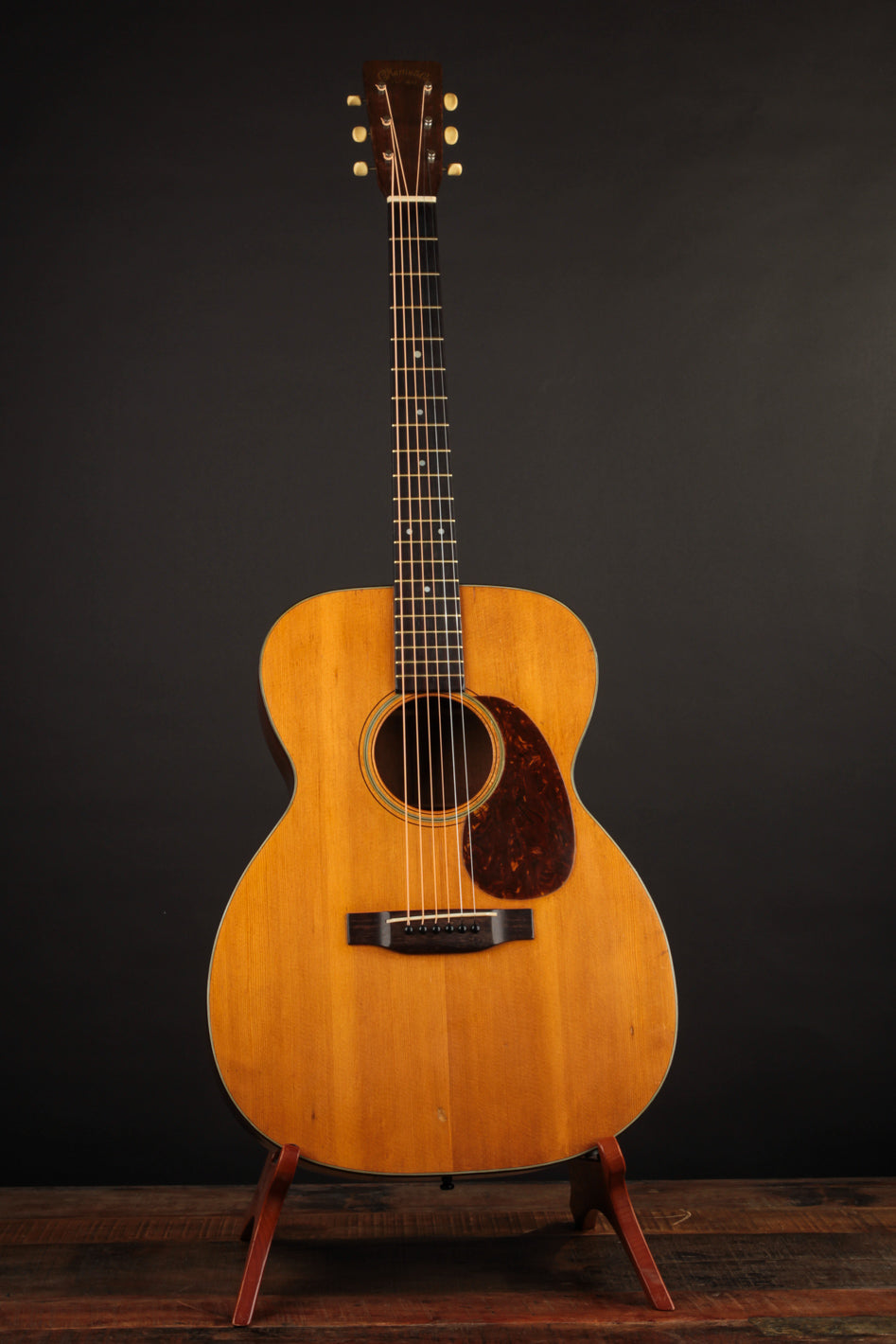 The guitar has had a recent neck reset, and plays cleanly up and down the neck. Our shop has installed a new nut, to replace an older replacement with too-narrow spacing. The back has been refinished, and the back and sides show light overspray. The bridge is original, and the bridge plate appears so as well. It's likely that a luthier has thinned the neck a bit at some point in the past: it feels a bit thinner in the first position than other Martins from this period, and the neck finish shows signs of alteration in that area. To reiterate, the takeaway with this guitar is: excellent sounding instrument for a player who doesn't mind a few alterations. Priced with new hard case from the "Original Case Co." Expedited shipping only online -- please contact us for other options!