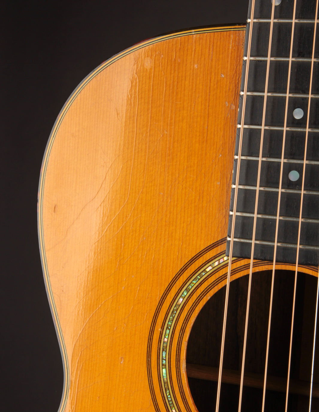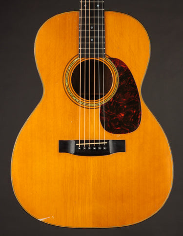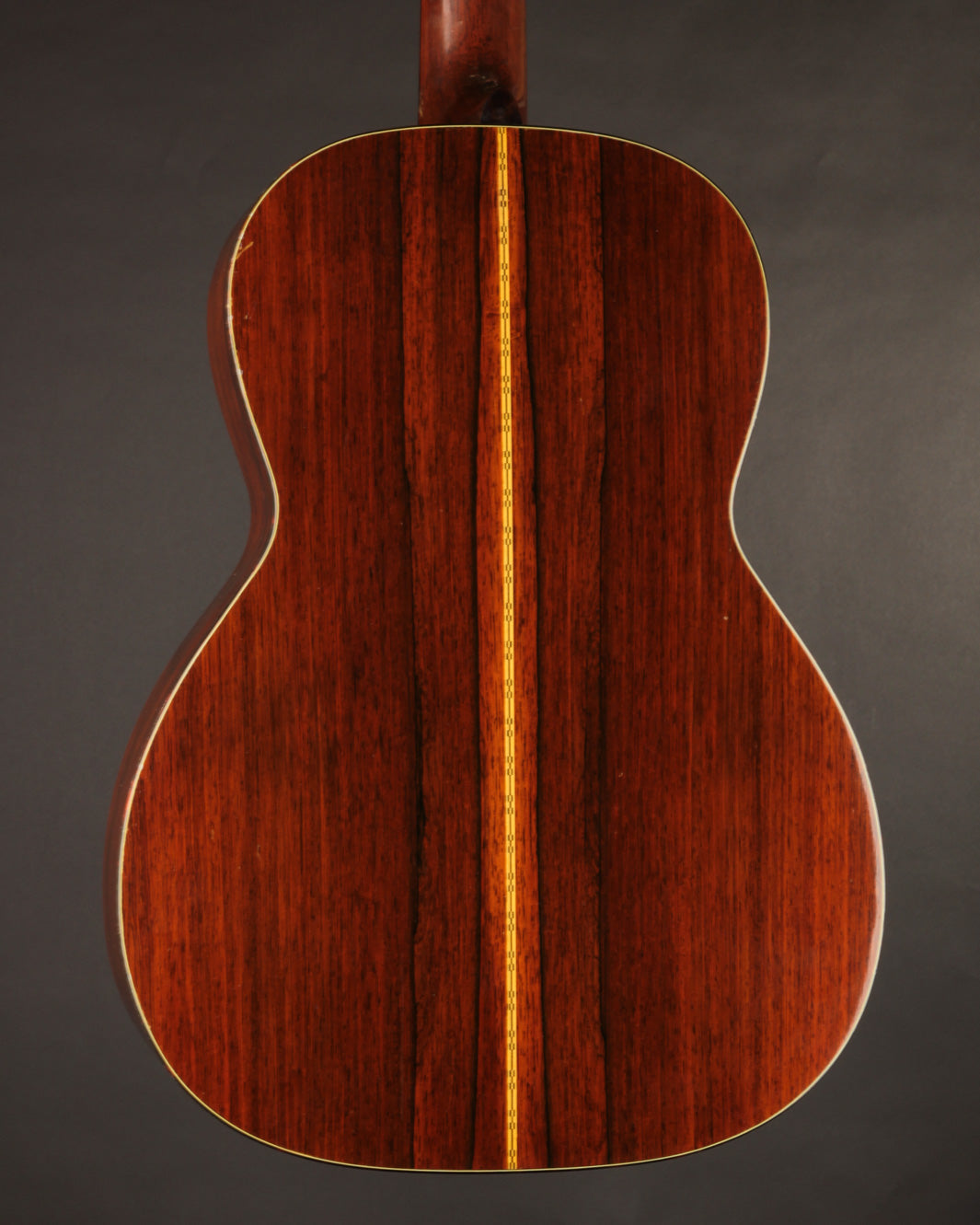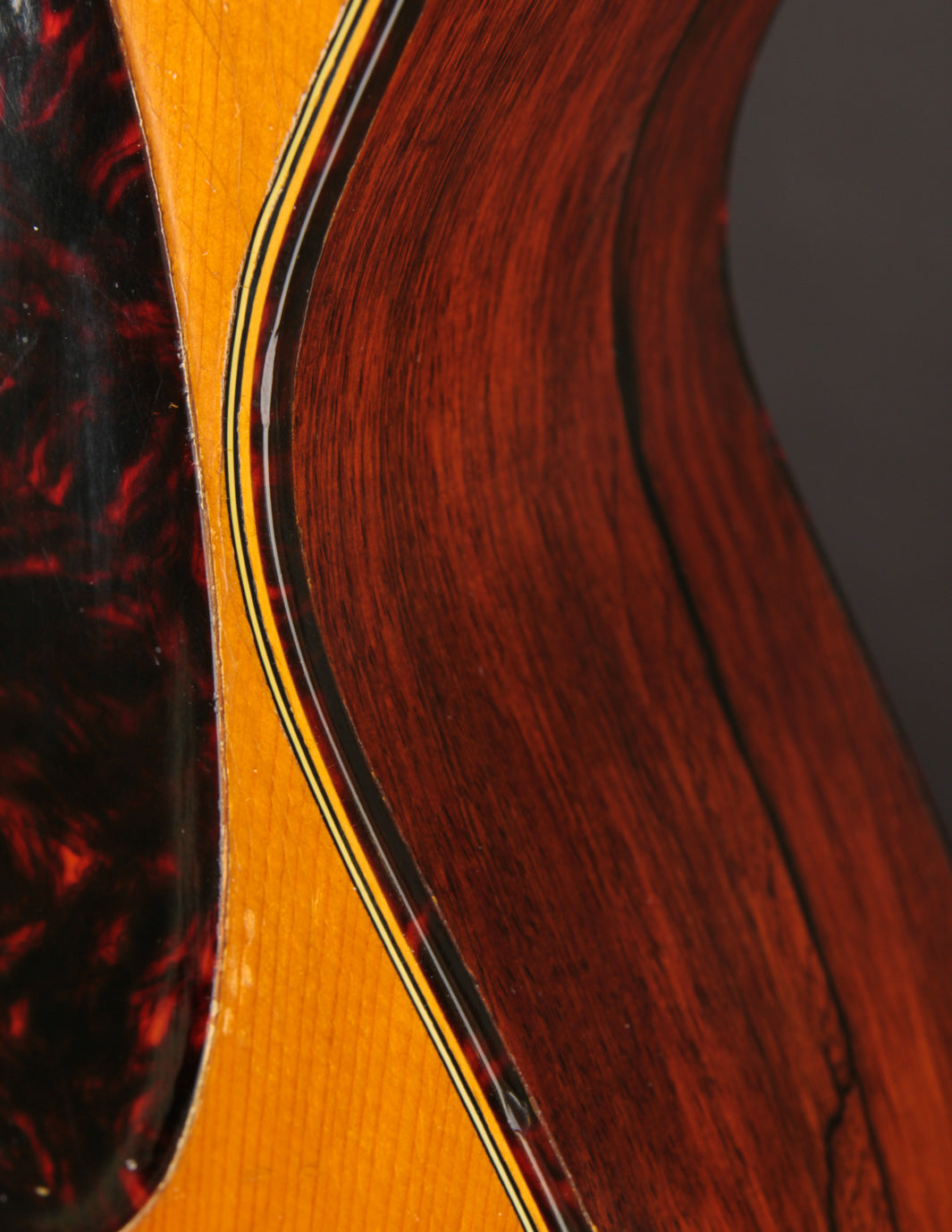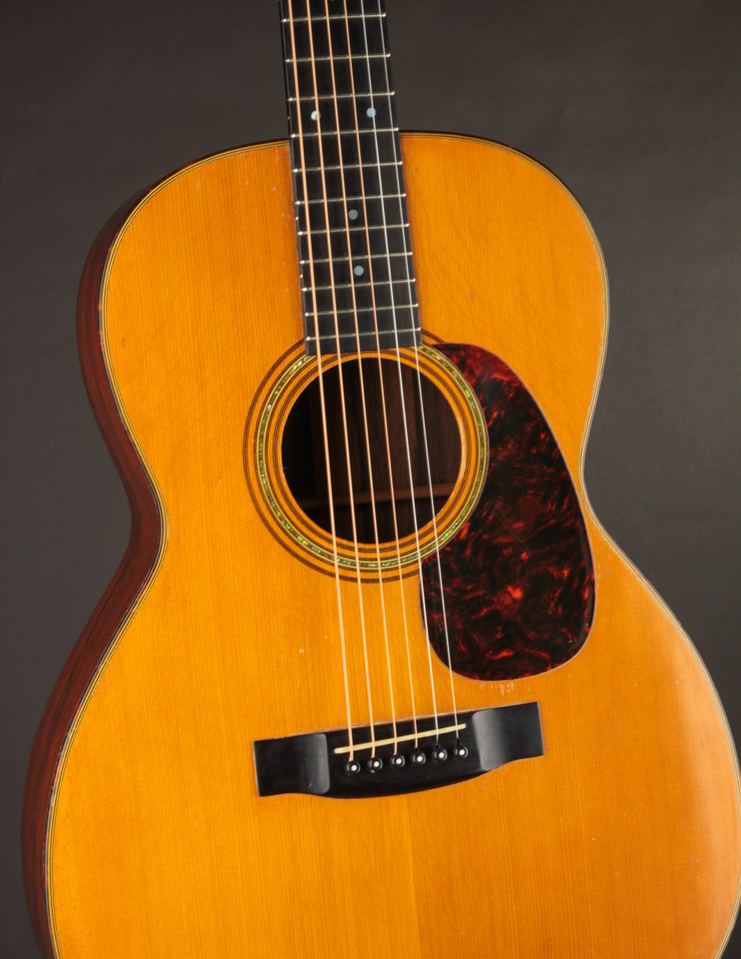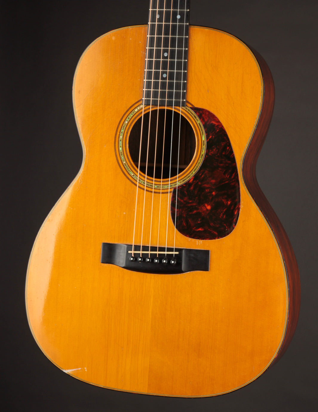 This exceptionally cool 1965 Martin 000-21S ("S" for "Special Order") has just come in for consignment! Martin wasn't making a 12-fret 000 in the 1960's, but produced this guitar as a special order for one of their retailers who ordered it as a gift for his wife. It features some absolutely stunning Brazilian Rosewood back & sides, and (perhaps even more stunning?) and old-stock Red Spruce top from the 1930's complete with pearl rosette. The aforementioned dealer also requested the couple's dog's name be stamped on the neck block; and sure enough, you'll find "Duende" branded there right next to ther serial number (200000). The guitar went back to Martin at some point for a headstock crack repair, at which time it was oversprayed. The original bridge has been replaced as well. Other than that, the instrument remains in lovely condition and plays nicely up and down the neck. The sound is wonderful ~ big, powerful, and open, with a depth of tone one simply does not normally hear in a 1960's Martin. Price includes non-original Martin hard case. On consignment; expedited shipping required.