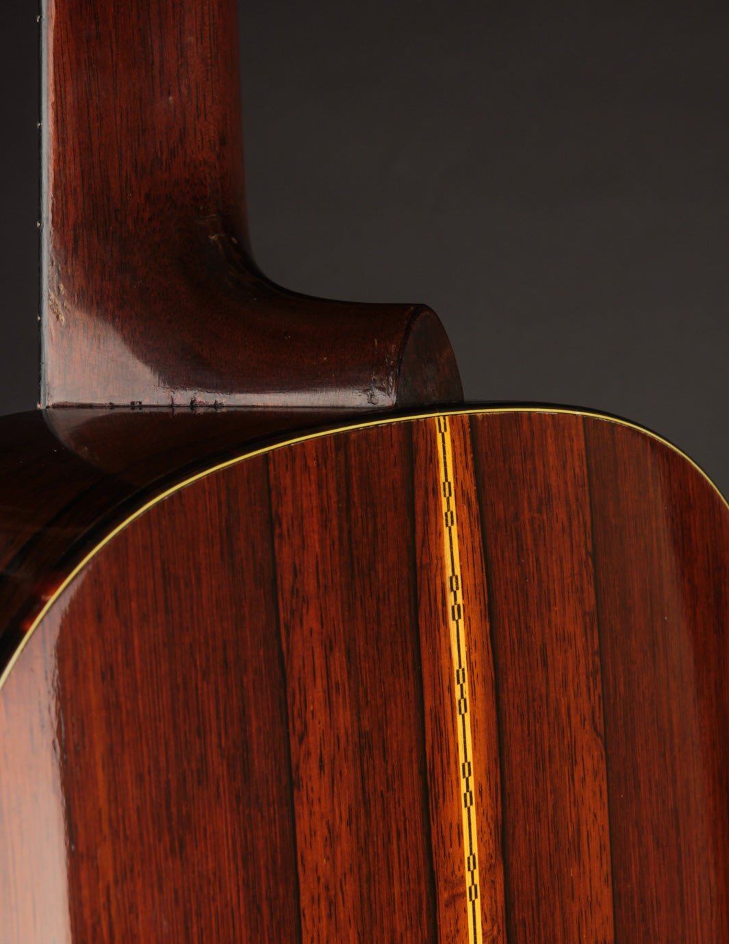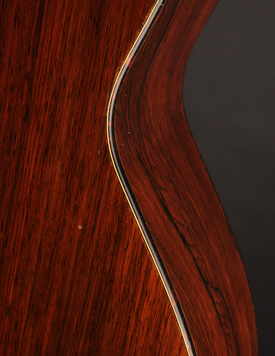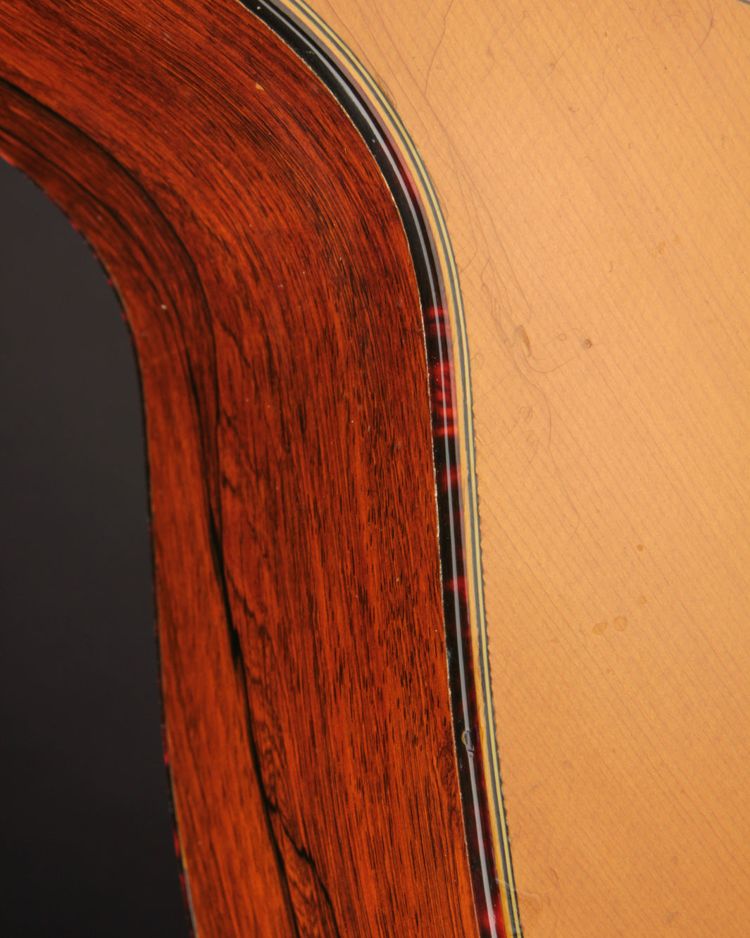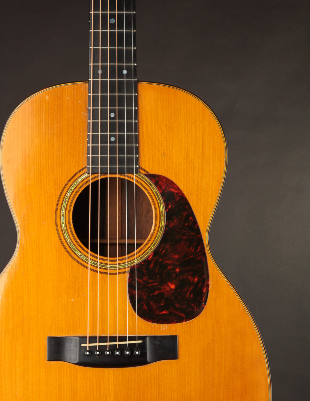This exceptionally cool 1965 Martin 000-21S ("S" for "Special Order") has just come in for consignment! Martin wasn't making a 12-fret 000 in the 1960's, but produced this guitar as a special order for one of their retailers who ordered it as a gift for his wife. It features some absolutely stunning Brazilian Rosewood back & sides, and (perhaps even more stunning?) and old-stock Red Spruce top from the 1930's complete with pearl rosette. The aforementioned dealer also requested the couple's dog's name be stamped on the neck block; and sure enough, you'll find "Duende" branded there right next to ther serial number (200000). The guitar went back to Martin at some point for a headstock crack repair, at which time it was oversprayed. The original bridge has been replaced as well. Other than that, the instrument remains in lovely condition and plays nicely up and down the neck. The sound is wonderful ~ big, powerful, and open, with a depth of tone one simply does not normally hear in a 1960's Martin. Price includes non-original Martin hard case. On consignment; expedited shipping required.