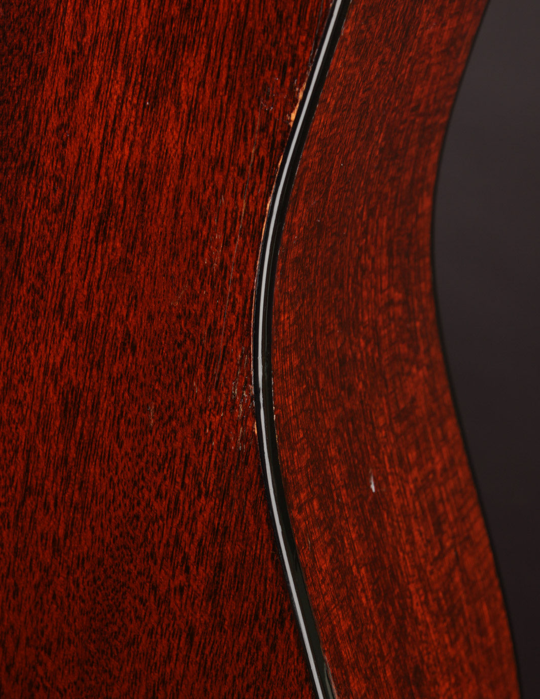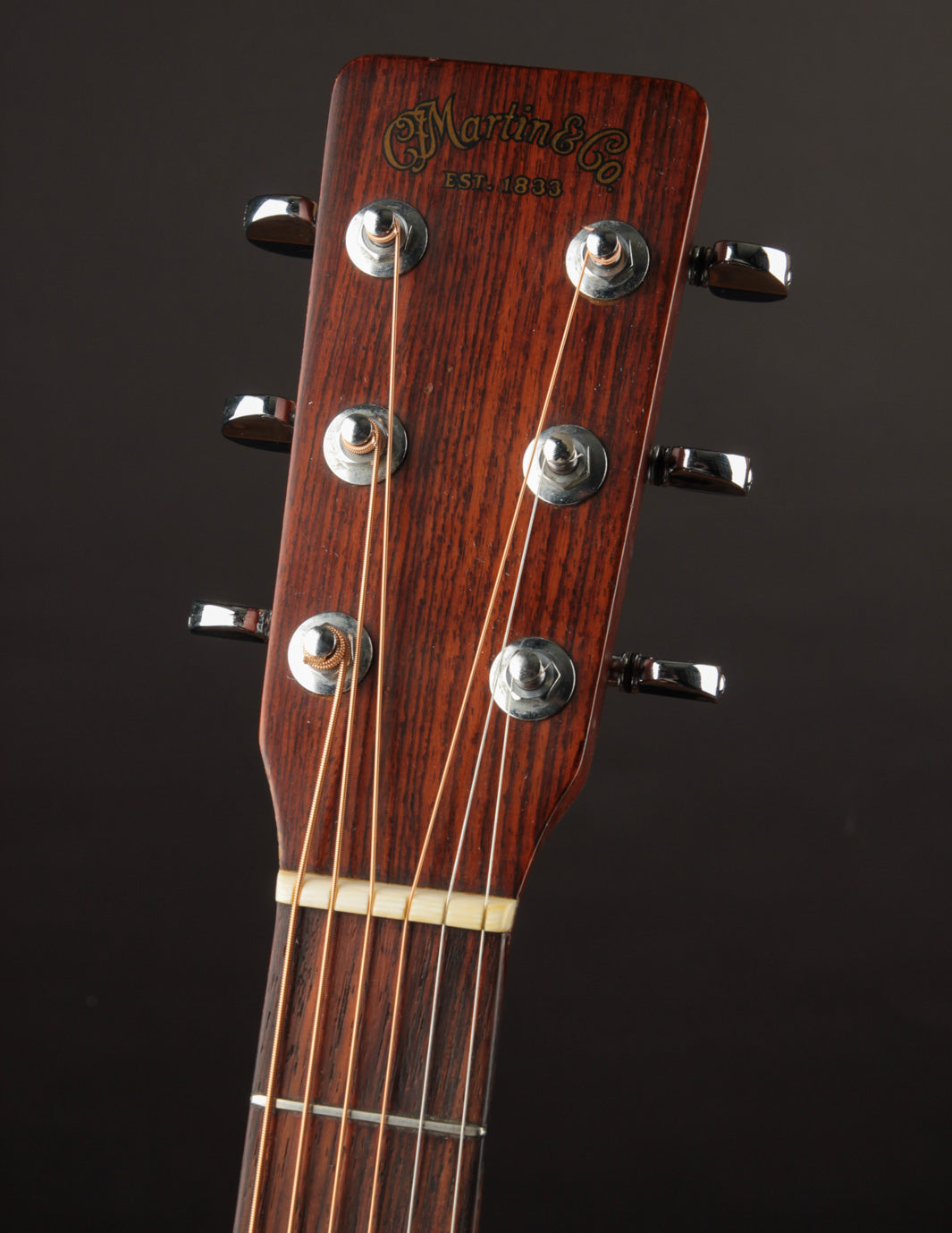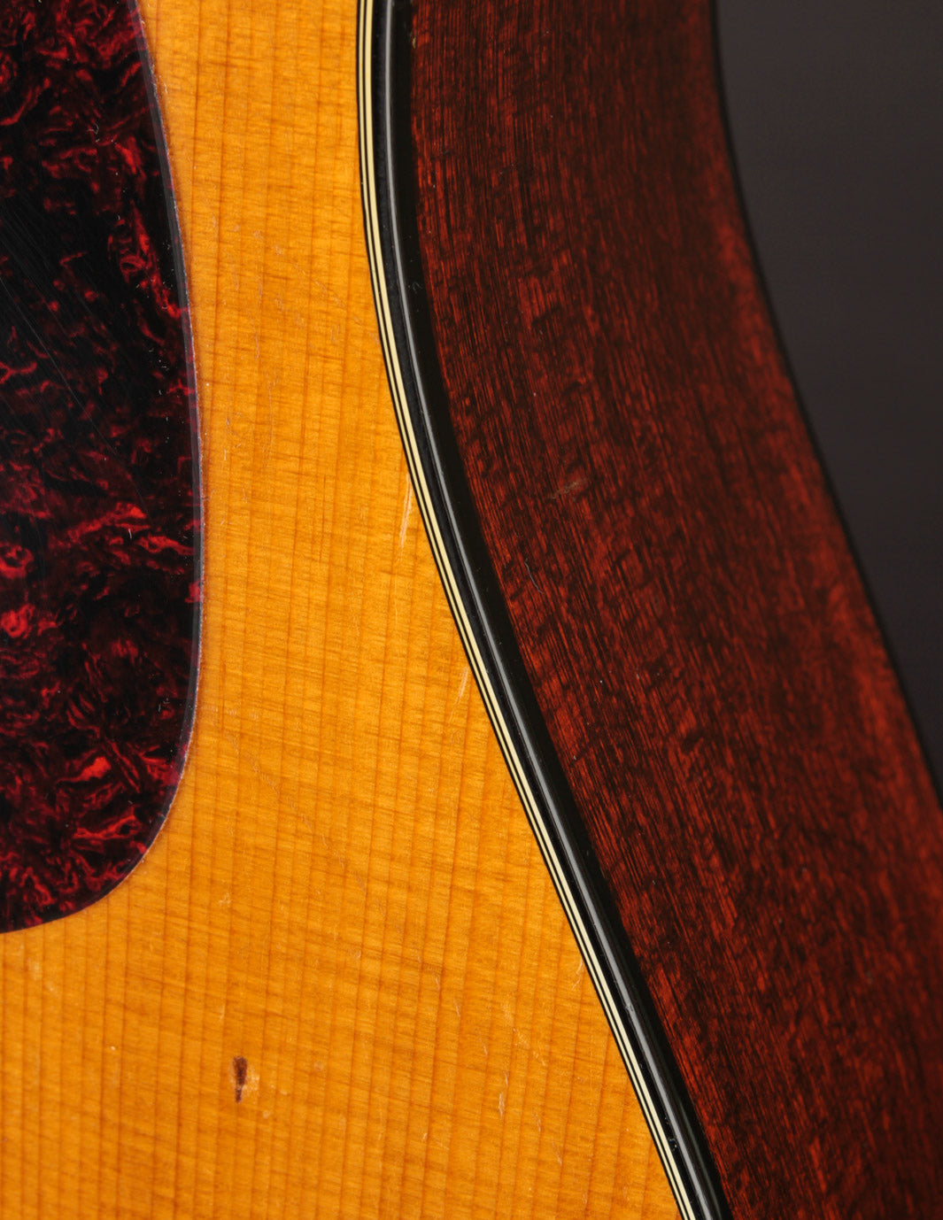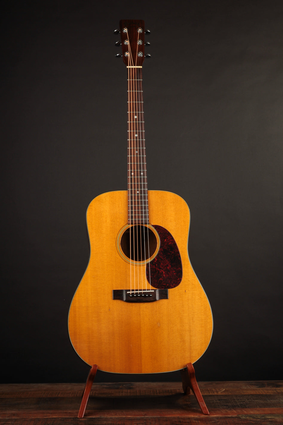 This guitar has had a well-done neck reset in the recent past, and it sets up beautifully with stock Martin saddle height and medium gauge strings. The pickguard has been replaced, and the finish has been buffed, making it appear a bit glossier than it otherwise might appear. There is some light finish crazing, and a smattering of dings and scrapes, but no cracks and a sound structure. Priced with non-original hardshell case.