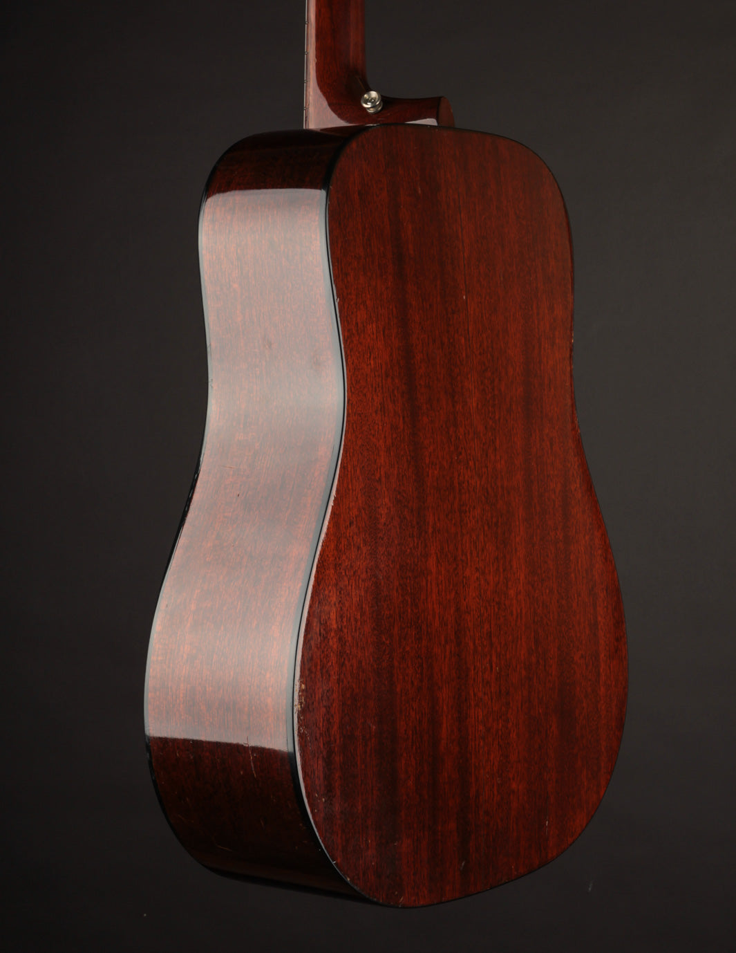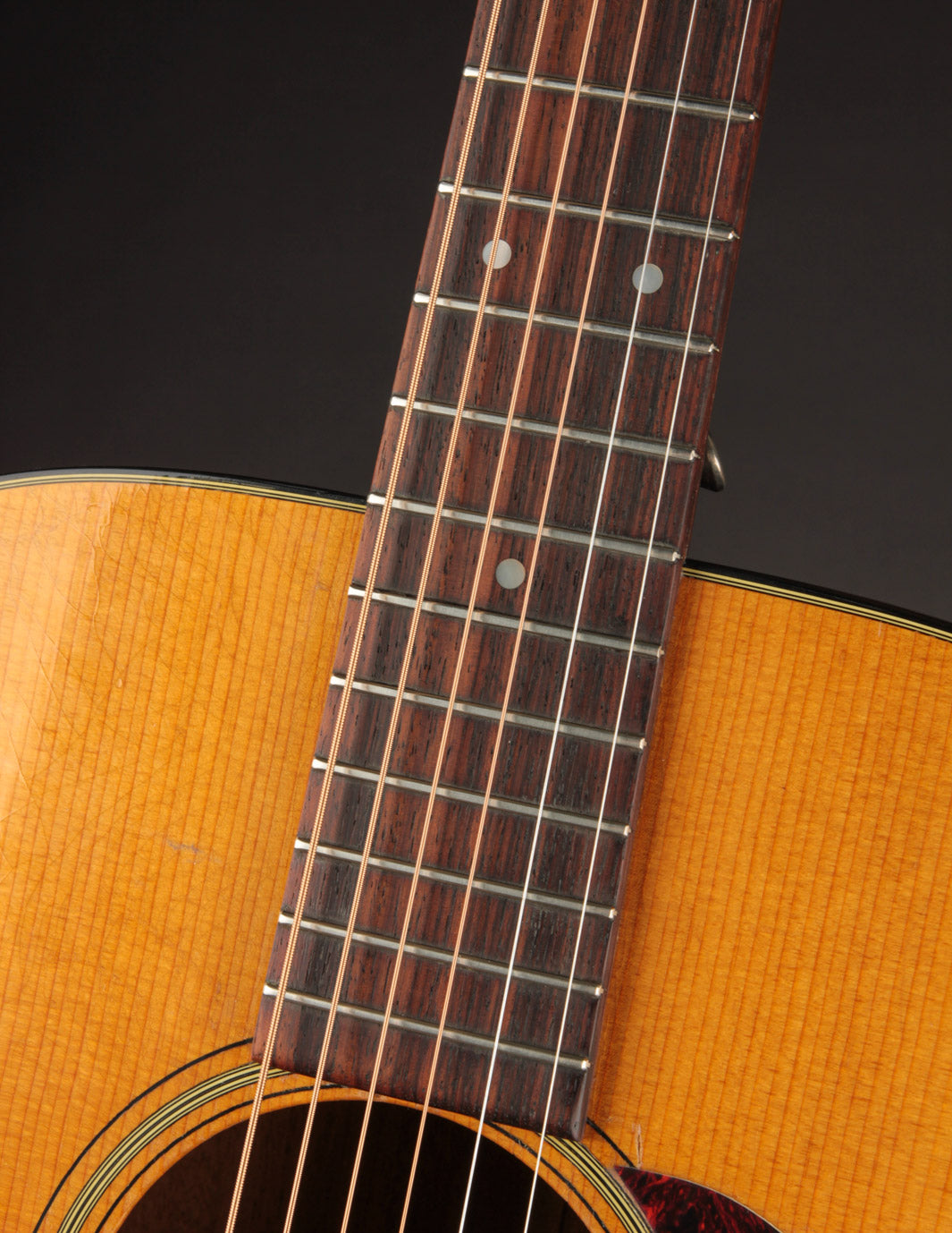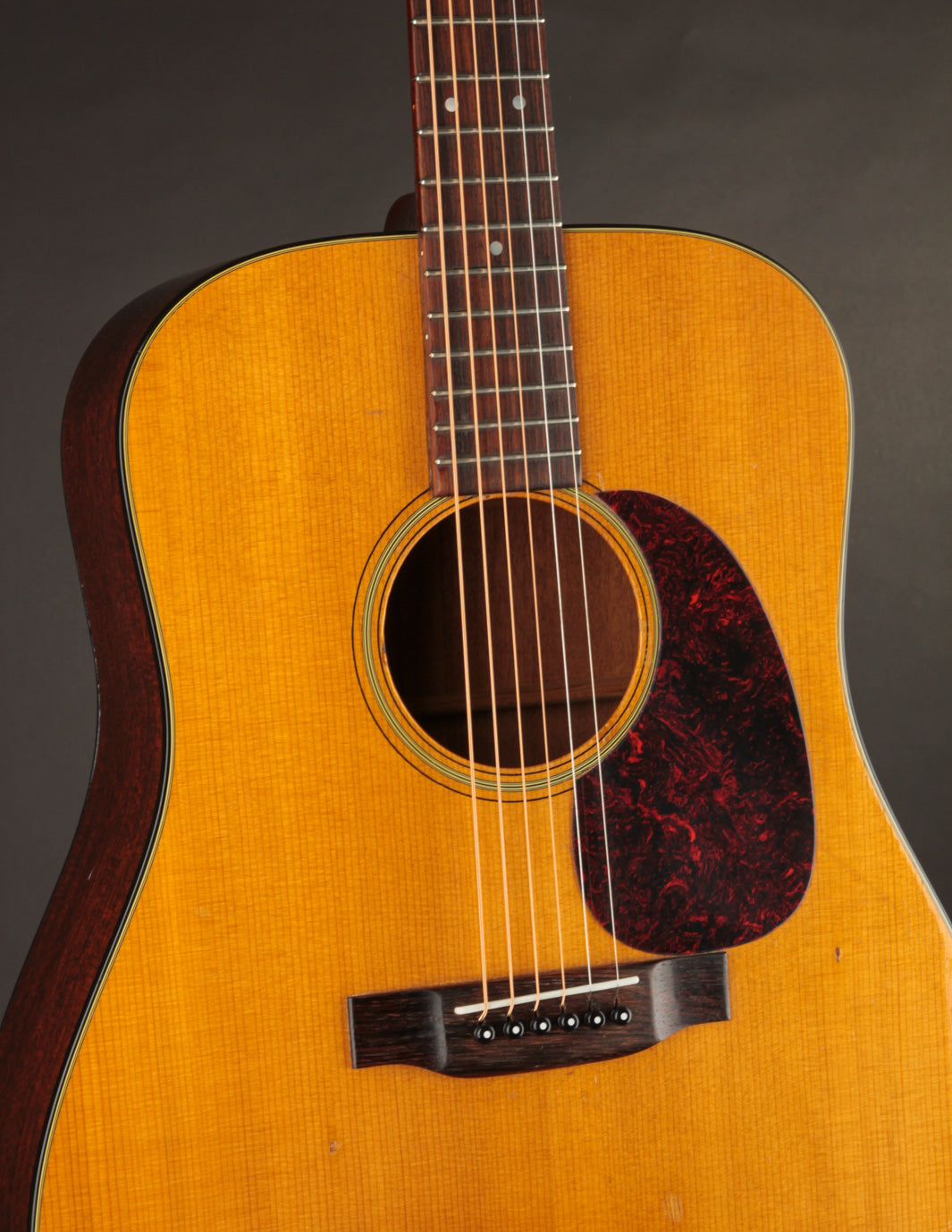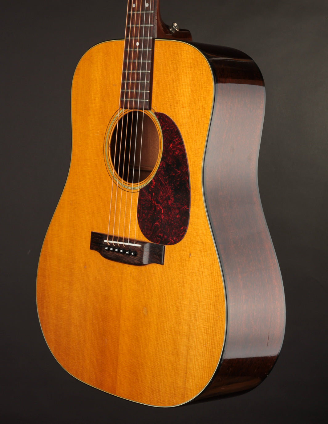 This guitar has had a well-done neck reset in the recent past, and it sets up beautifully with stock Martin saddle height and medium gauge strings. The pickguard has been replaced, and the finish has been buffed, making it appear a bit glossier than it otherwise might appear. There is some light finish crazing, and a smattering of dings and scrapes, but no cracks and a sound structure. Priced with non-original hardshell case.