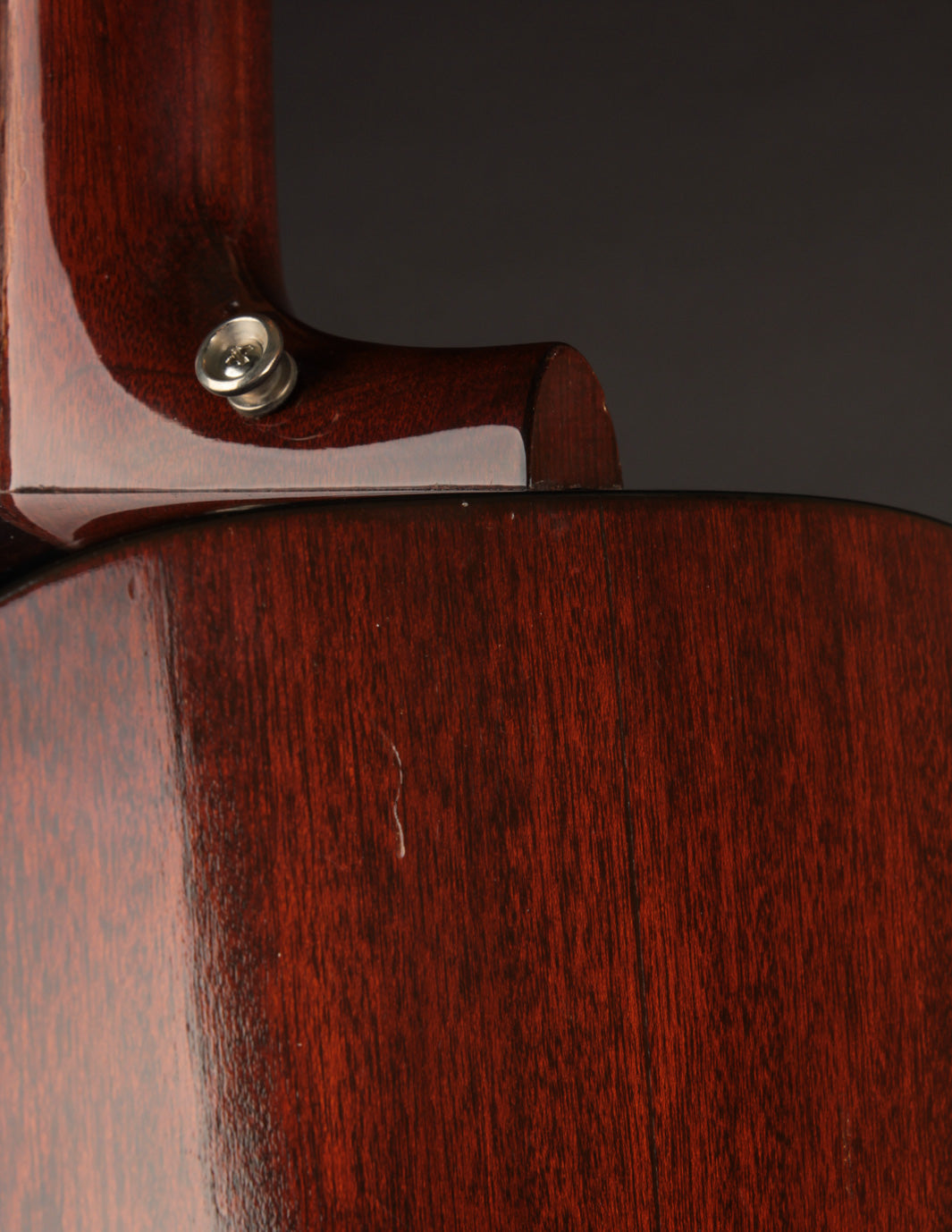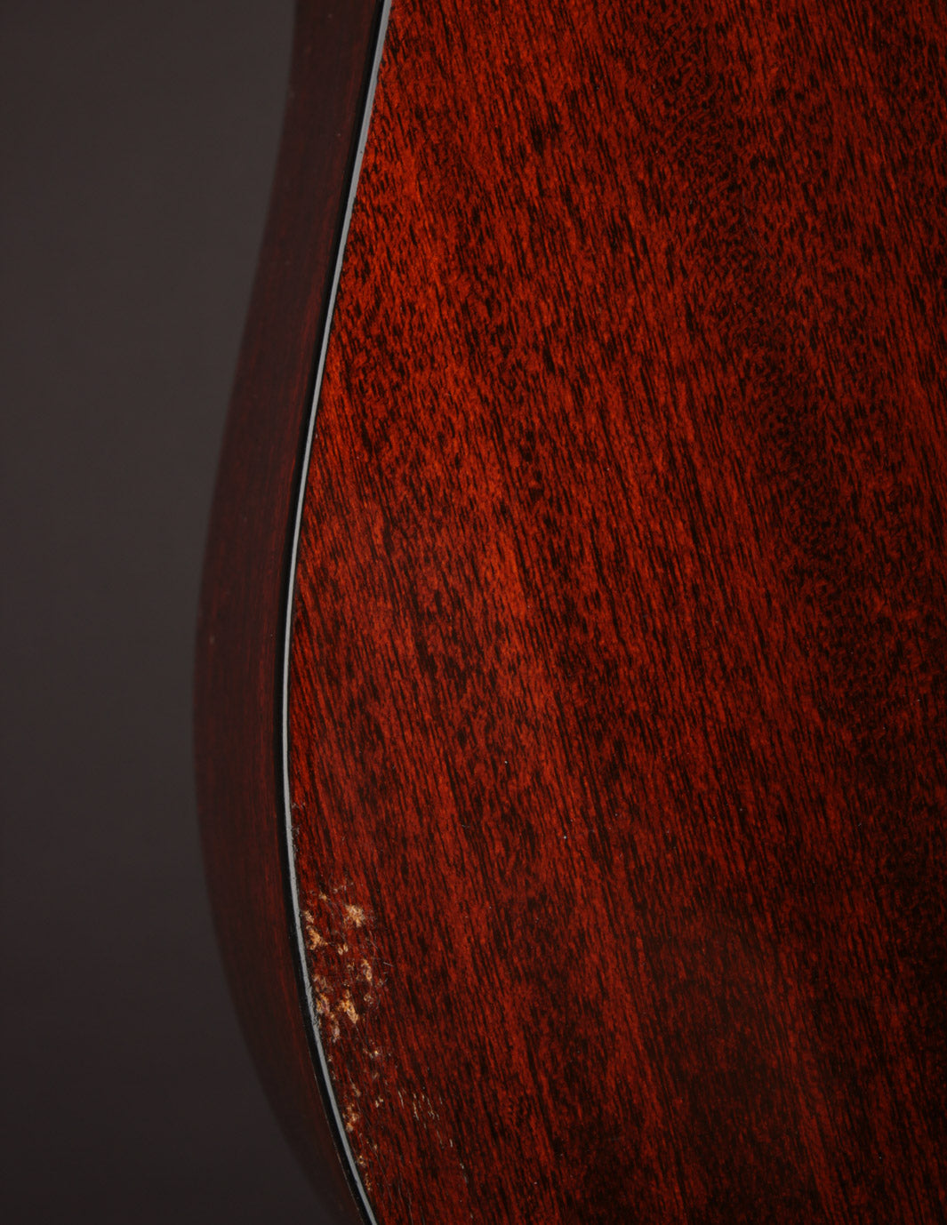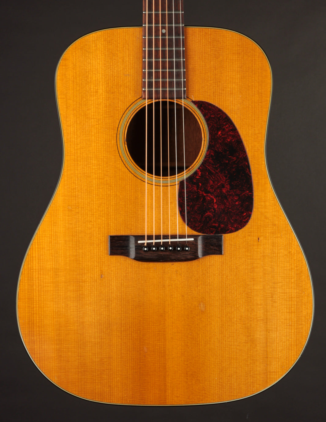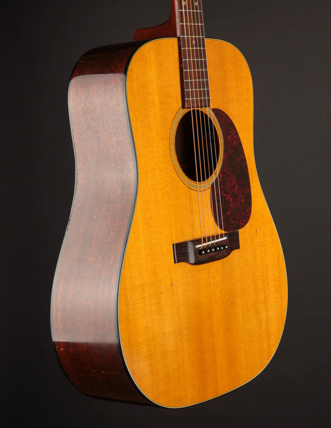 This guitar has had a well-done neck reset in the recent past, and it sets up beautifully with stock Martin saddle height and medium gauge strings. The pickguard has been replaced, and the finish has been buffed, making it appear a bit glossier than it otherwise might appear. There is some light finish crazing, and a smattering of dings and scrapes, but no cracks and a sound structure. Priced with non-original hardshell case.