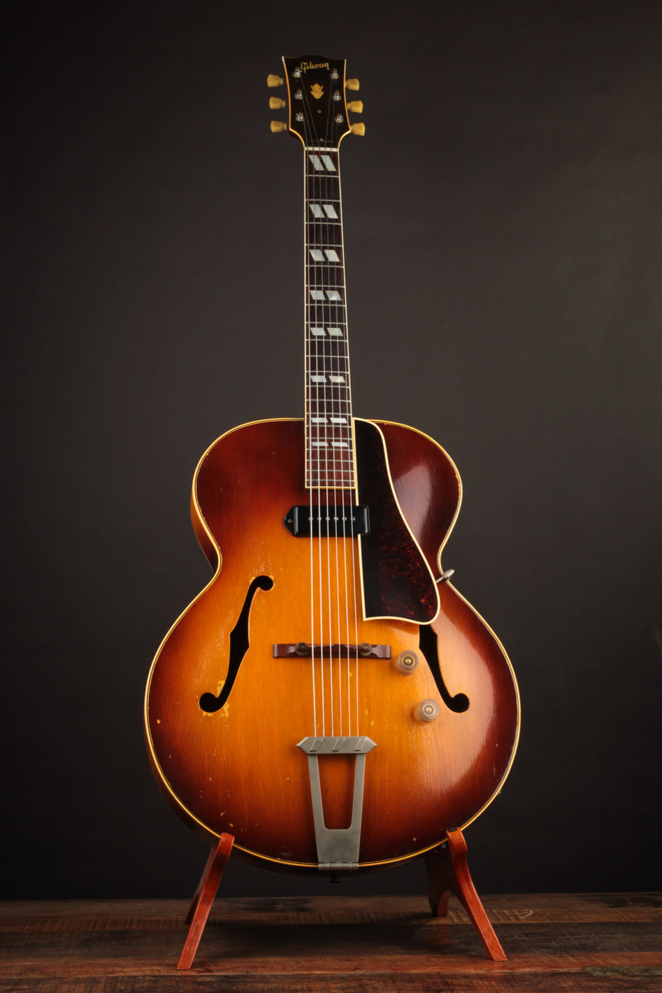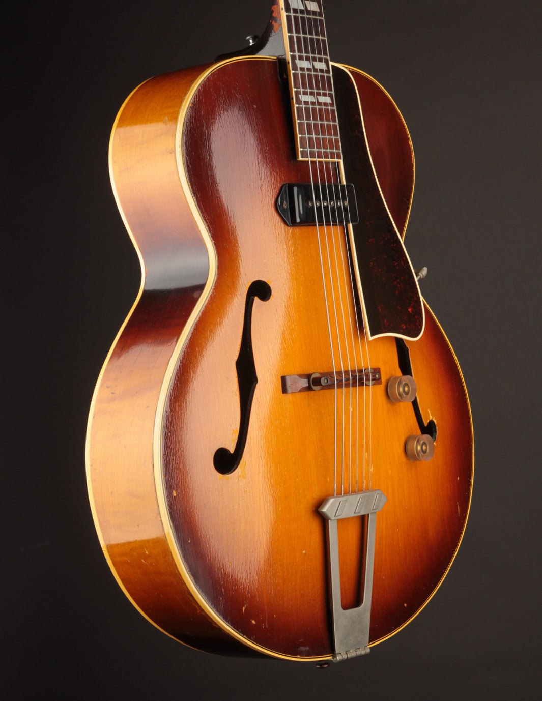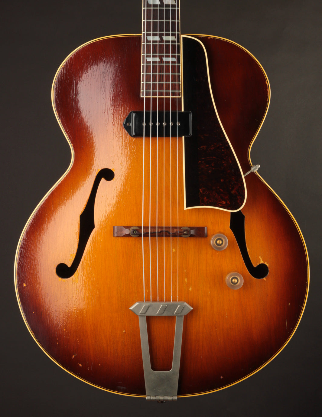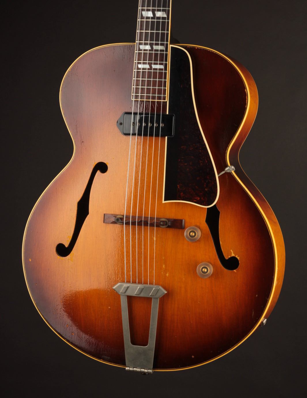 This post-war 17" electric archtop was Gibson's top model of the period, paralleled by the fully acoustic L-7. It features a single P-90 pickup set into a laminated Maple body, single volume and tone controls, and a floating Rosewood bridge with "shield" tailpiece.