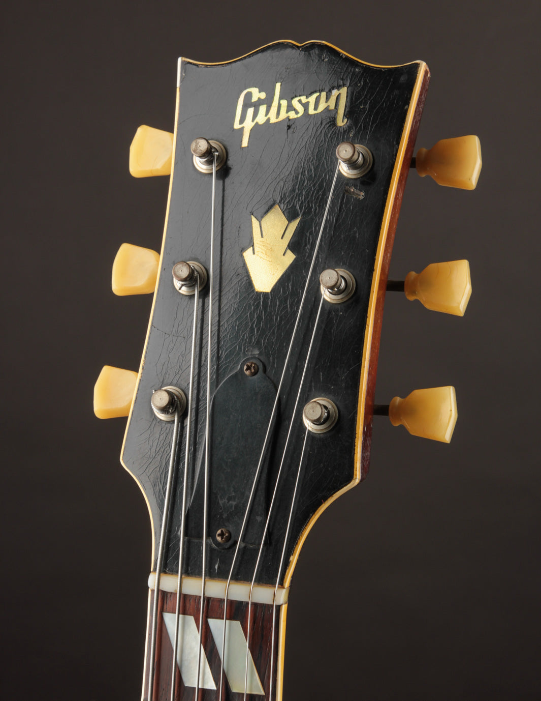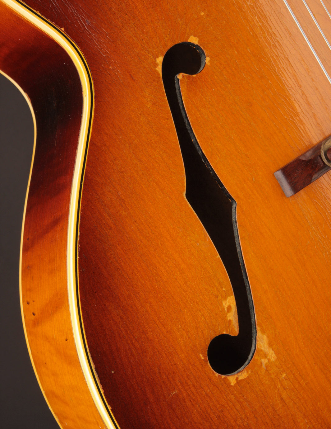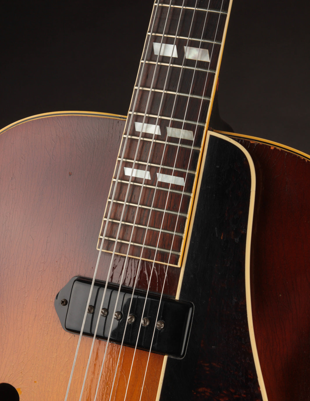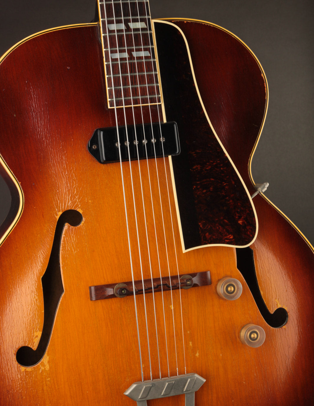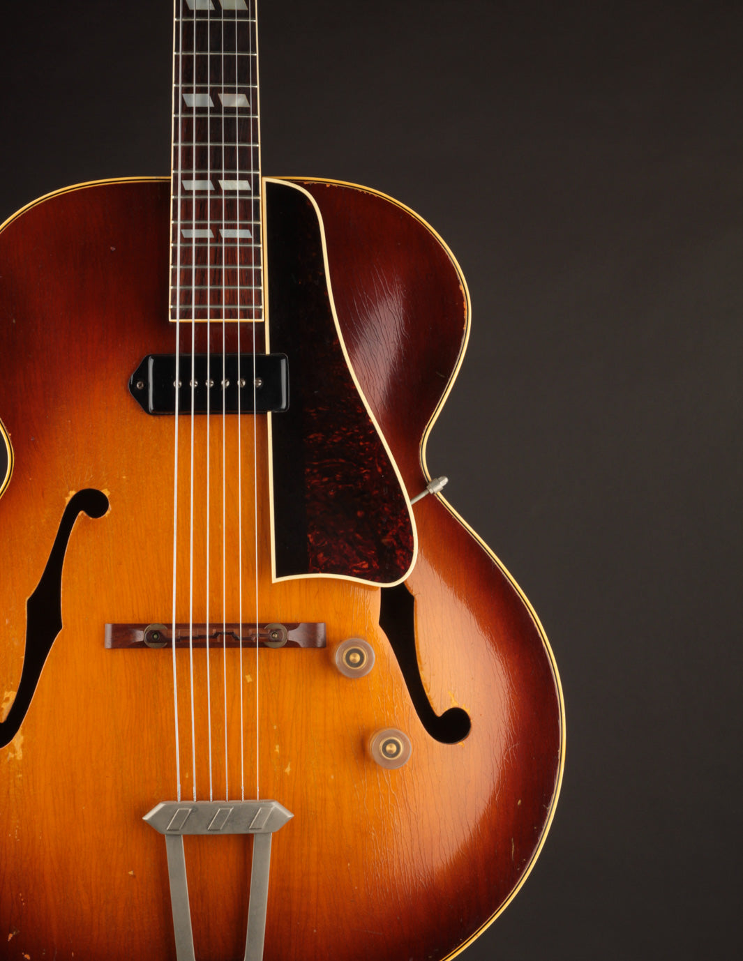 This post-war 17" electric archtop was Gibson's top model of the period, paralleled by the fully acoustic L-7. It features a single P-90 pickup set into a laminated Maple body, single volume and tone controls, and a floating Rosewood bridge with "shield" tailpiece.