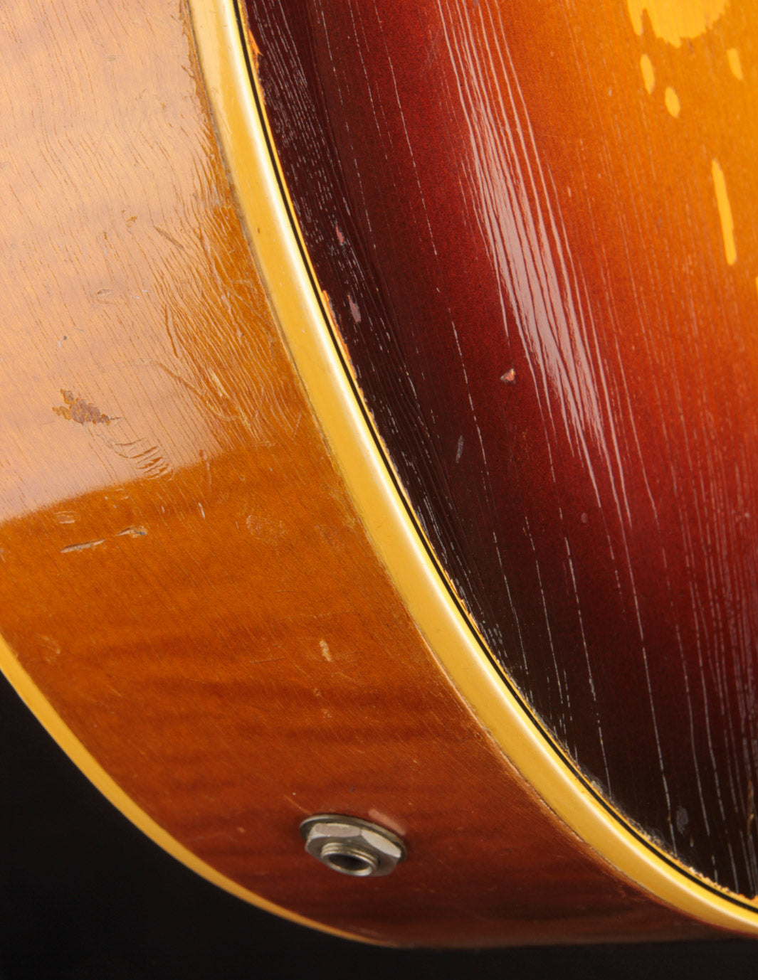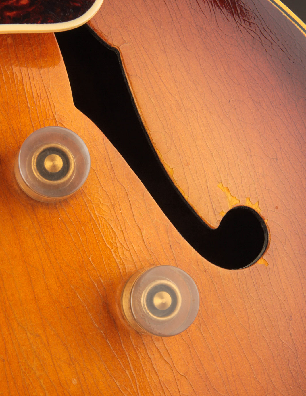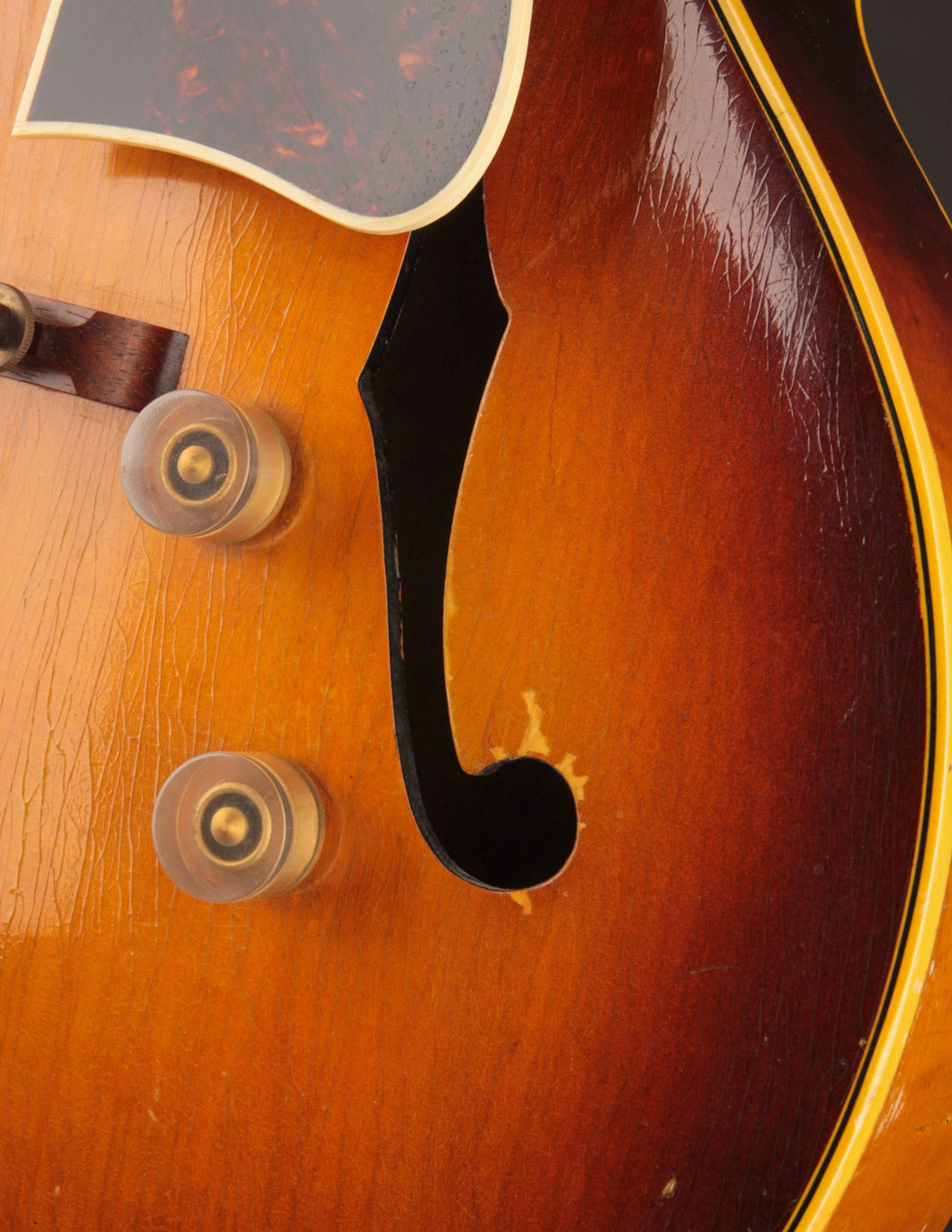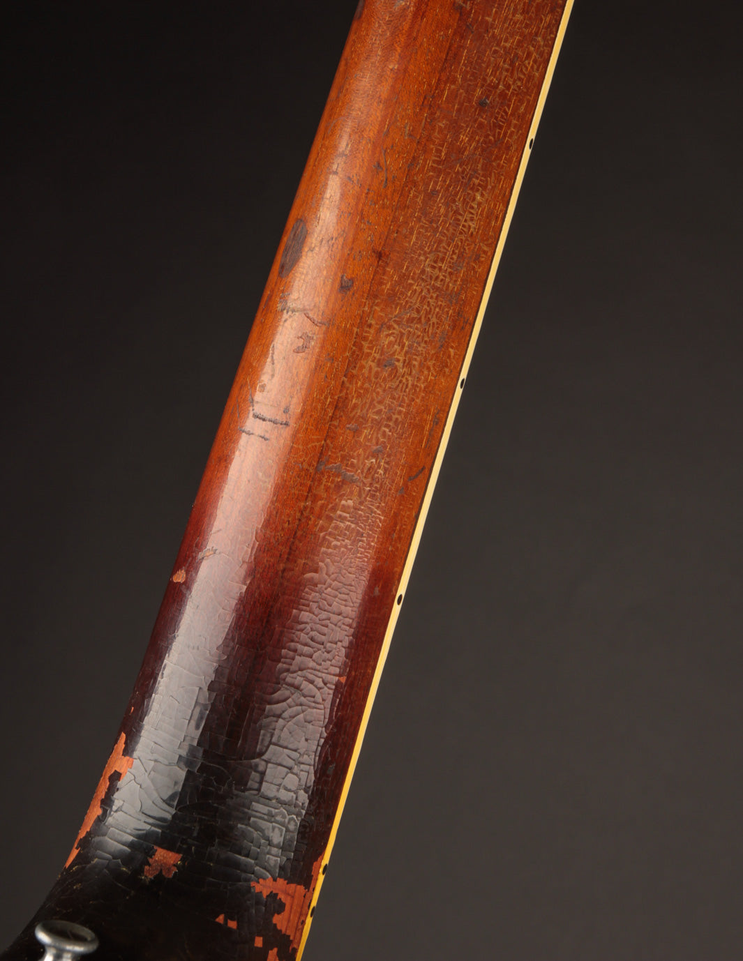 The Mahogany neck has a very comfortable round C profile that measures closer to the neck shapes found on later 50s electrics, which is quite welcome here. It excels as a rhythm instrument but affords easy transitions across the fingerboard for melodic work. The original small fretwire is in remarkably great shape, allowing for a very comfortable and easy playing experience.