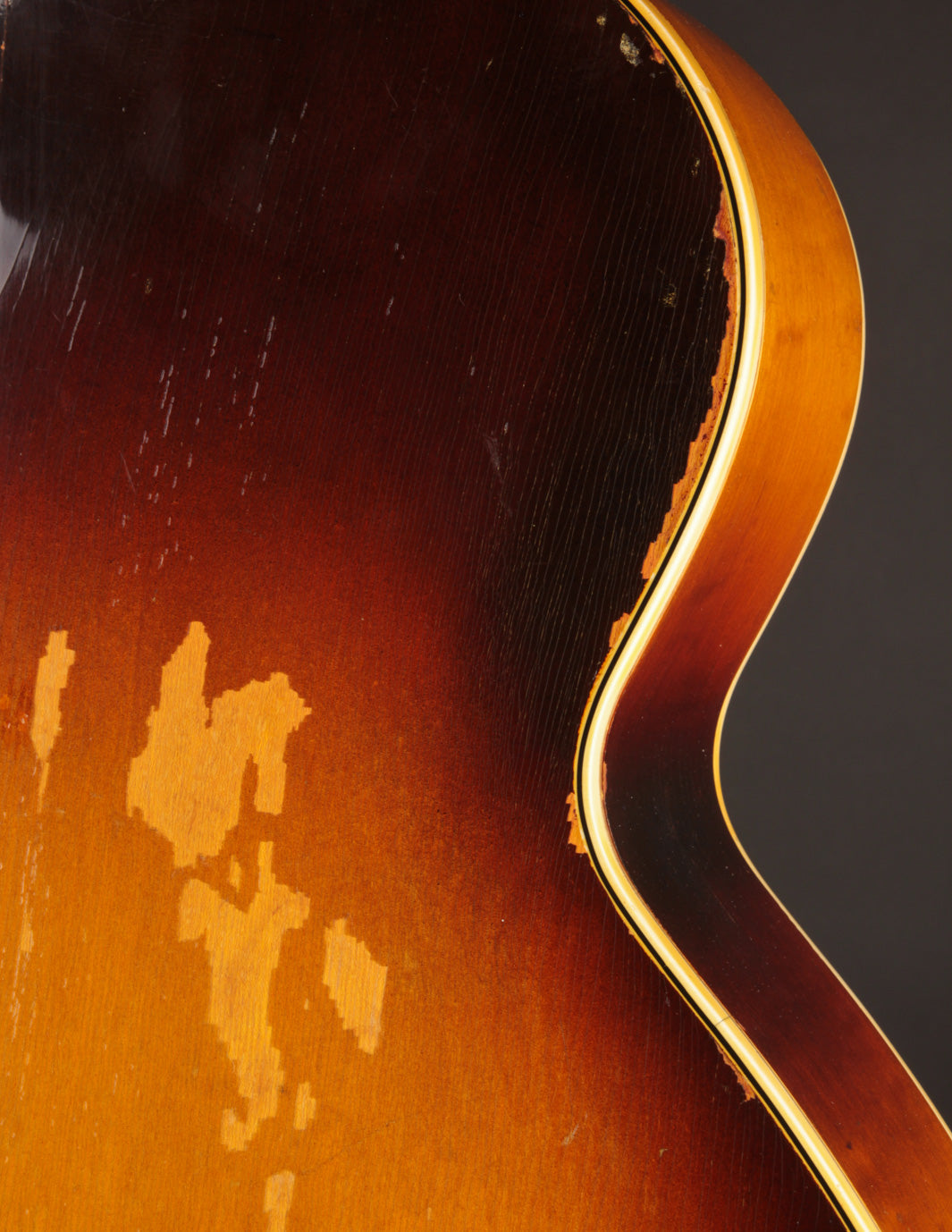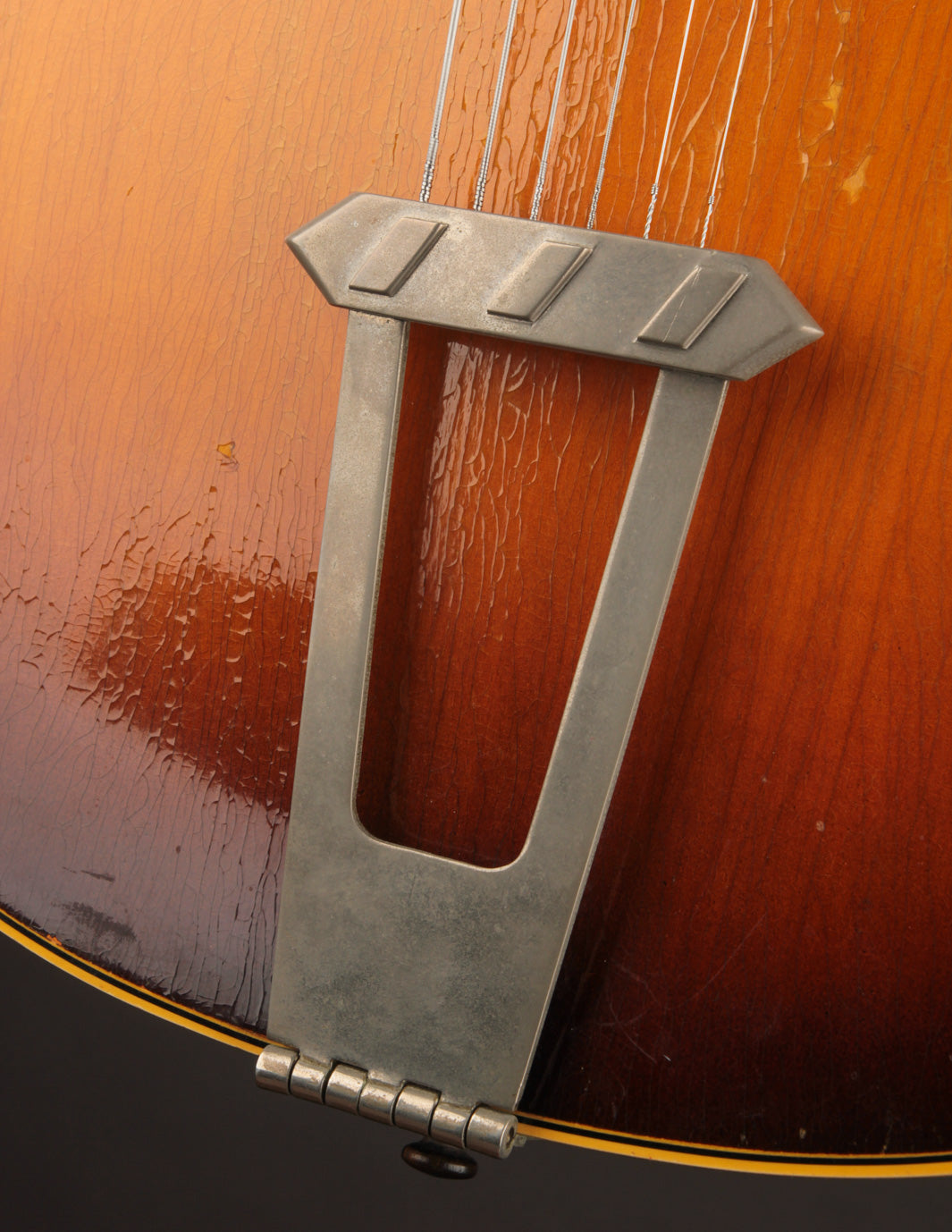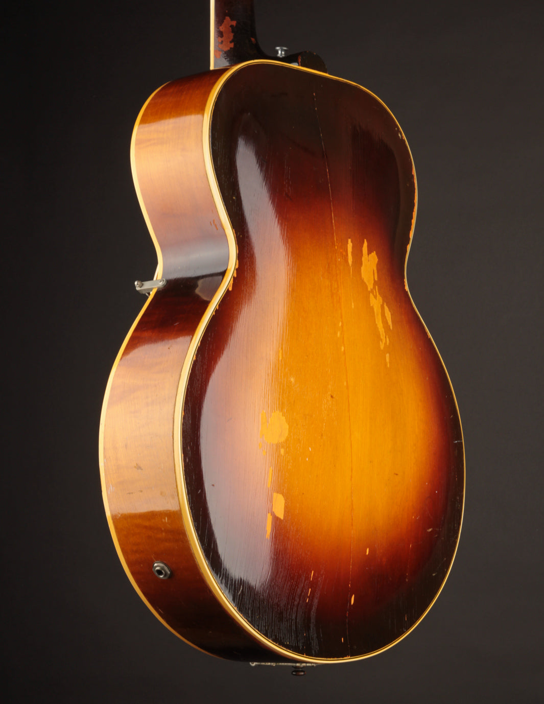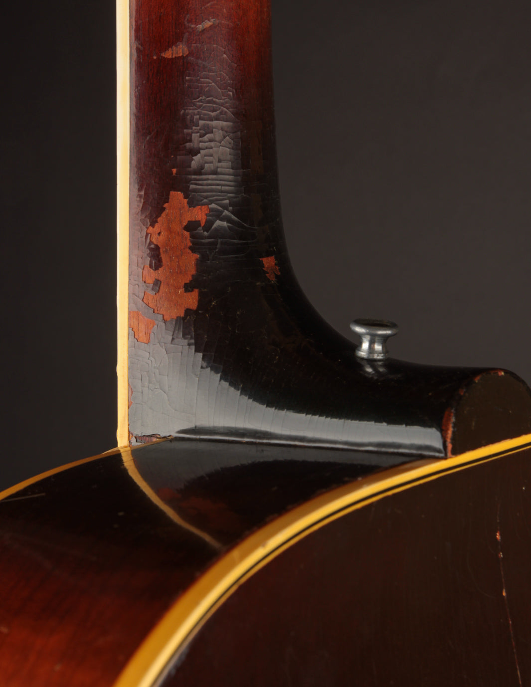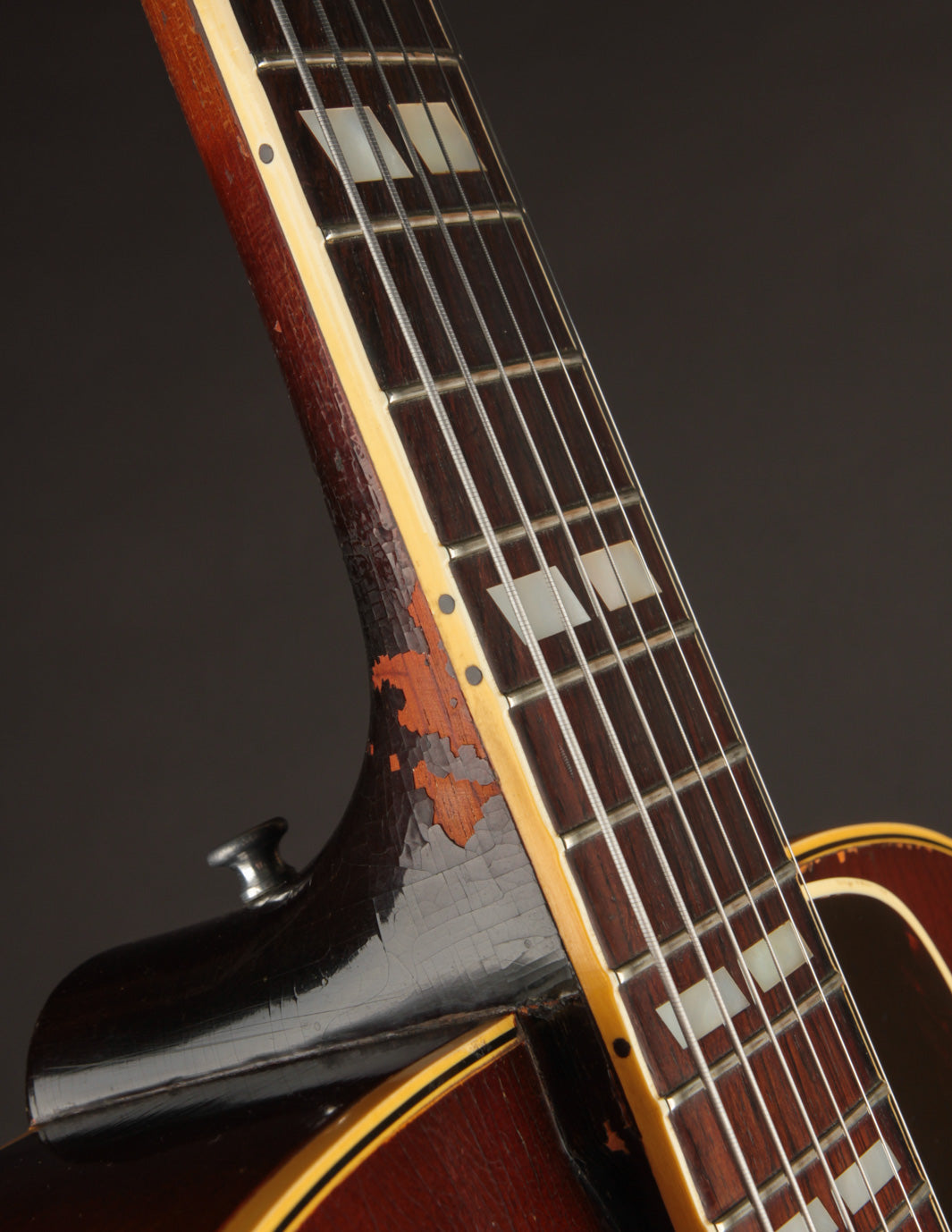 The guitar's finish remains mostly original, save for a few areas of touch-up on the back at the center seam and a small area on the rear lower bout. There are various chips, dings, scratches, and scuffs to be expected from an 80 year old instrument, but overall condition is quite nice. The most notable repair is of a partially broken truss rod. The rod was repaired by local late guitar repair legend Jim Mouradian, who threaded a fender-style truss rod nut from the headstock channel back into the original rod. It's fully functional, and while it doesn't necessarily look the part of an original Gibson, the truss rod cover does its job well, and covers up what would otherwise be a... unique looking modification. Importantly, the neck is structurally intact. A strap button was also added to the heel.