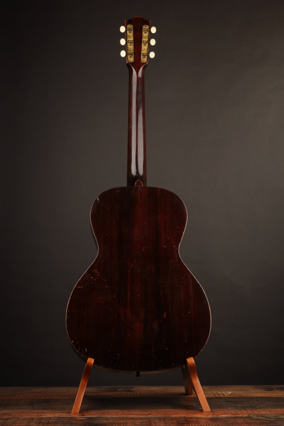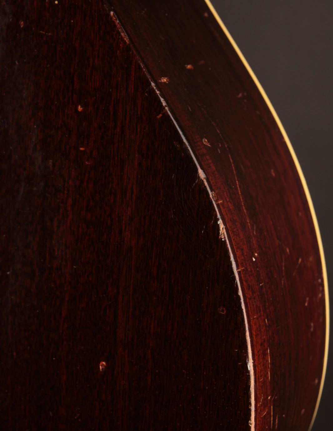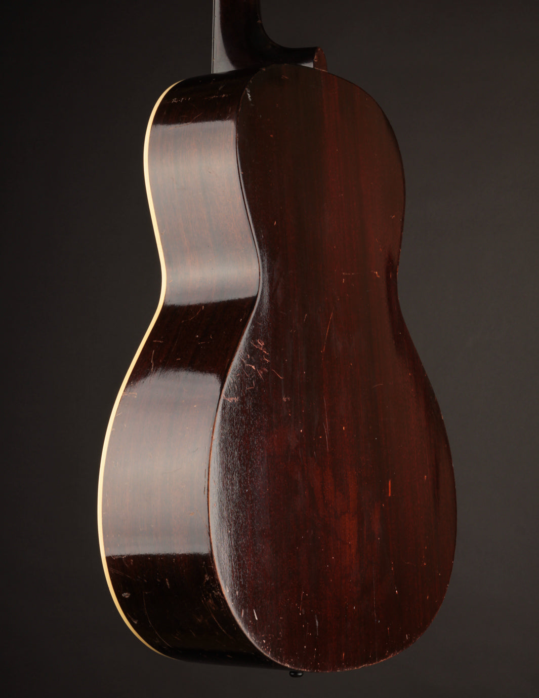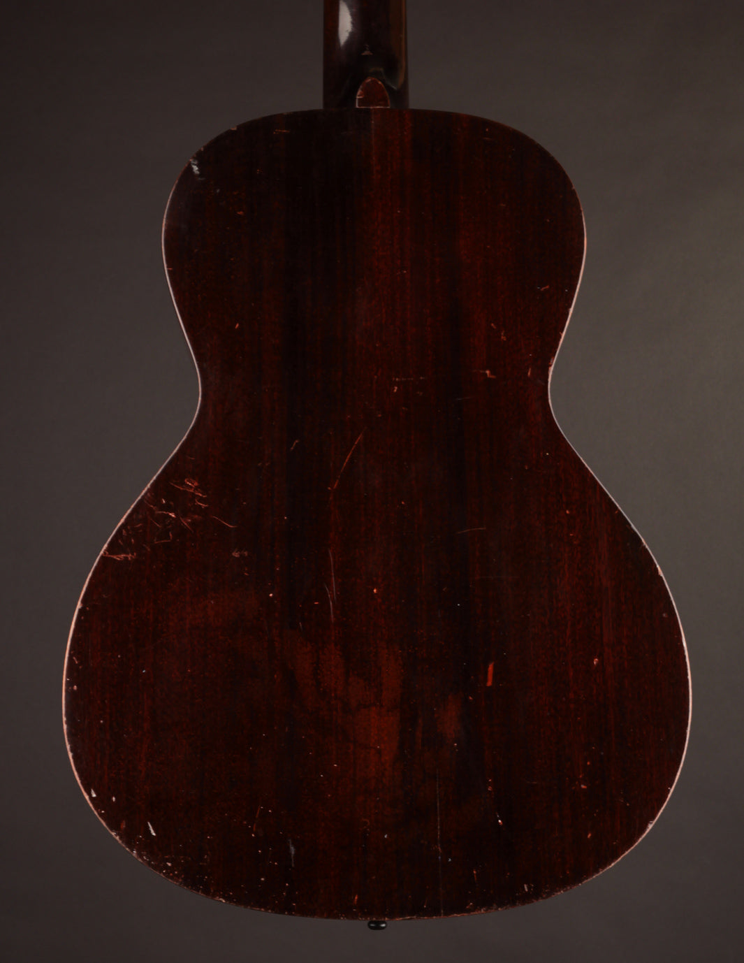 We'd call the overall condition "very good" for a 1930's guitar. There's plenty of expected lacquer checking and play / handling wear in the form of scratches, scrapes, dings, etc. There's one small back crack, which has been glued and stabilized. Our shop performed a neck reset; and the action is set at the standard 3/32" (bass side) and 2/32" (treble side). Playability is easy, no matter the style; and the full, V-shaped neck feels great in the hand. Priced with non-original, though cool in its own right, 1960's hardshell case.