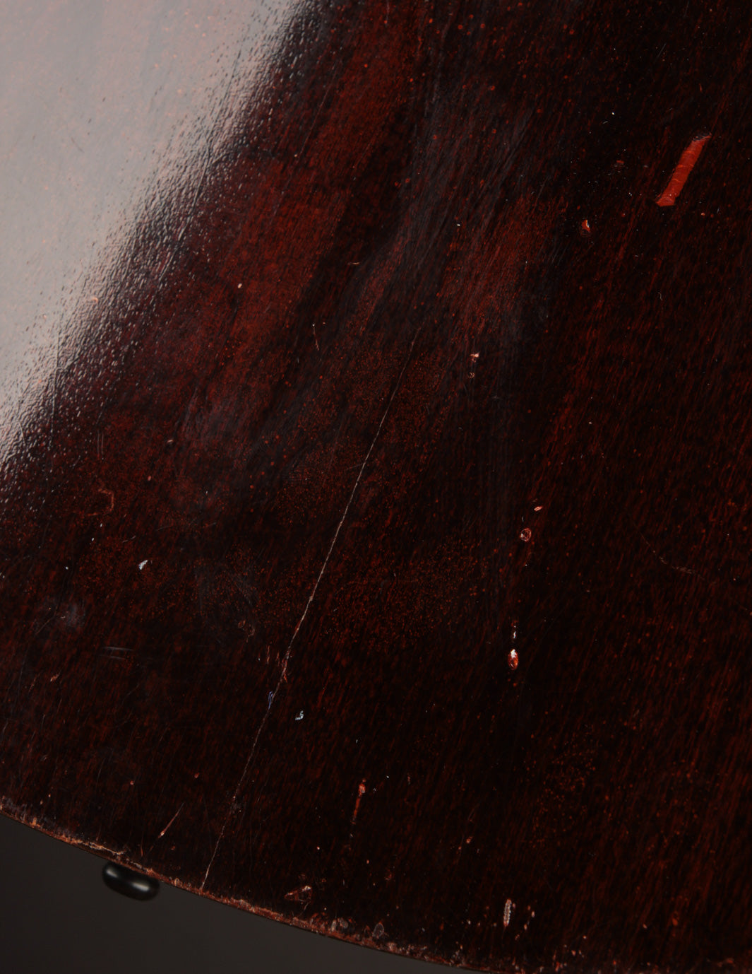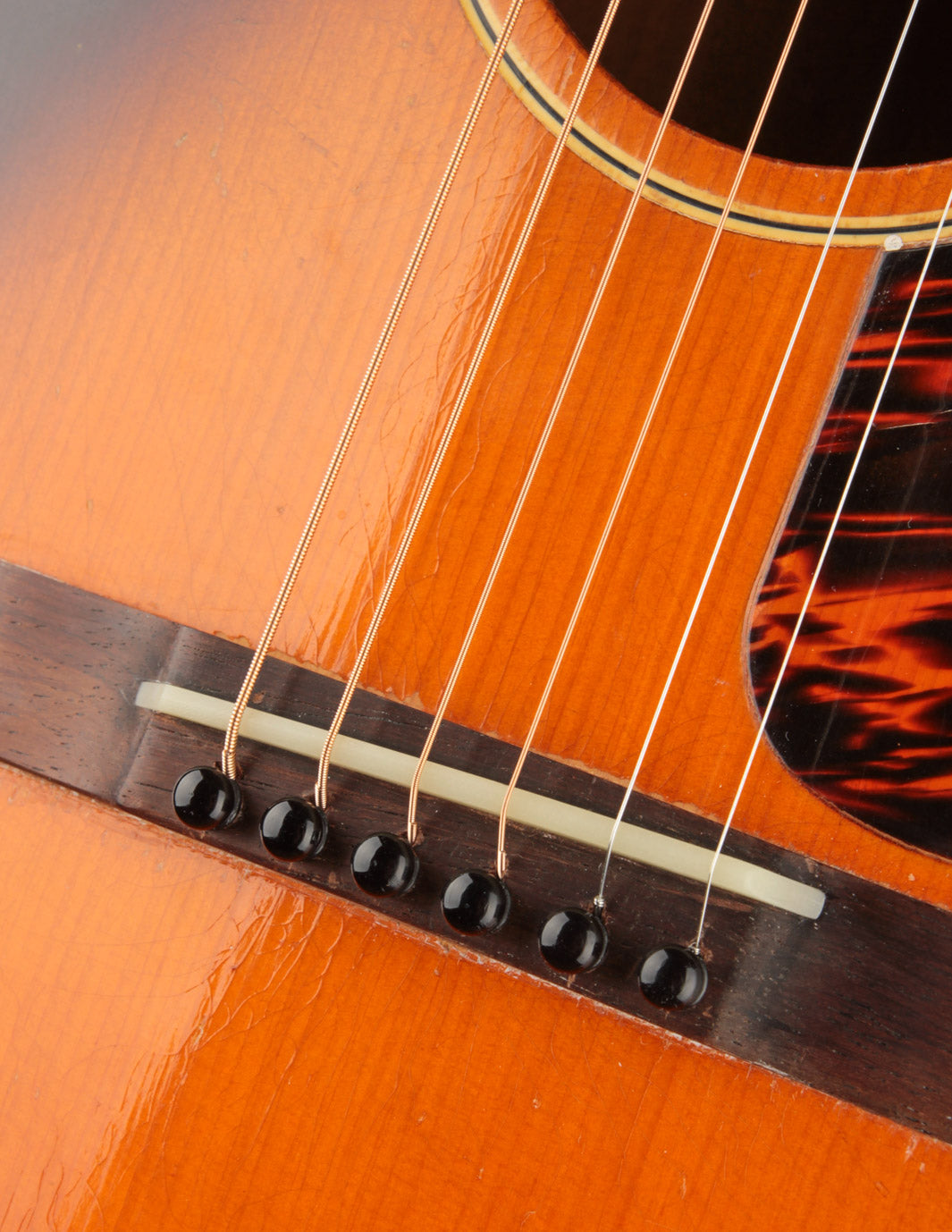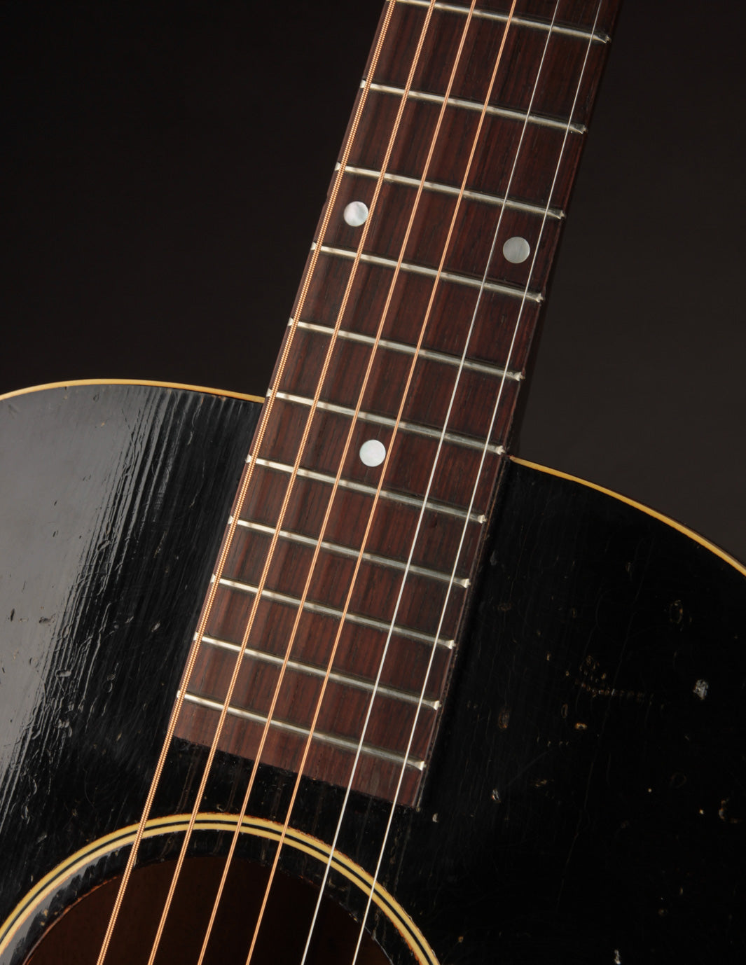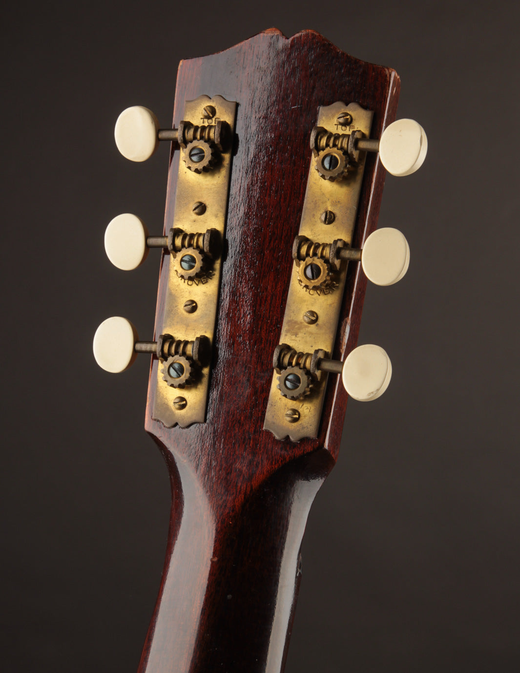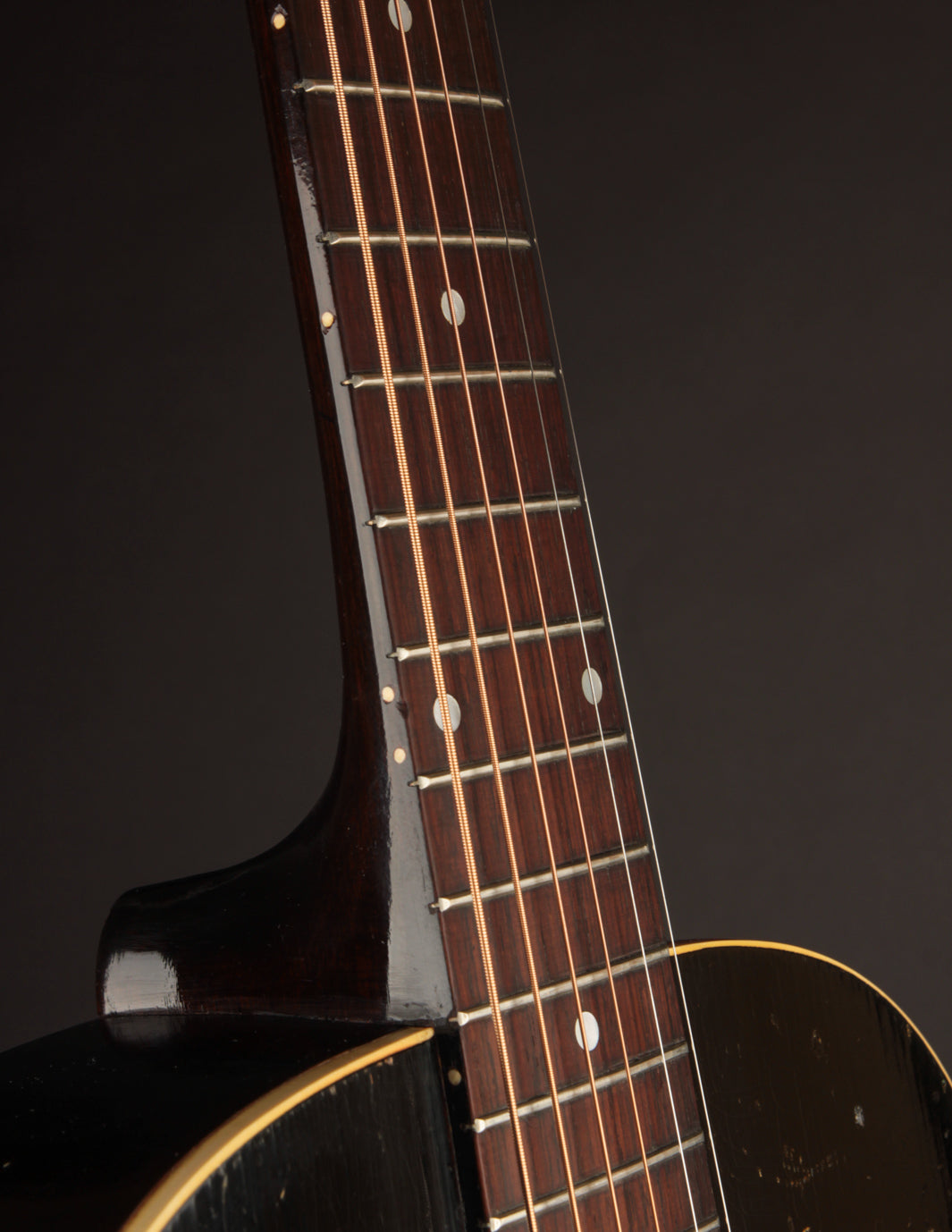 We'd call the overall condition "very good" for a 1930's guitar. There's plenty of expected lacquer checking and play / handling wear in the form of scratches, scrapes, dings, etc. There's one small back crack, which has been glued and stabilized. Our shop performed a neck reset; and the action is set at the standard 3/32" (bass side) and 2/32" (treble side). Playability is easy, no matter the style; and the full, V-shaped neck feels great in the hand. Priced with non-original, though cool in its own right, 1960's hardshell case.