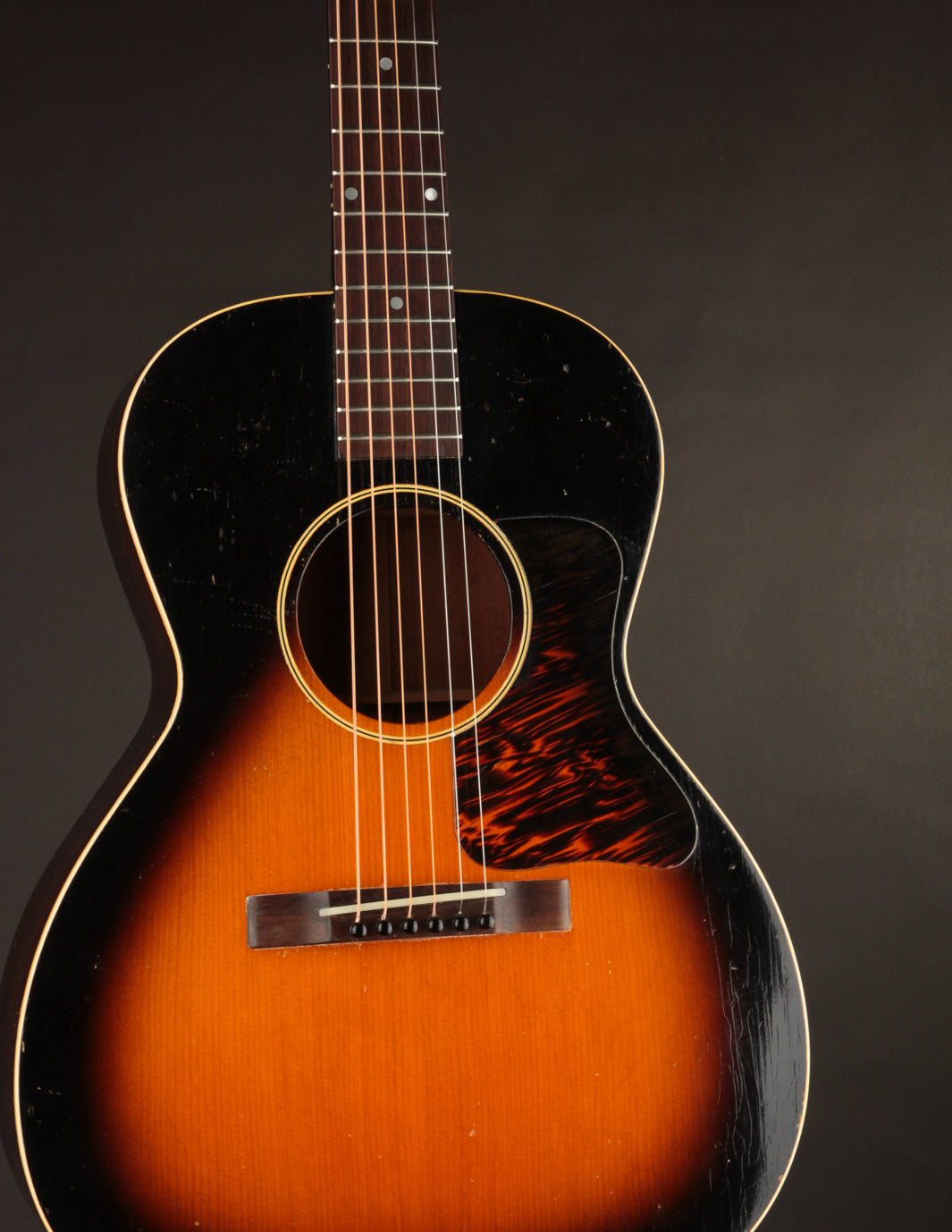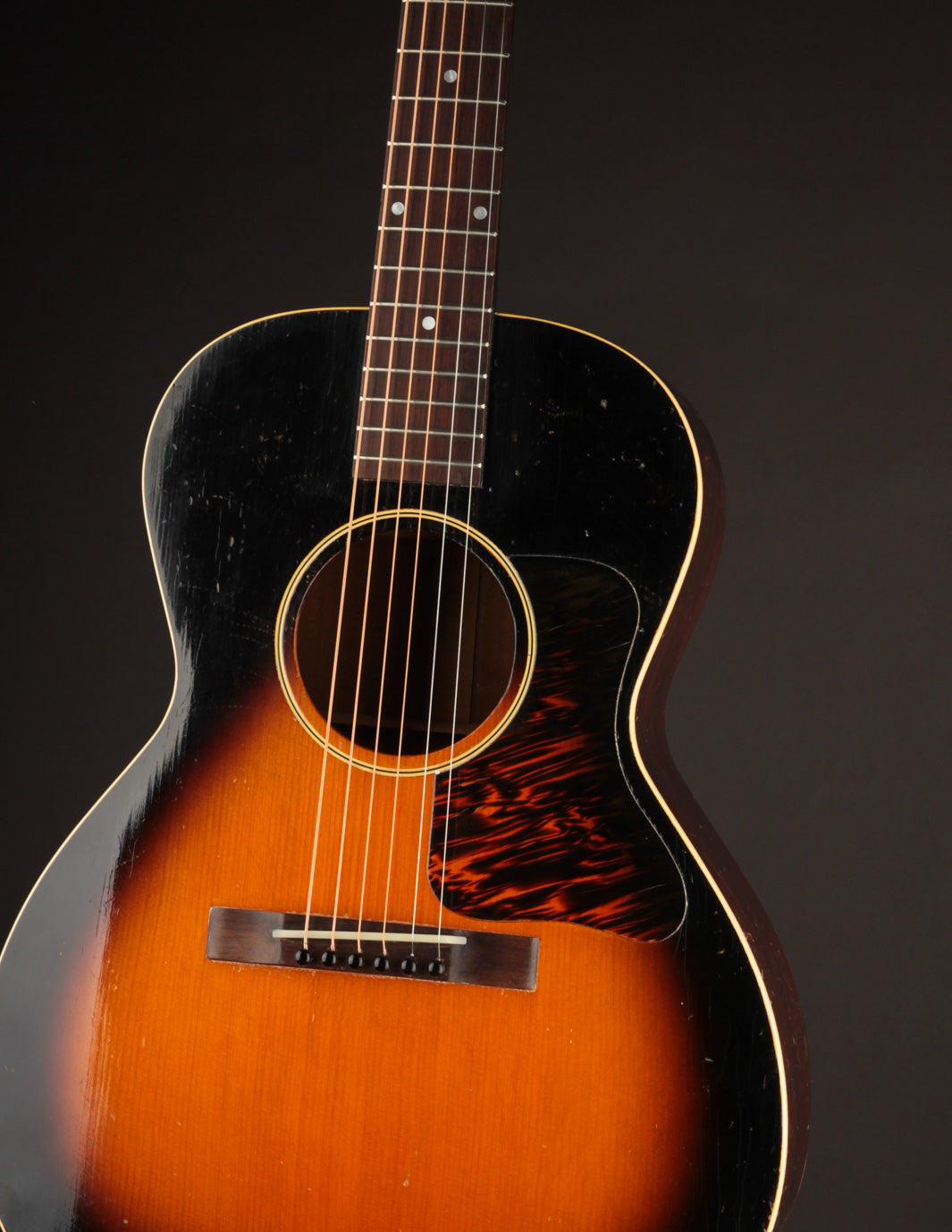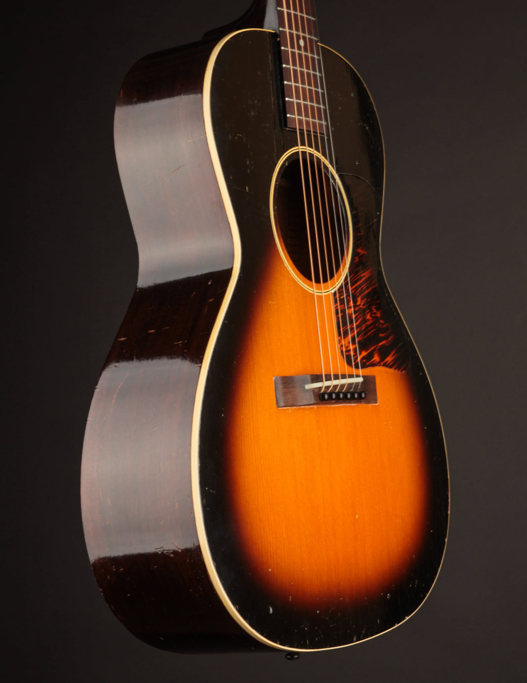 This 1935 Gibson L-00 has recently come into the shop on trade. It's a great-looking example of the darker black-and-orange sunburst Gibson moved to after the more closed-in 'bursts seen in 1934. We're also fans of this particular shade of dark burgundy back & side stain -- coupled with the top-binding-only aesthetic, the look just screams "1930's Gibson." The guitar is resonant & responsive, with the bright, woody honk & chime that keeps fingerstyle players flocking back to vintage L-00. It also sounds wonderful when flatpicked, exhibiting great balance, punch, and a nice low-string growl as well.