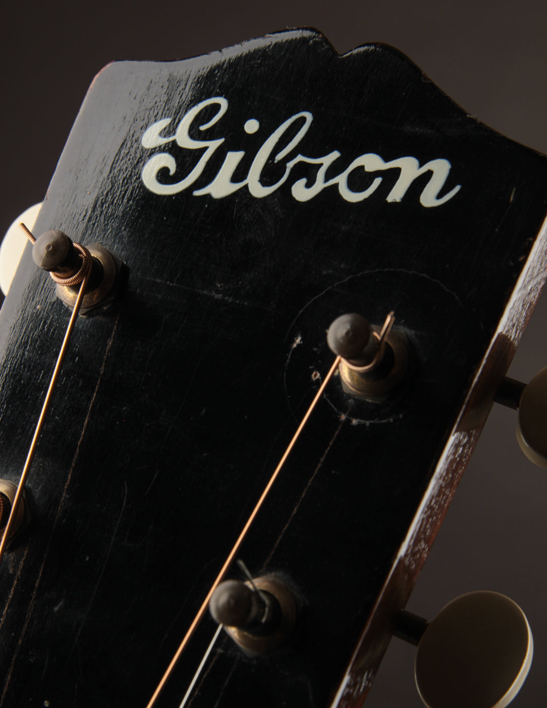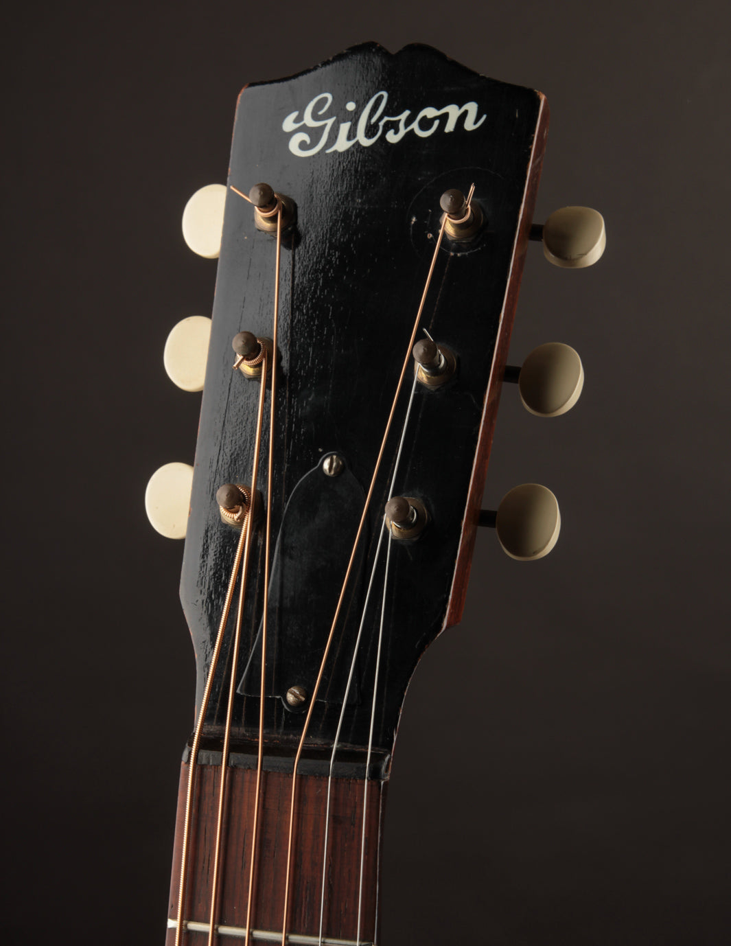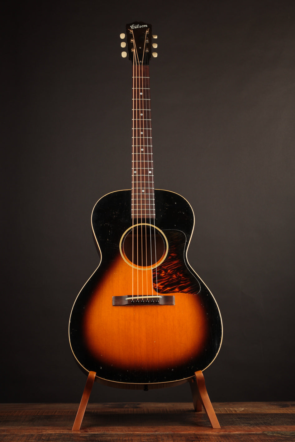 This 1935 Gibson L-00 has recently come into the shop on trade. It's a great-looking example of the darker black-and-orange sunburst Gibson moved to after the more closed-in 'bursts seen in 1934. We're also fans of this particular shade of dark burgundy back & side stain -- coupled with the top-binding-only aesthetic, the look just screams "1930's Gibson." The guitar is resonant & responsive, with the bright, woody honk & chime that keeps fingerstyle players flocking back to vintage L-00. It also sounds wonderful when flatpicked, exhibiting great balance, punch, and a nice low-string growl as well.