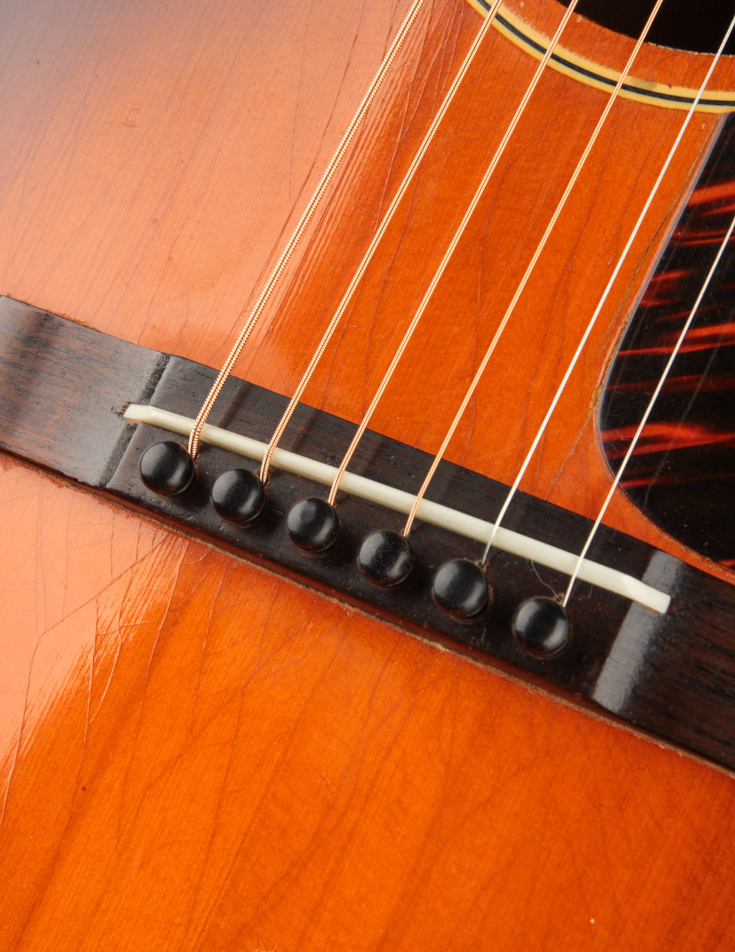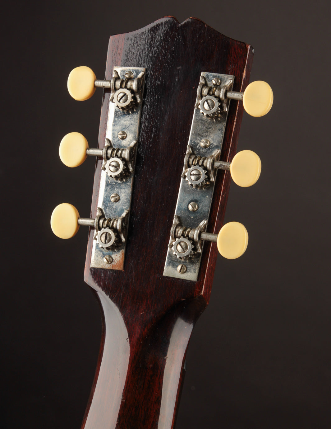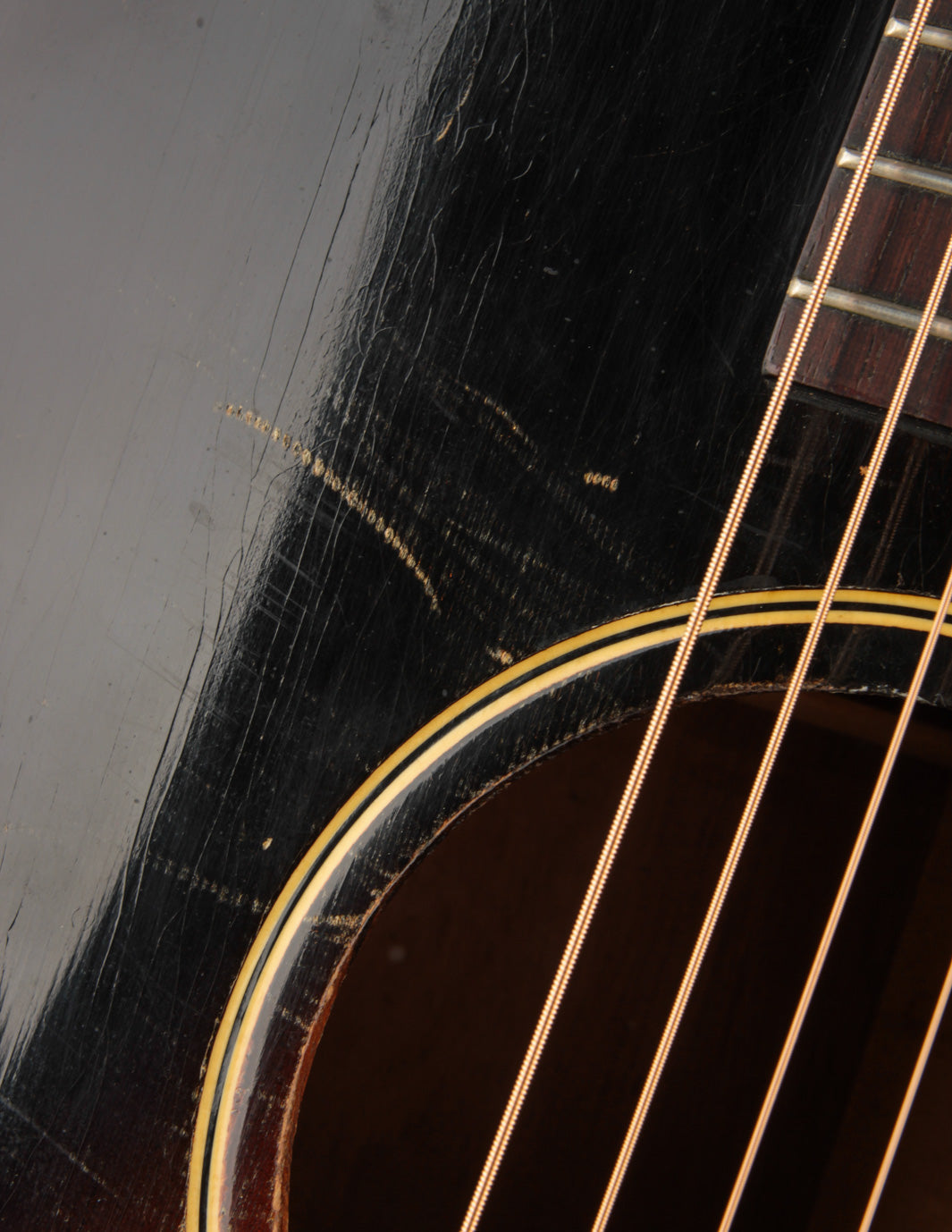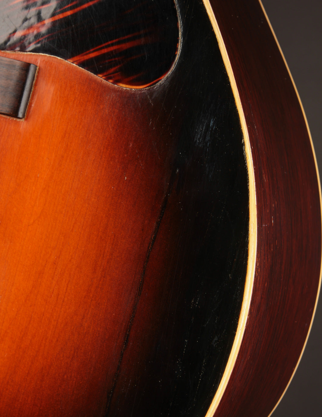 We'd call this guitar's overall vintage condition "very good." The aforementioned repaired top crack has localized finish touch up; and it's stable as can be. The saddle and tuner buttons have been replaced. The neck has likely been reset once in the past -- the work is clean, and the angle remains healthy. Price includes a Cedar Creek hardshell case (sporting its fair share of stickers).
