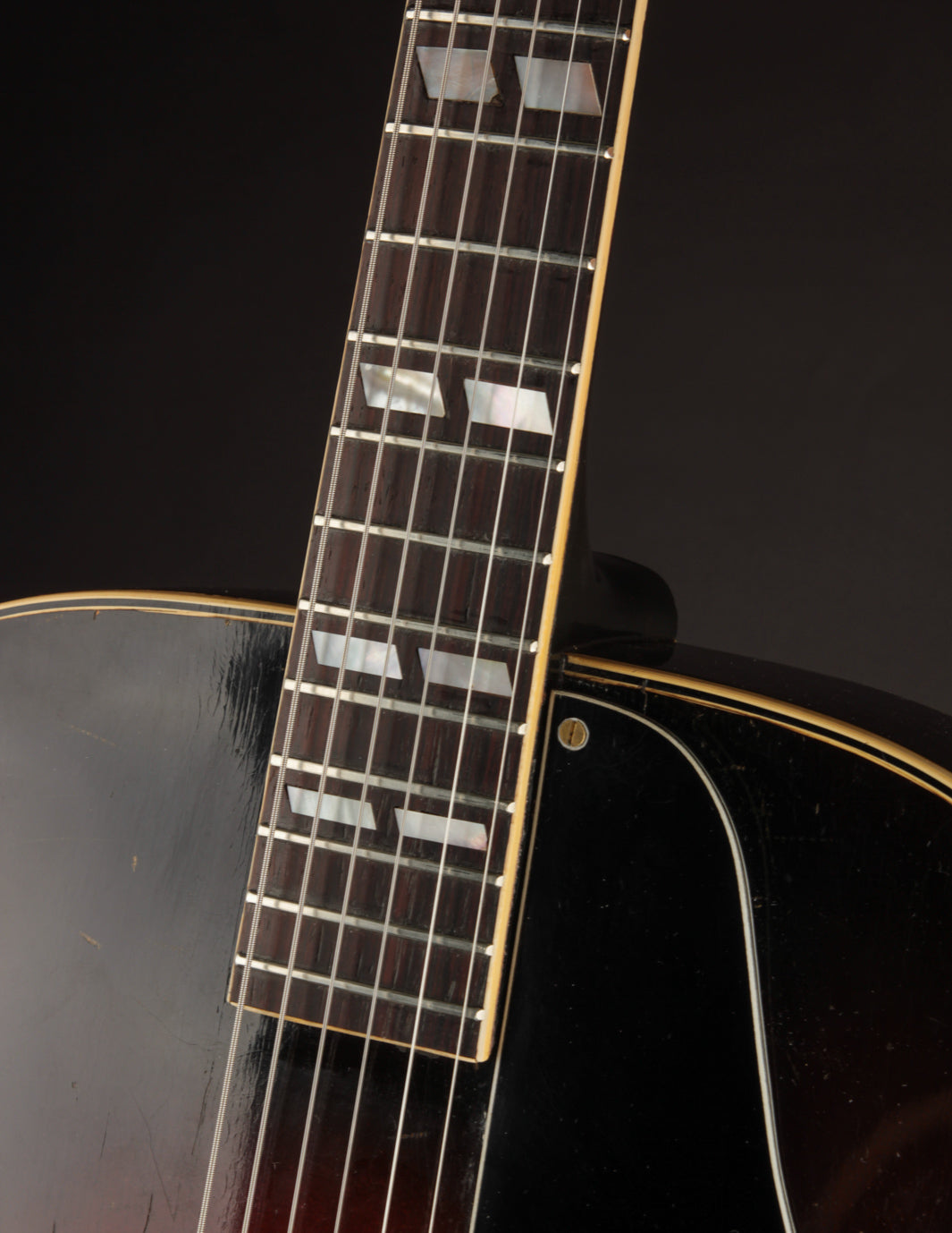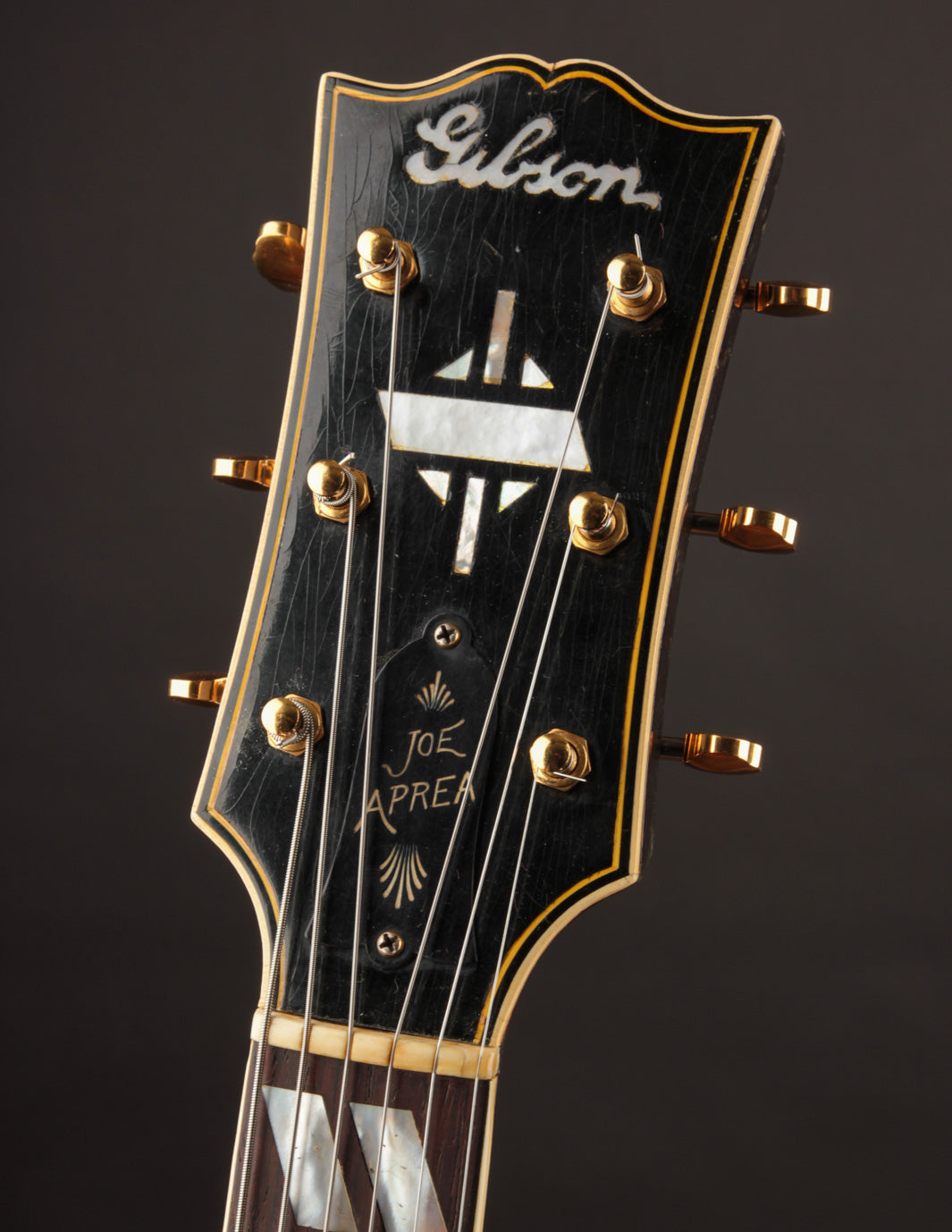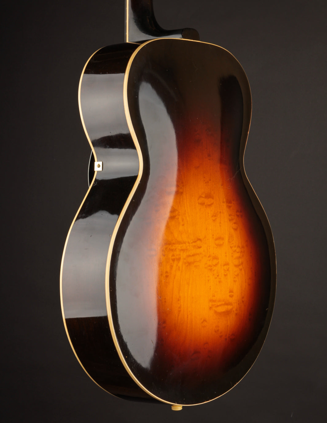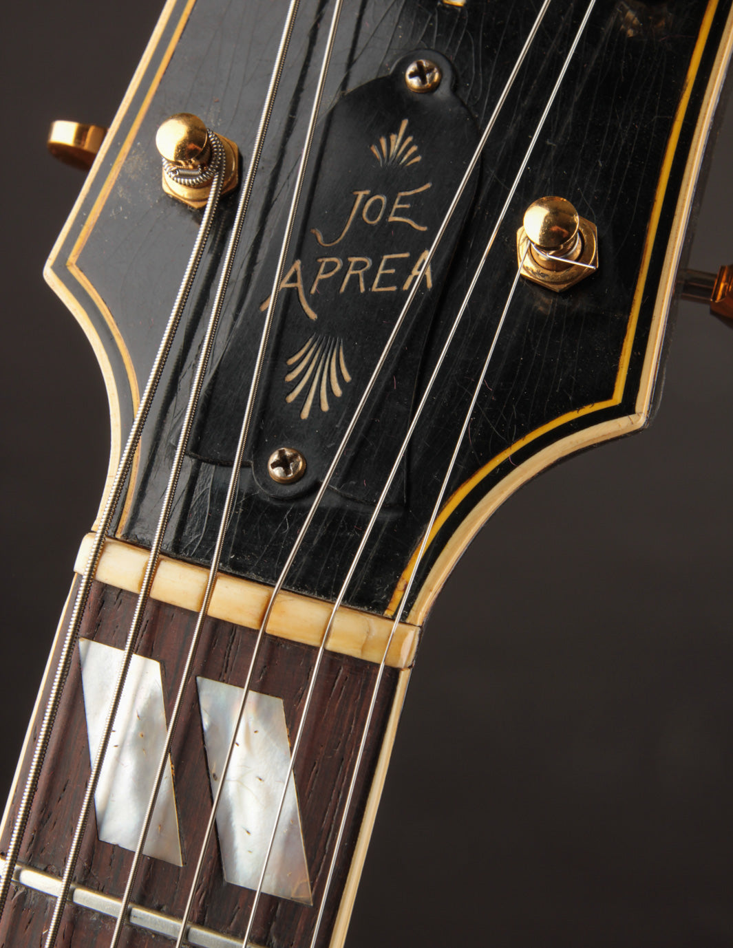 This Pre-War era Gibson shares lineage with the L-5 and is one of the premier acoustic archtops that Gibson was offering at the time. It was owned by local professional musician Joe Aprea as noted on the custom-made truss rod cover. This particular L-12 was built in the early part of 1939 and still exhibits the desirable X-bracing that was abandoned shortly thereafter in favor of parallel bracing.