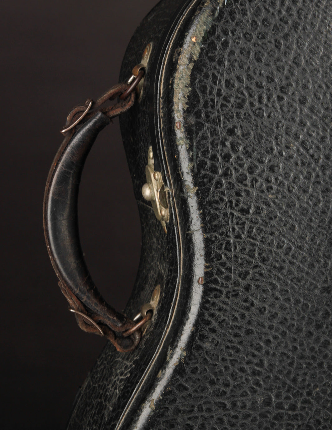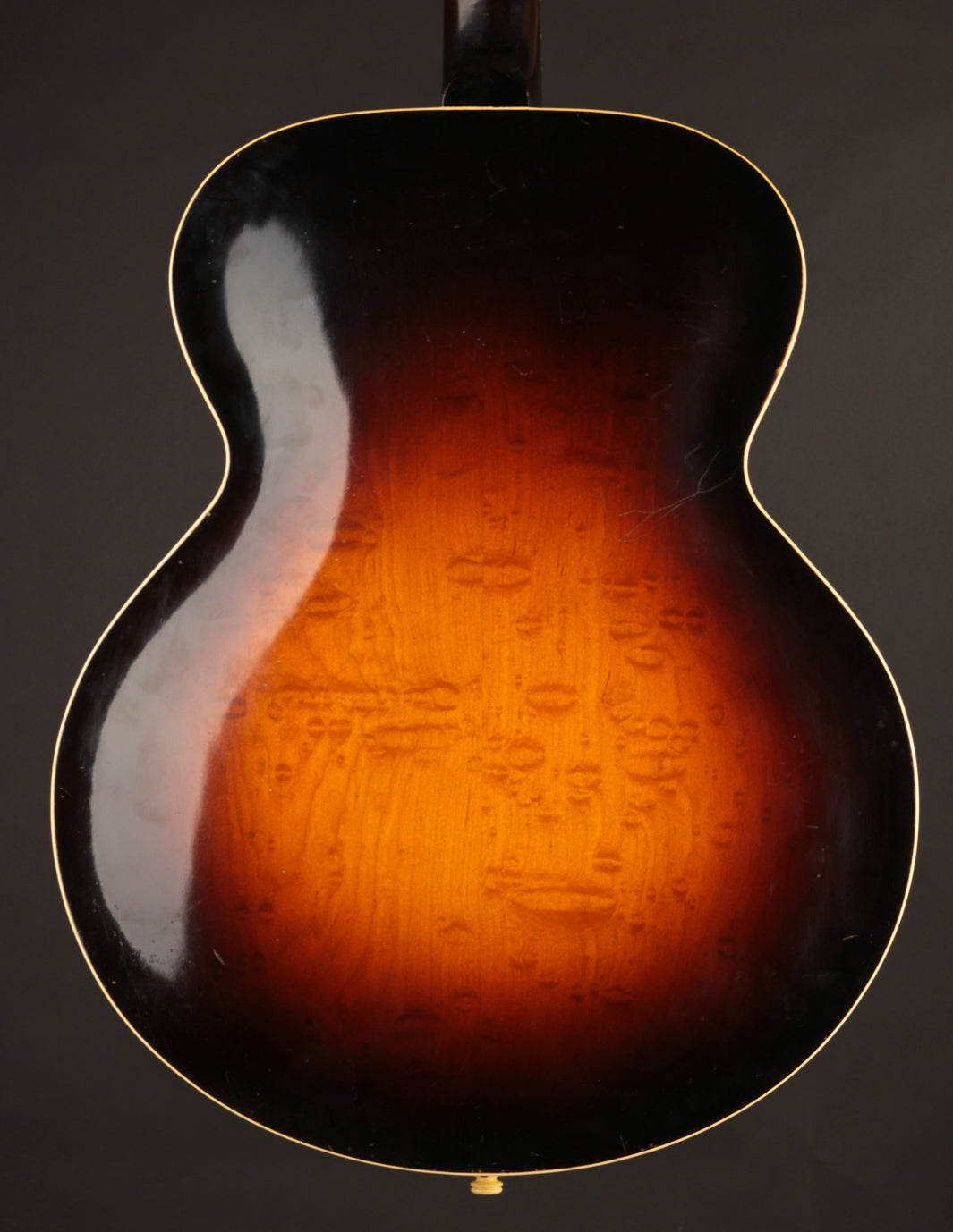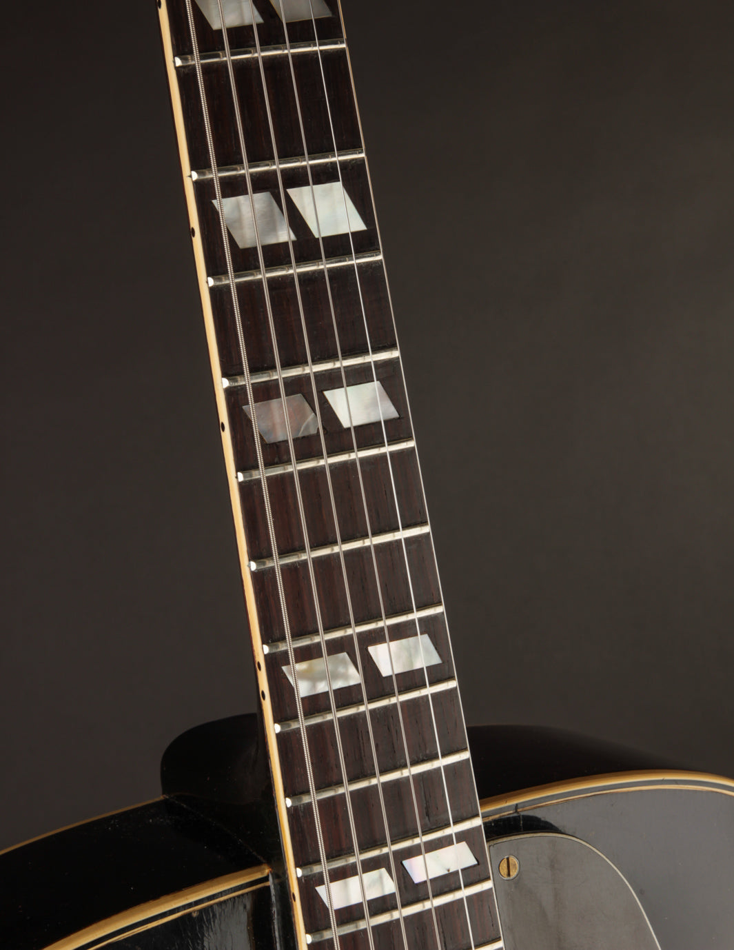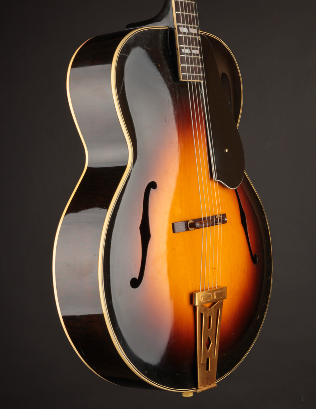 This Pre-War era Gibson shares lineage with the L-5 and is one of the premier acoustic archtops that Gibson was offering at the time. It was owned by local professional musician Joe Aprea as noted on the custom-made truss rod cover. This particular L-12 was built in the early part of 1939 and still exhibits the desirable X-bracing that was abandoned shortly thereafter in favor of parallel bracing.