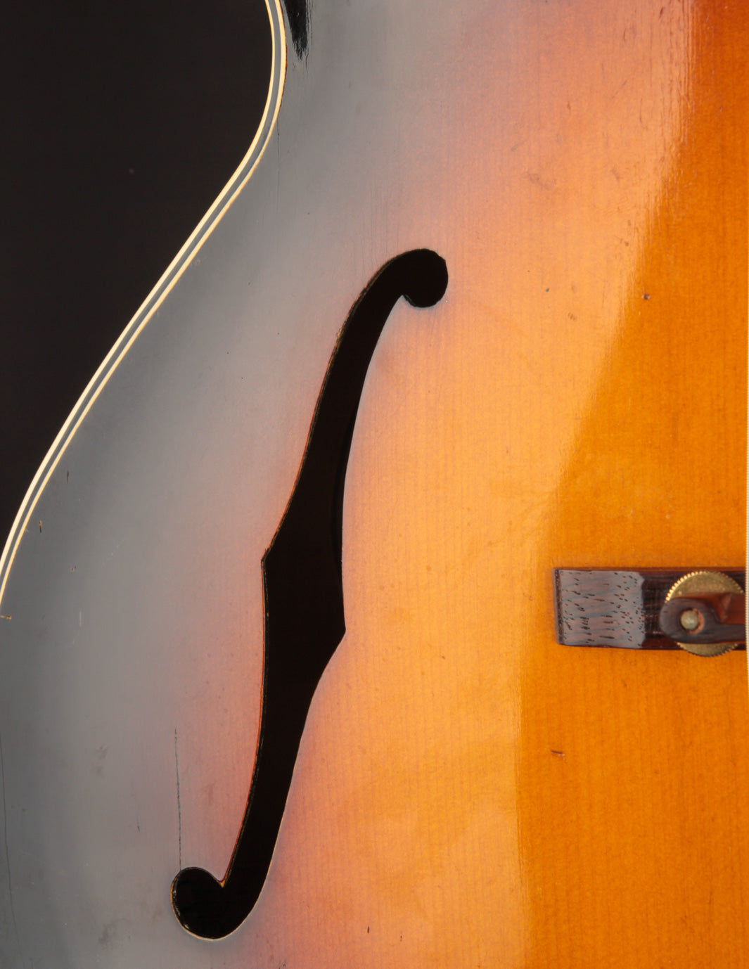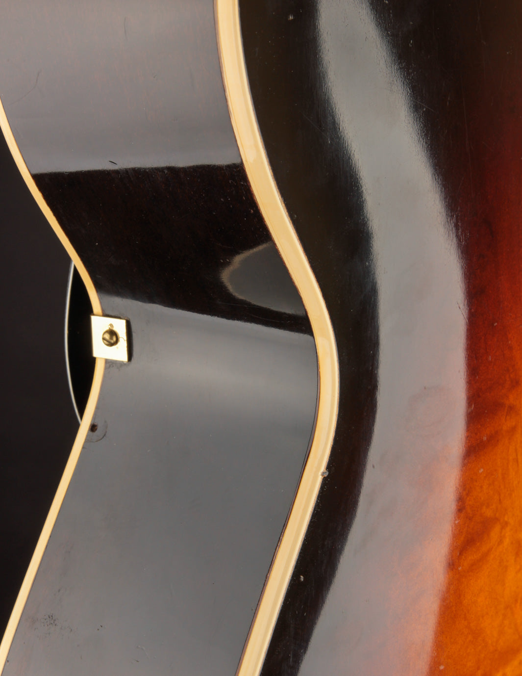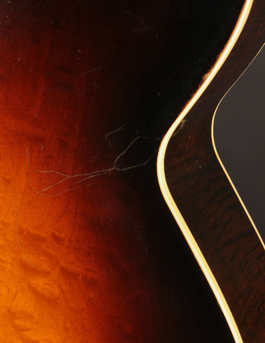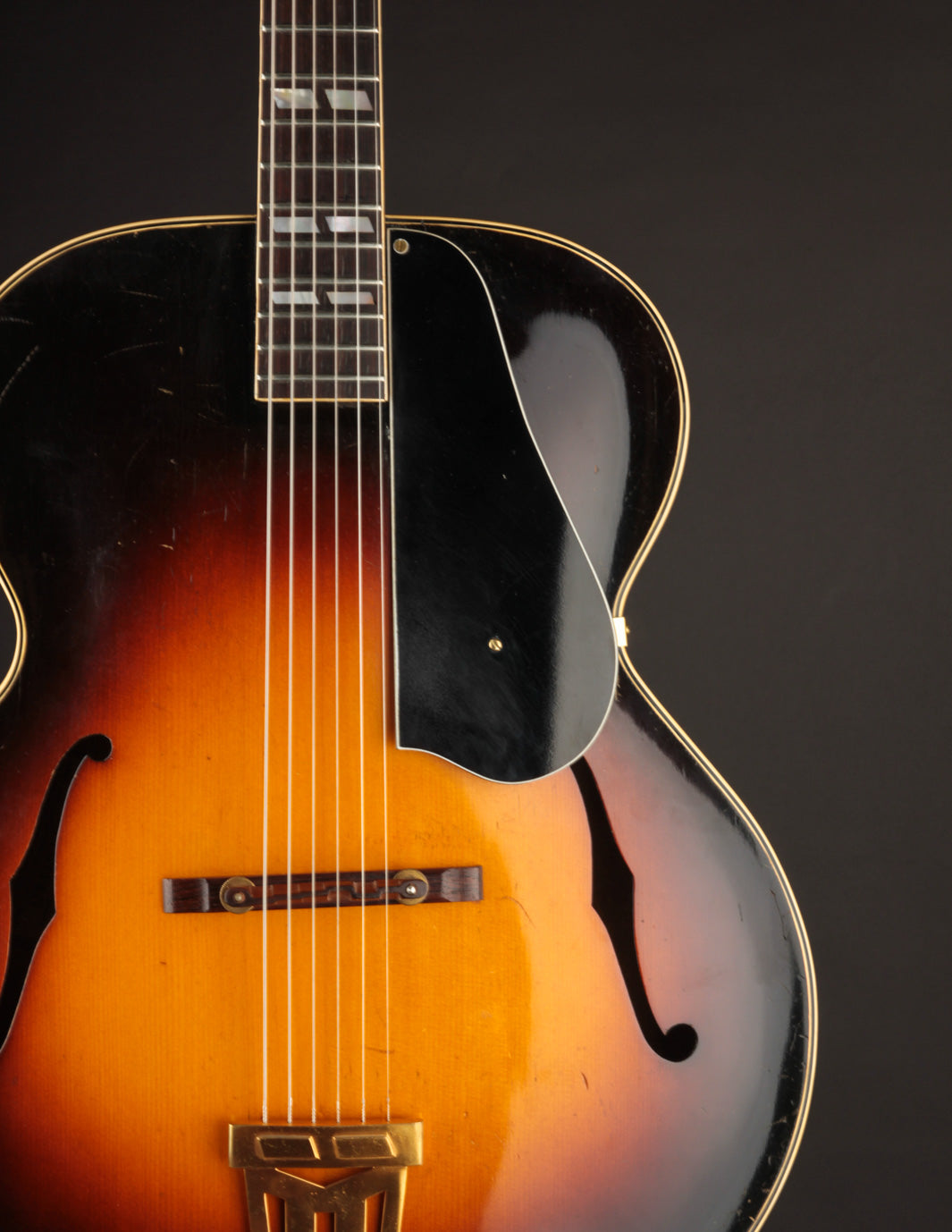 This Pre-War era Gibson shares lineage with the L-5 and is one of the premier acoustic archtops that Gibson was offering at the time. It was owned by local professional musician Joe Aprea as noted on the custom-made truss rod cover. This particular L-12 was built in the early part of 1939 and still exhibits the desirable X-bracing that was abandoned shortly thereafter in favor of parallel bracing.