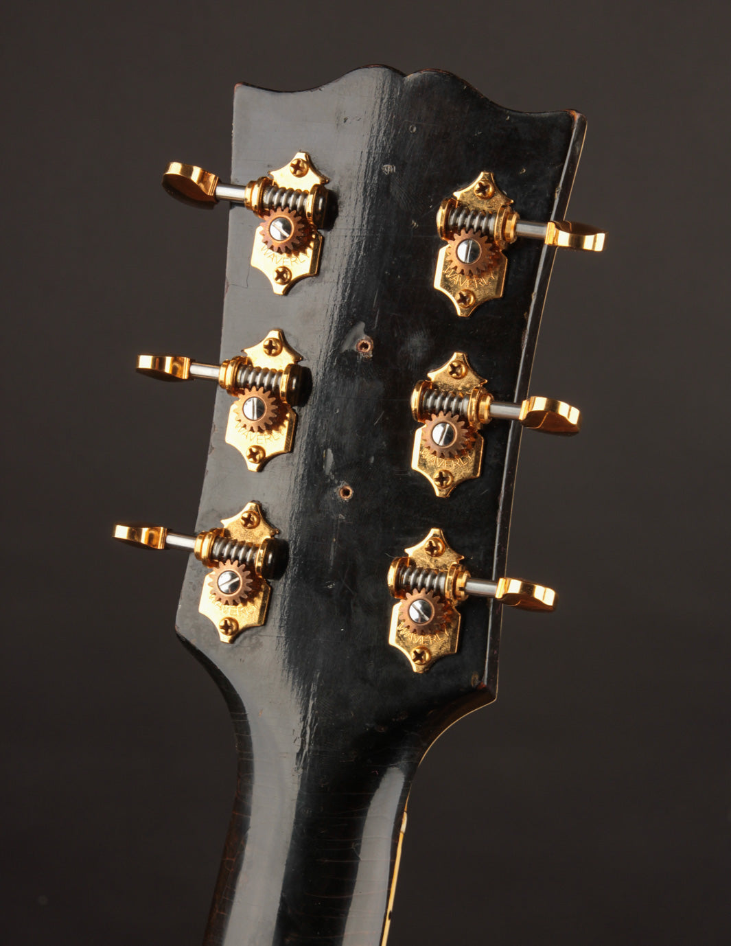 The original tuners were replaced with quality Waverly open back tuners at some point, and the original celluloid pickguard was replaced long ago with a slightly different style 3-ply pickguard and mounting bracket. There are also two small holes on the back of the headstock that were likely used to mount an old style strap hook to the guitar (the absence of a strap button on the heel suggests it), but there are no structural deficiencies there as a result. It's got the original and rare Custom L-12 gold-plated tailpiece as well!
