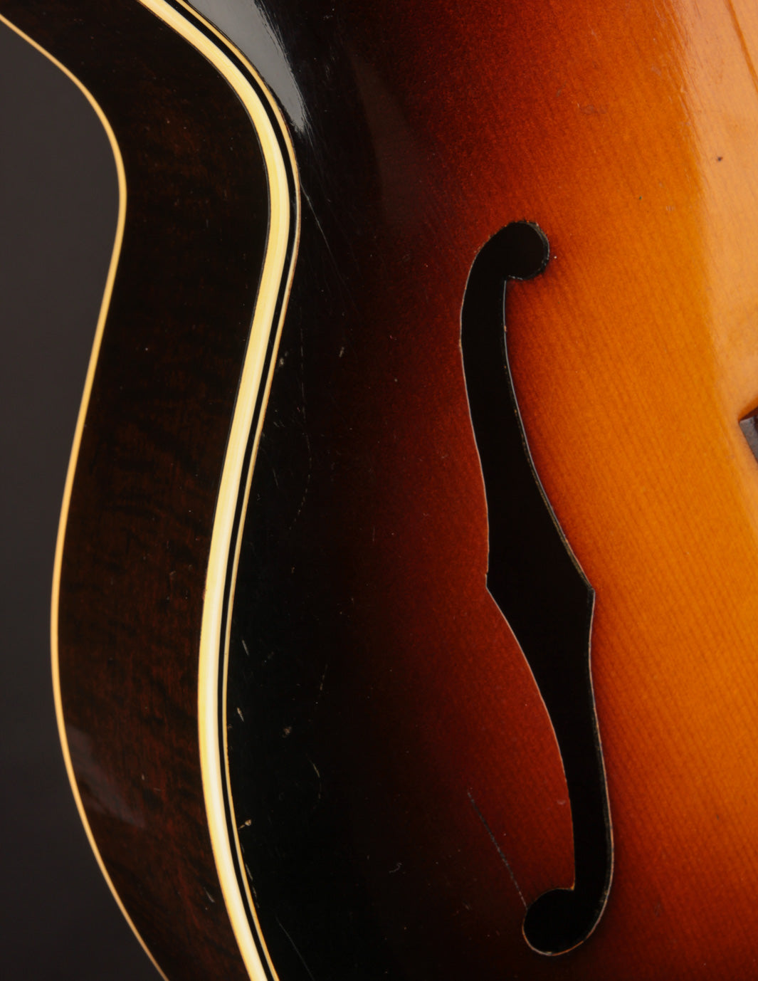 There's no lack of volume in a 17" archtop, but the X-bracing definitely brings more liveliness and dynamic response to the table, making it excel both as a rhythm and lead instrument. The neck is a very comfortable rounded C profile with a moderate taper, and with a great refret done in-house, playability is as good as it's ever been!