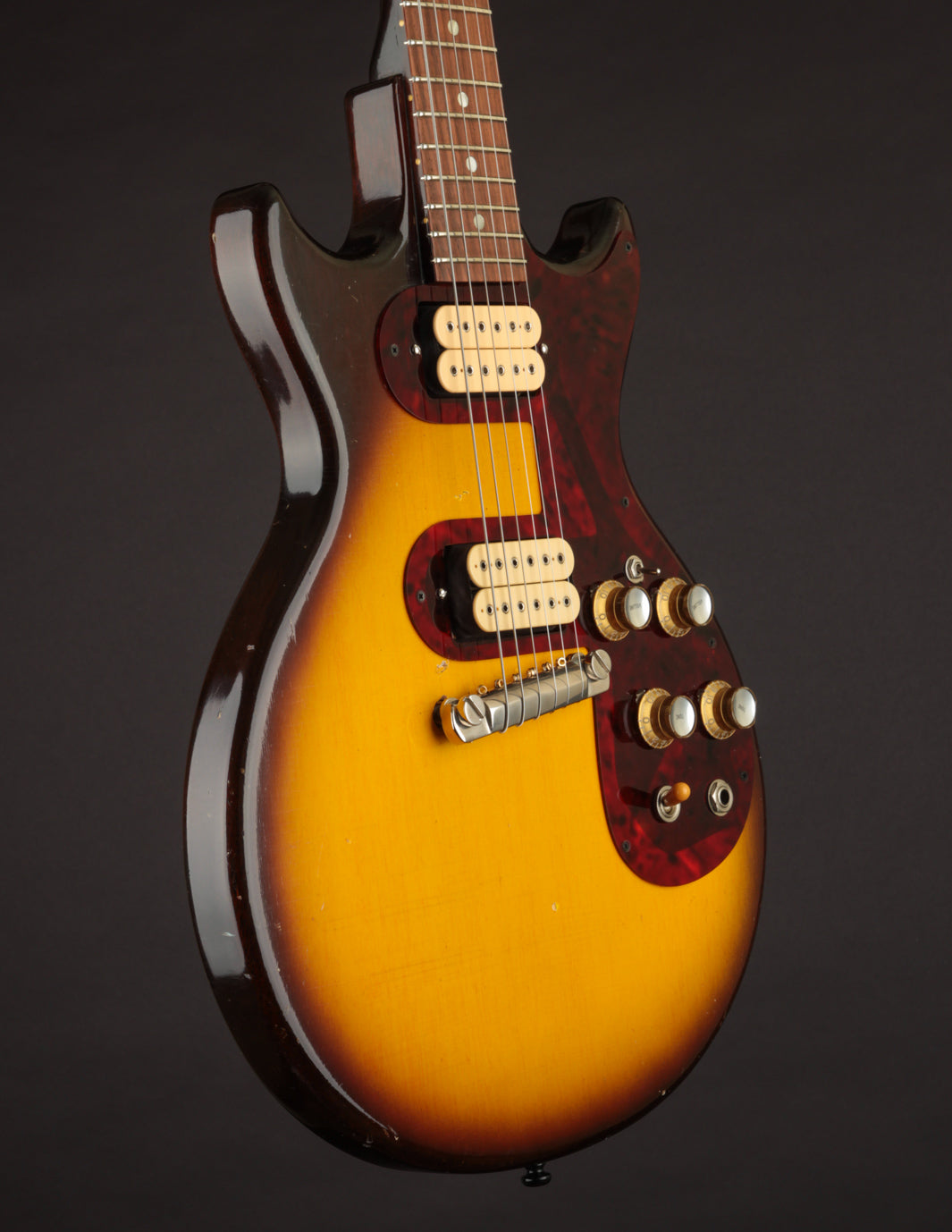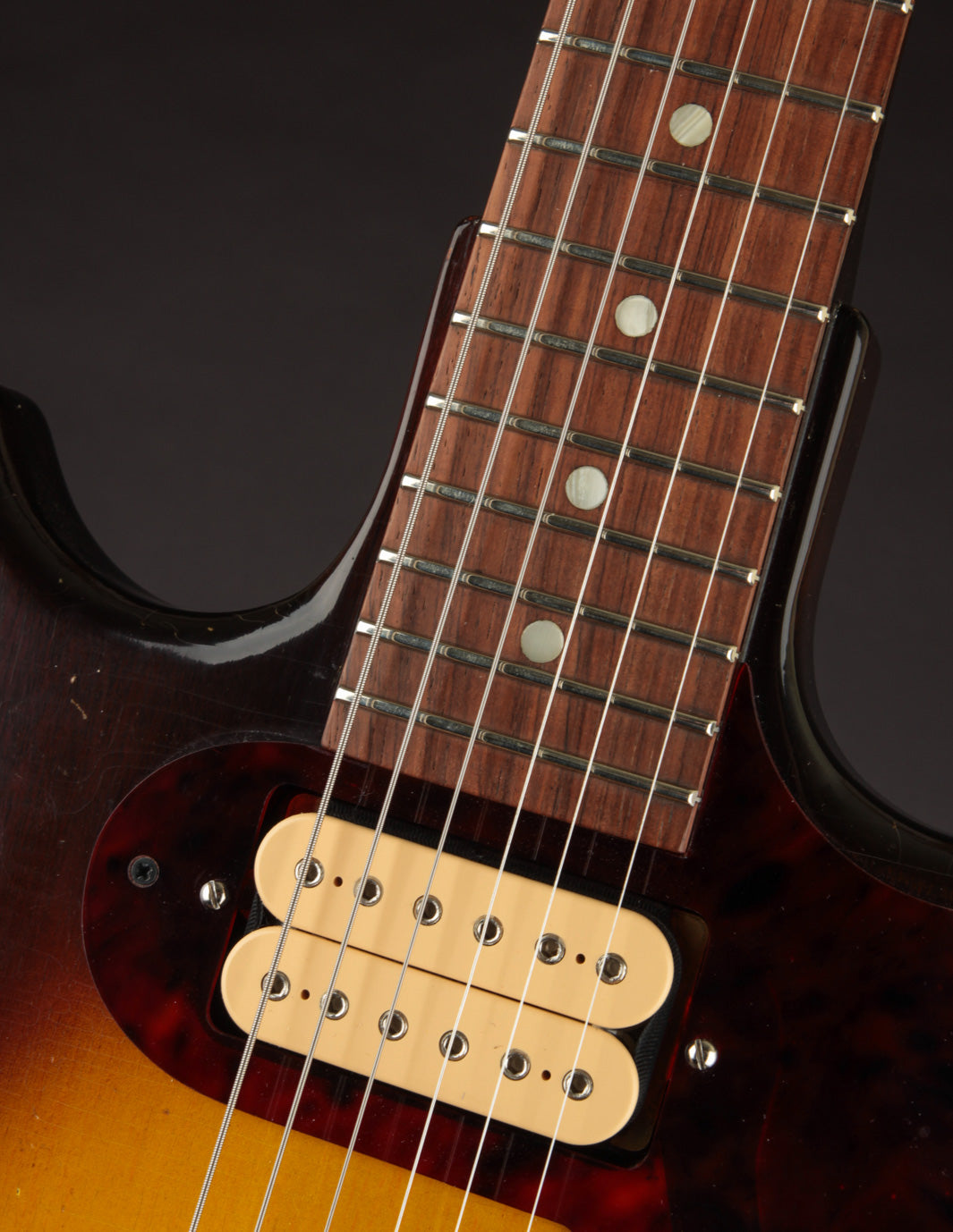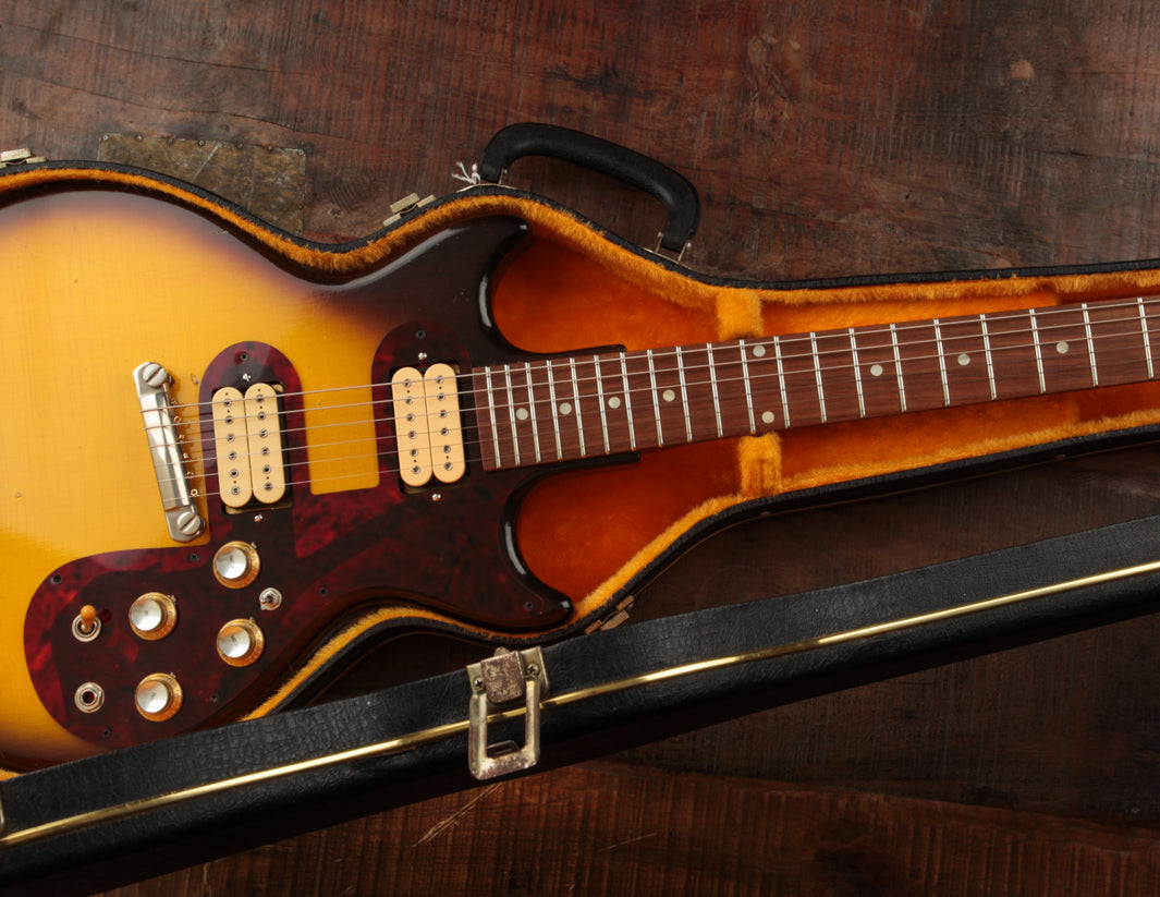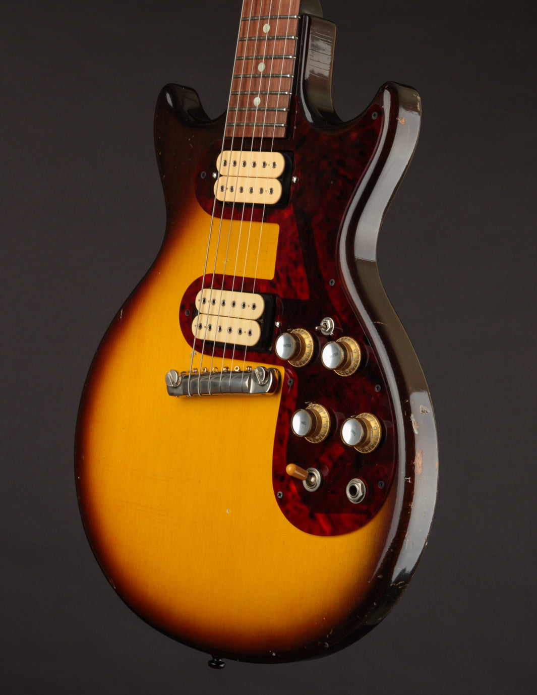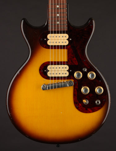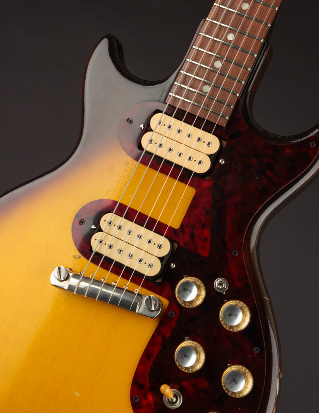 One look at this 1961 Epiphone Olympic and you'll notice this isn't your average 1960s budget electric. It's been hot rodded to absolute perfection by Laurent Brondel, and quite frankly plays and sounds like no other MM-type guitar we've ever had our hands on. The impeccable refret and replaced nut along with the installation of a MojoAxe wraparound tailpiece has this guitar so well dialed-in, with some of the most impressive acoustic resonance one could find in a small solidbody like this. The original single coil pickup and accompanying pickguard has been shed in favor of a monstrous sounding pair of DiMarzio Super Distortion humbuckers complete with coil-tap and a new pickguard. The tone is incredibly punchy and authoritative, and the split coil sound still retains richness with more sizzle in the top end.