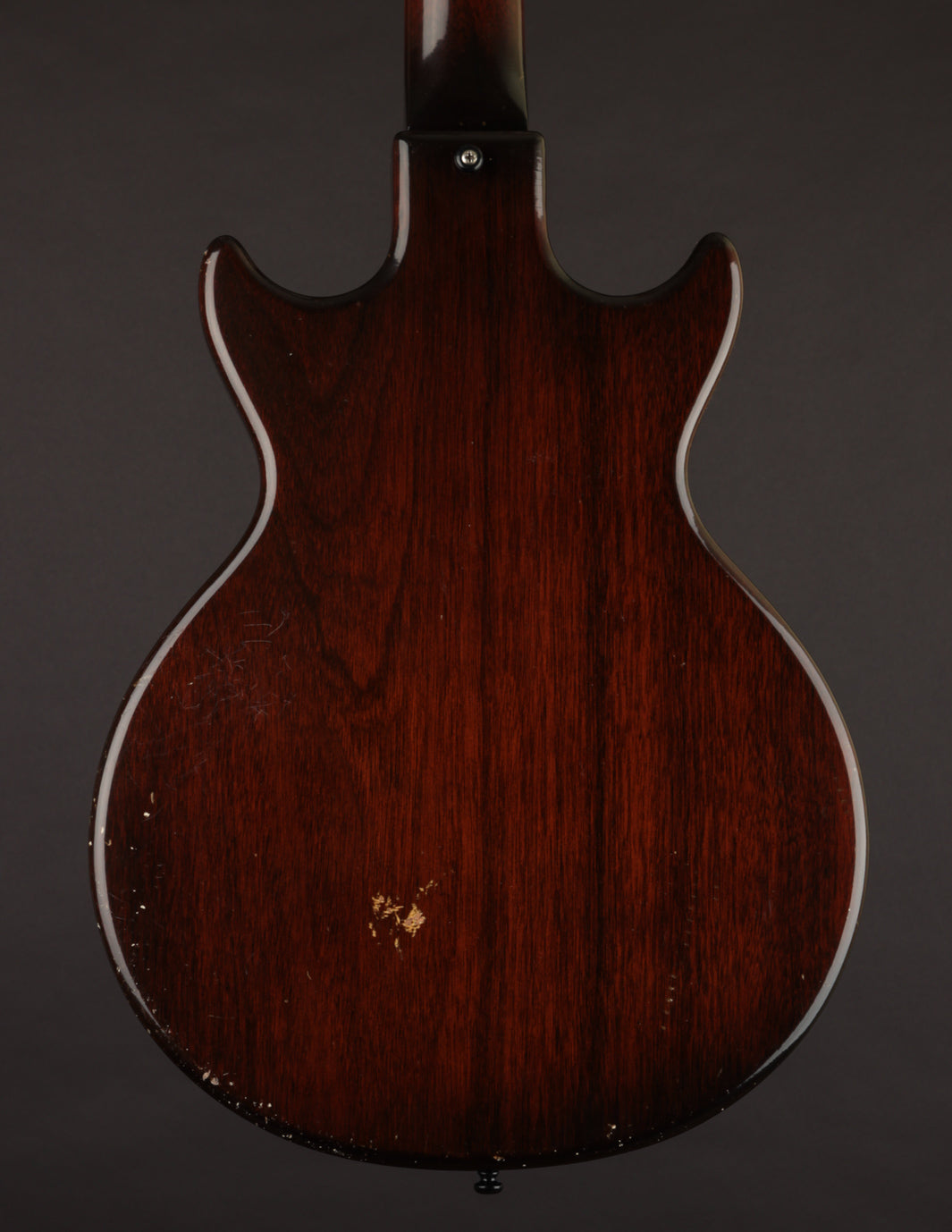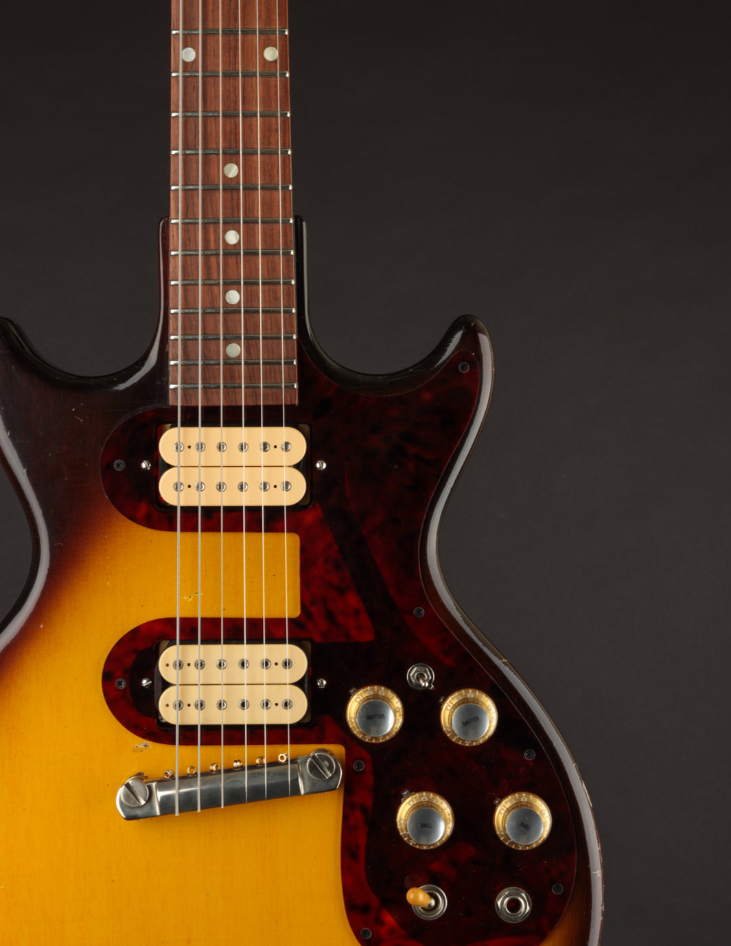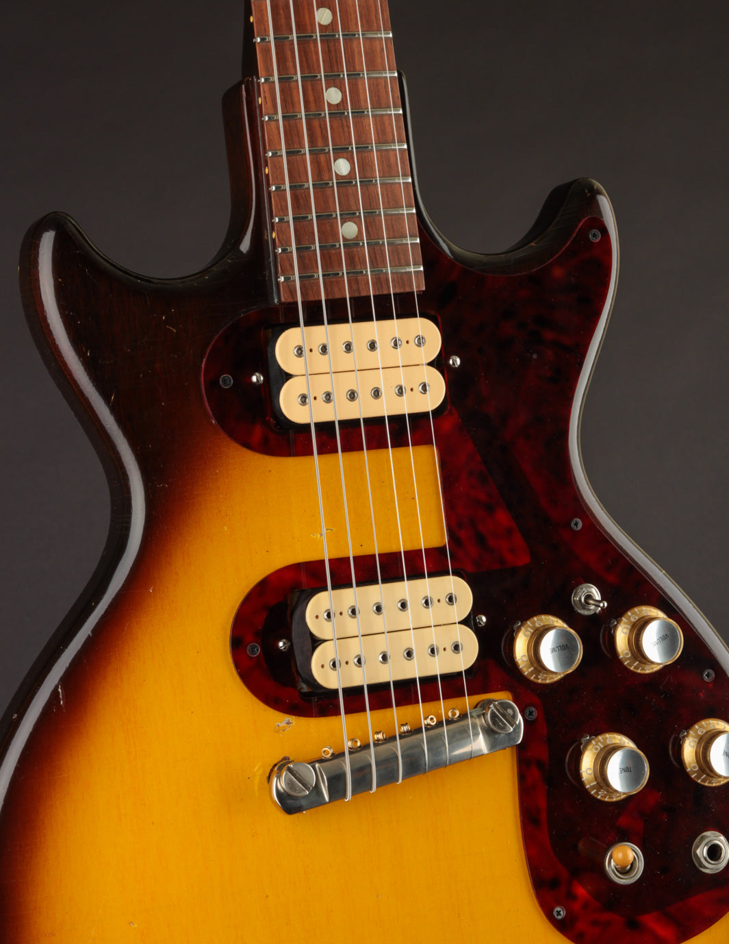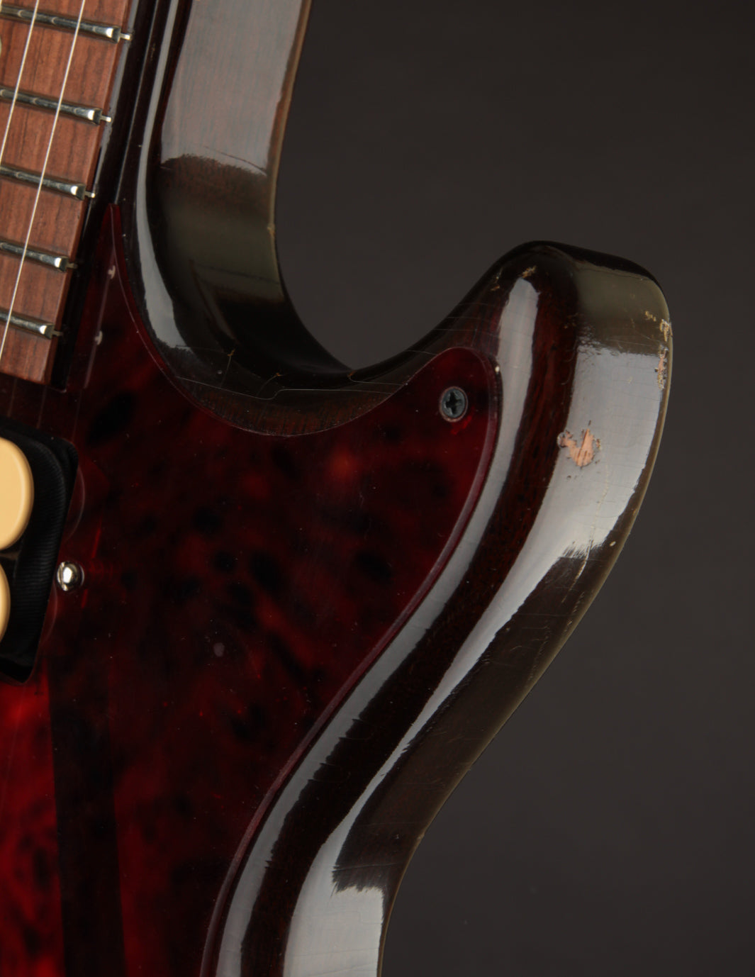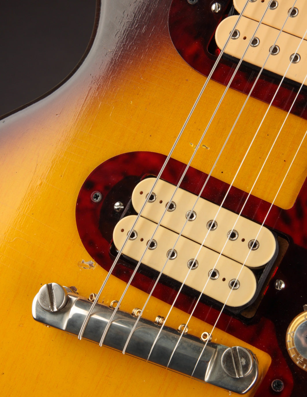 One look at this 1961 Epiphone Olympic and you'll notice this isn't your average 1960s budget electric. It's been hot rodded to absolute perfection by Laurent Brondel, and quite frankly plays and sounds like no other MM-type guitar we've ever had our hands on. The impeccable refret and replaced nut along with the installation of a MojoAxe wraparound tailpiece has this guitar so well dialed-in, with some of the most impressive acoustic resonance one could find in a small solidbody like this. The original single coil pickup and accompanying pickguard has been shed in favor of a monstrous sounding pair of DiMarzio Super Distortion humbuckers complete with coil-tap and a new pickguard. The tone is incredibly punchy and authoritative, and the split coil sound still retains richness with more sizzle in the top end.