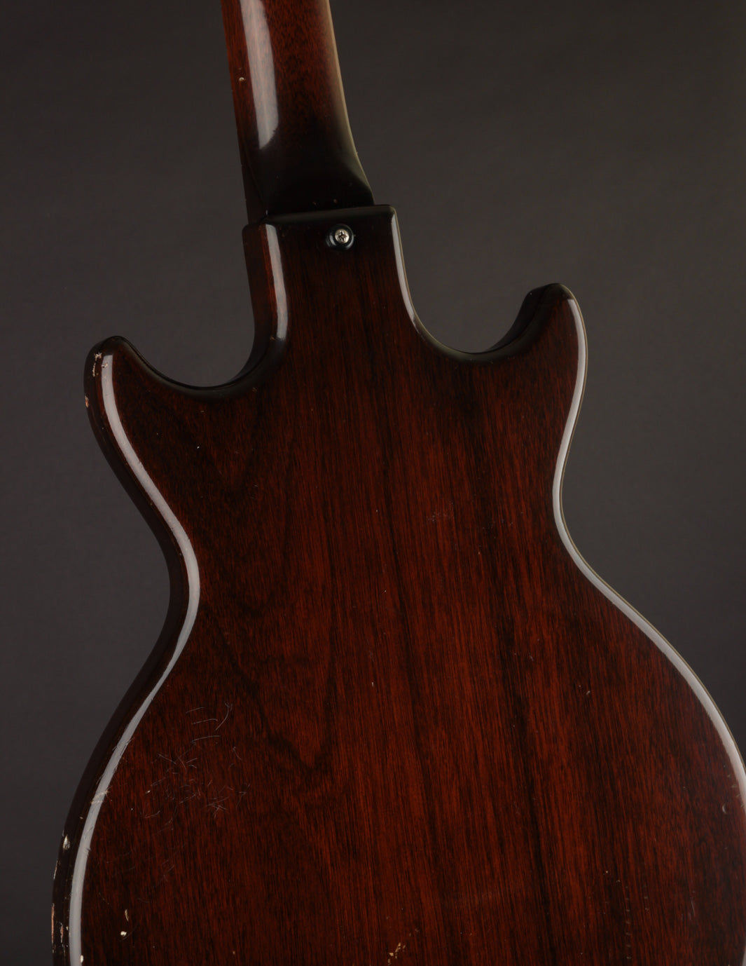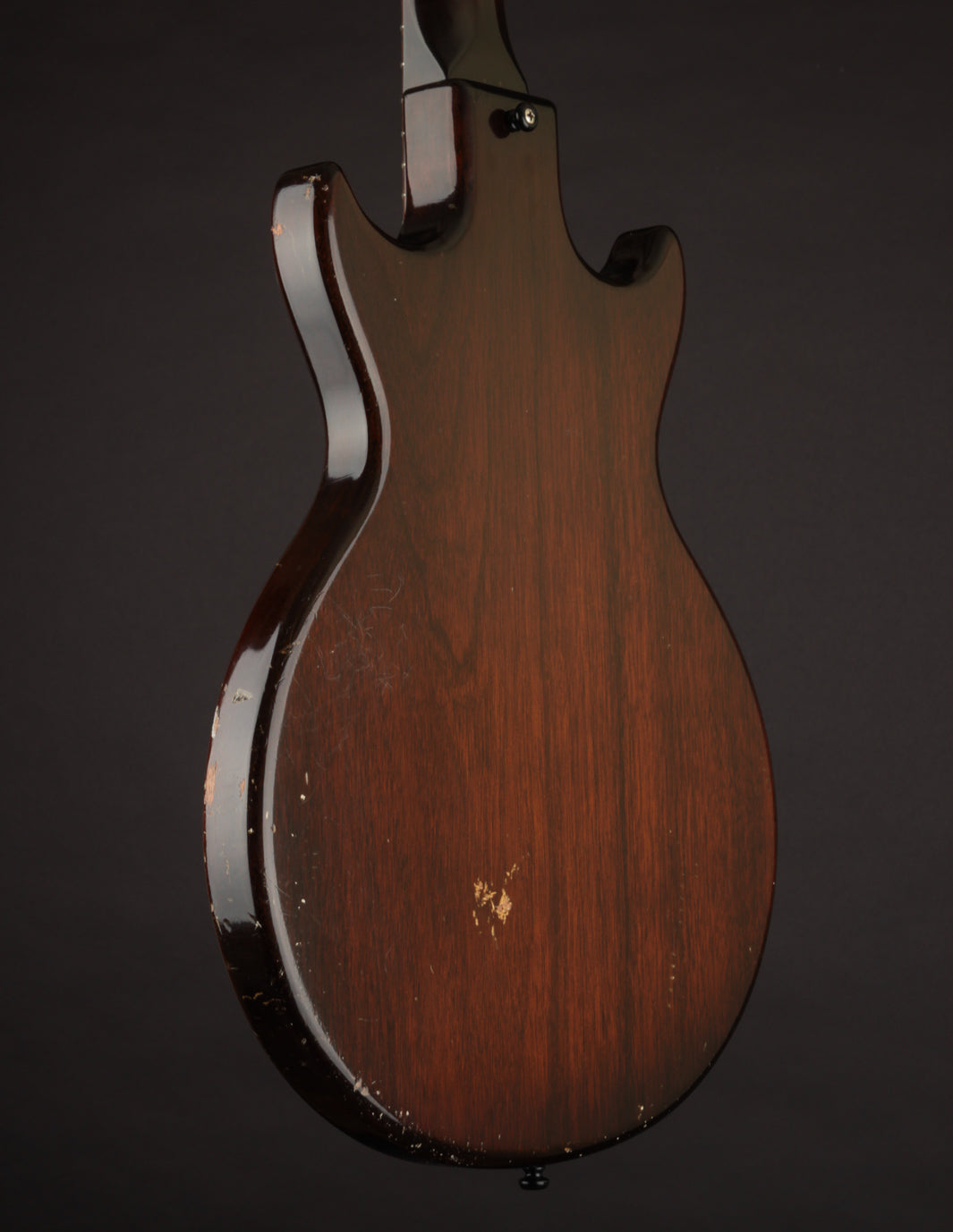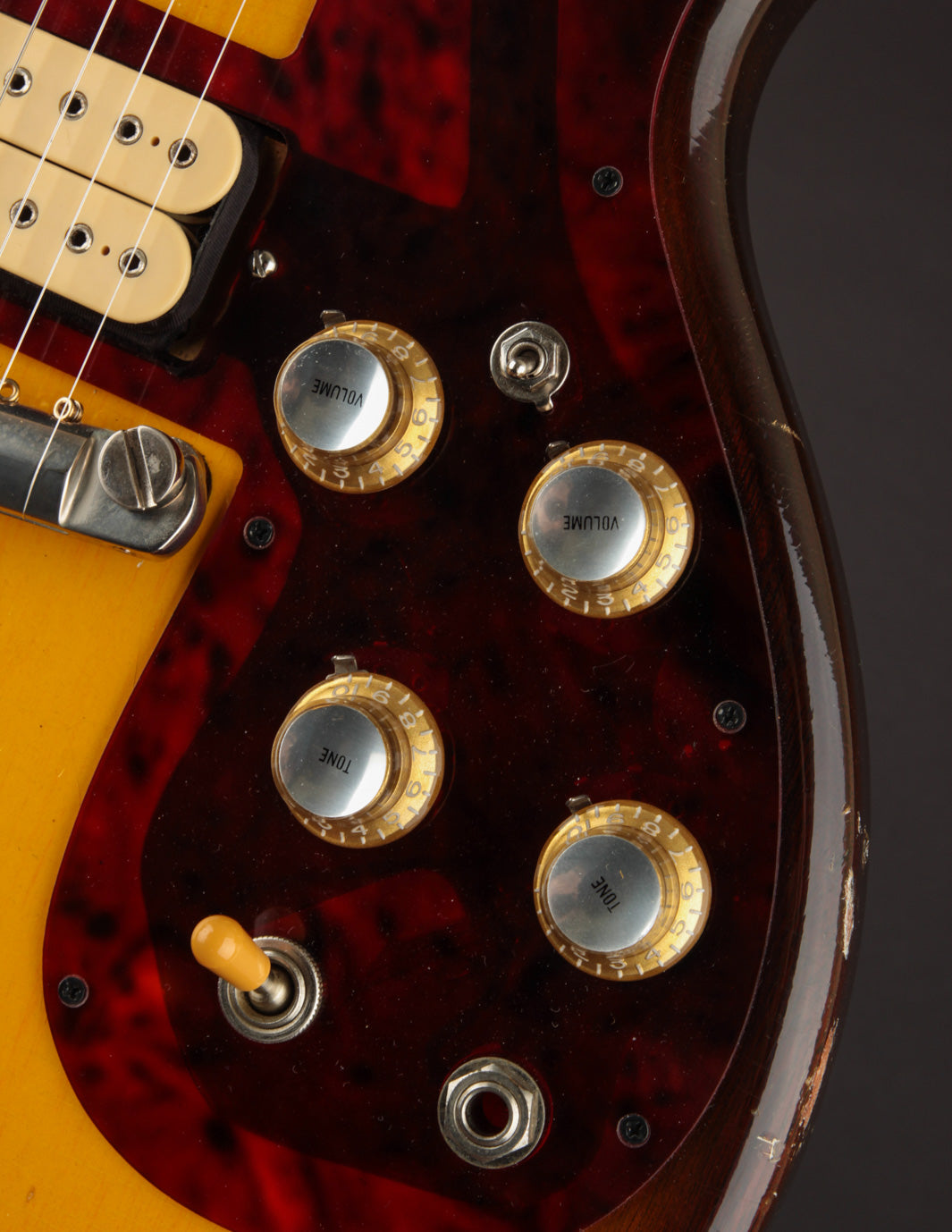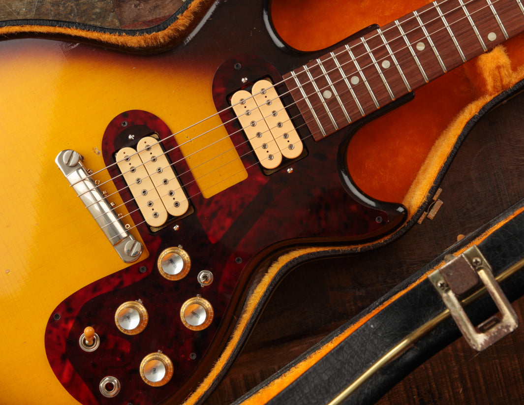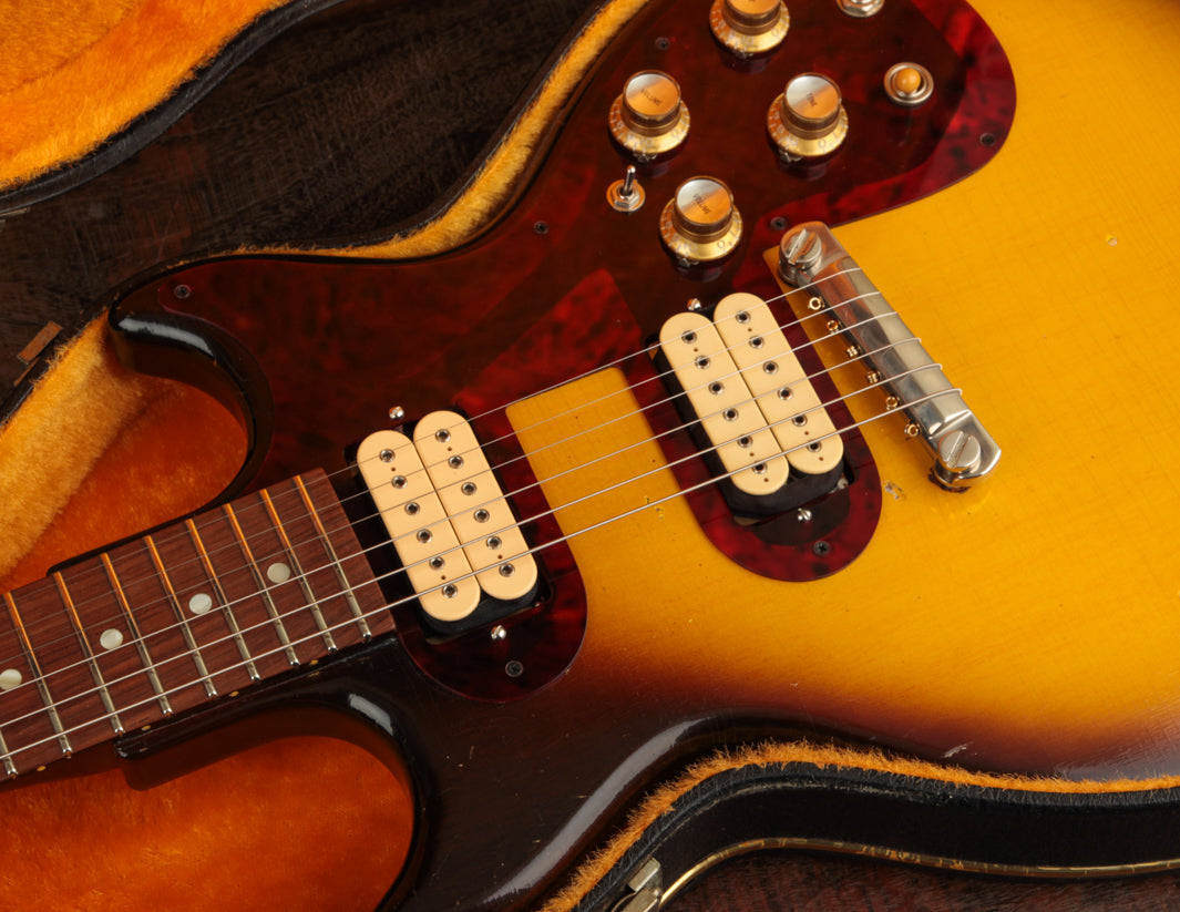 One look at this 1961 Epiphone Olympic and you'll notice this isn't your average 1960s budget electric. It's been hot rodded to absolute perfection by Laurent Brondel, and quite frankly plays and sounds like no other MM-type guitar we've ever had our hands on. The impeccable refret and replaced nut along with the installation of a MojoAxe wraparound tailpiece has this guitar so well dialed-in, with some of the most impressive acoustic resonance one could find in a small solidbody like this. The original single coil pickup and accompanying pickguard has been shed in favor of a monstrous sounding pair of DiMarzio Super Distortion humbuckers complete with coil-tap and a new pickguard. The tone is incredibly punchy and authoritative, and the split coil sound still retains richness with more sizzle in the top end.