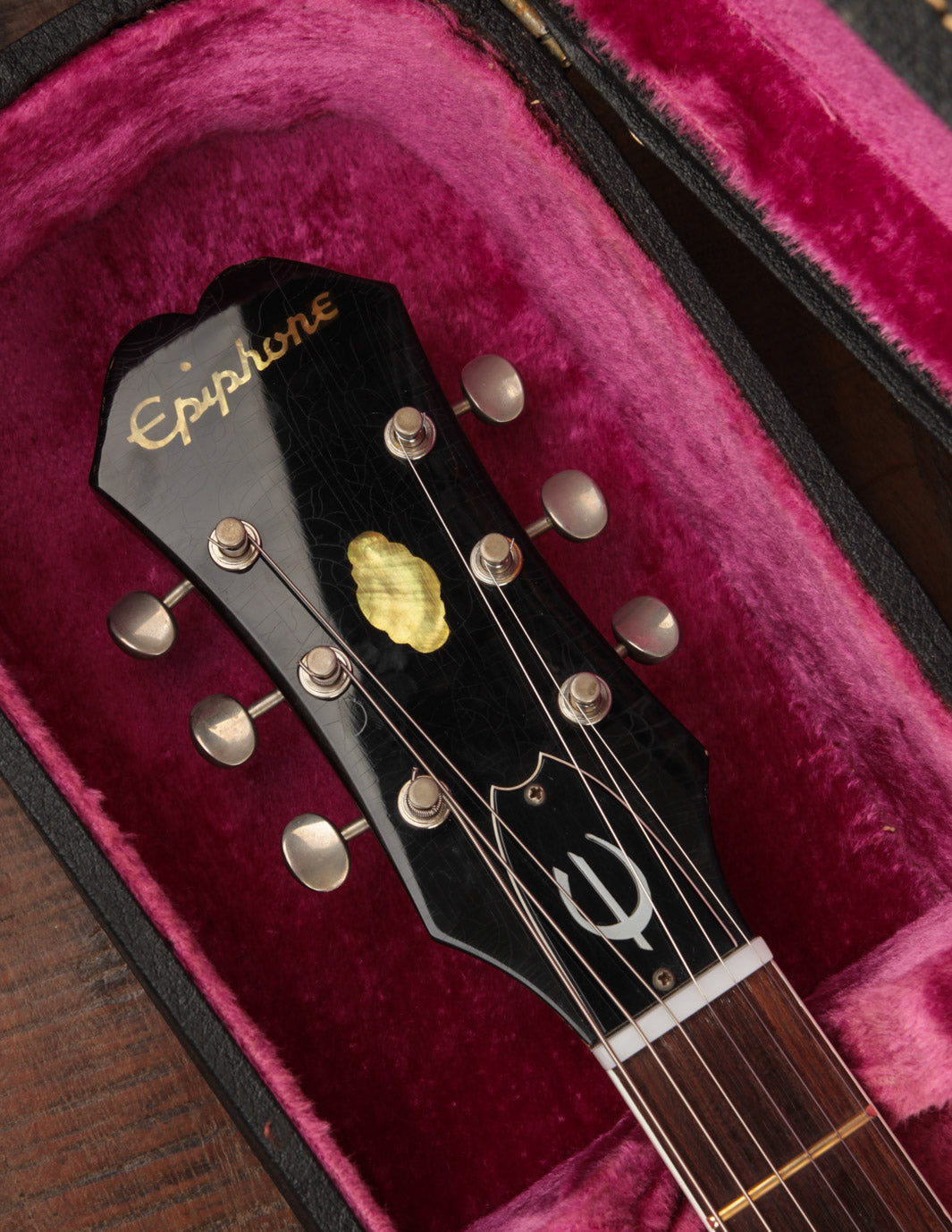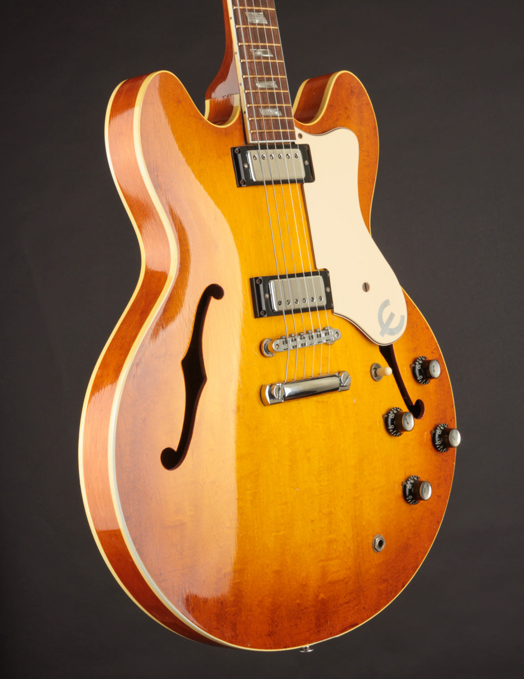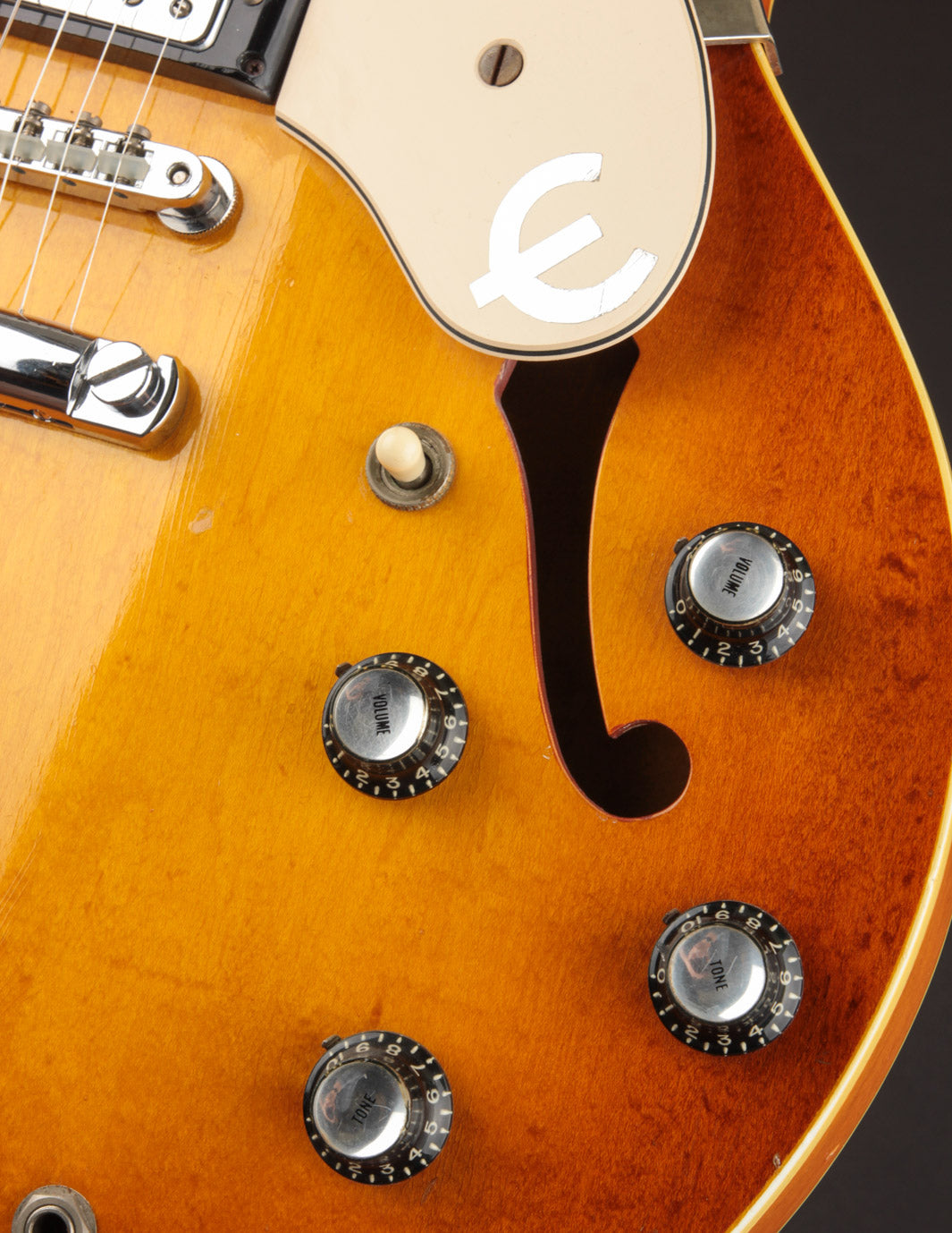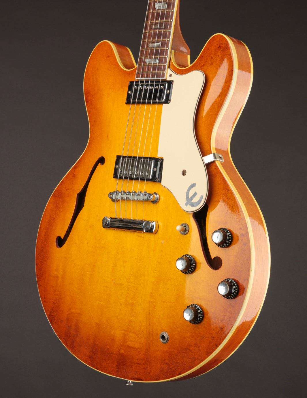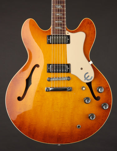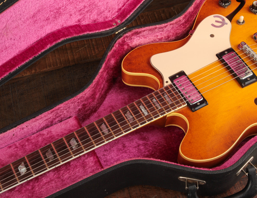 Epiphone's Royal Tan finish - a favorite of ours across all vintage finishes - shines brightly on this guitar. Faded out slightly over the years but still quite vibrant, it's a refreshing take on the darker sunburst variants that could be found on many Gibsons and Fenders from the same period.