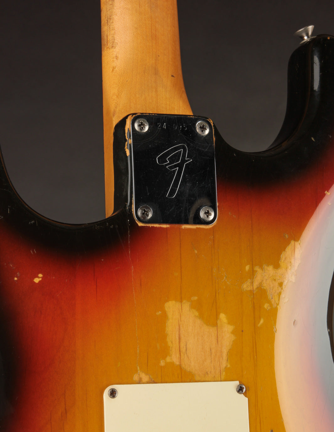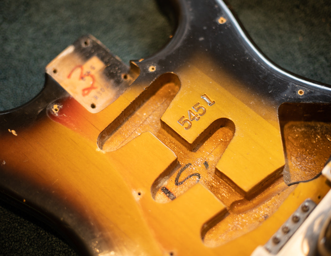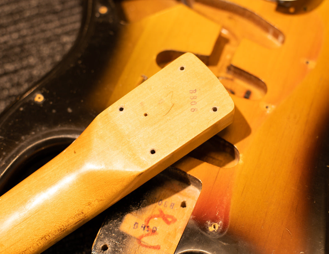 The Alder body is finished in the classic Sunburst that's faded out a bit over the decades, with some beautiful top coat lacquer checking and natural wear throughout. There's a mysterious work order number stamp impressed into the body underneath the pickguard that suggests the guitar was returned to the factory for some sort of repair work, but it doesn't appear that it had anything to do with the body, neck, or finish itself. It's also clear that the guitar was finished after the stamp was made, with clear evidence of finish sunken into the work order number.