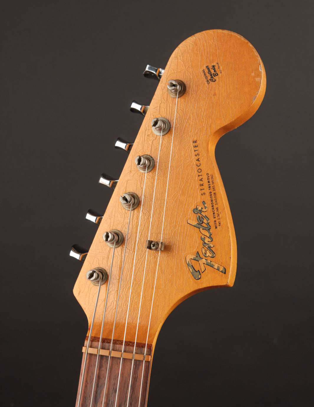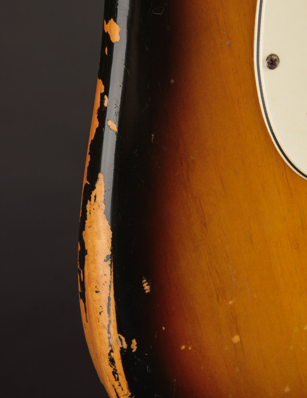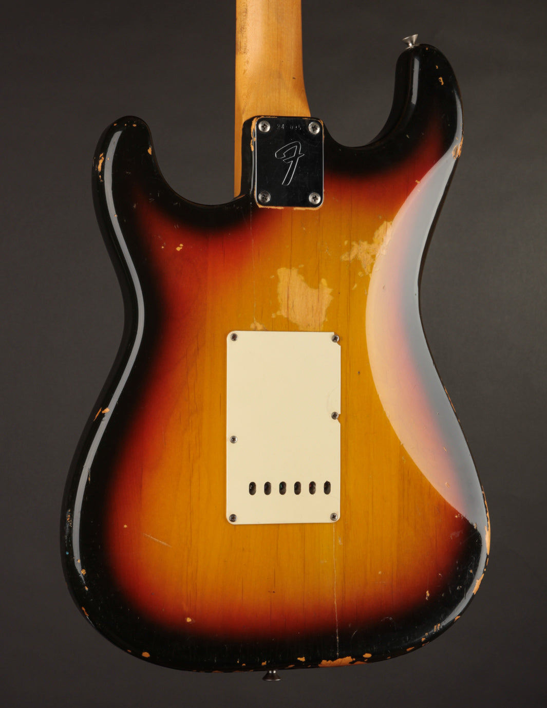 The Alder body is finished in the classic Sunburst that's faded out a bit over the decades, with some beautiful top coat lacquer checking and natural wear throughout. There's a mysterious work order number stamp impressed into the body underneath the pickguard that suggests the guitar was returned to the factory for some sort of repair work, but it doesn't appear that it had anything to do with the body, neck, or finish itself. It's also clear that the guitar was finished after the stamp was made, with clear evidence of finish sunken into the work order number.