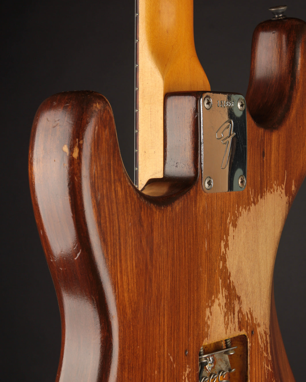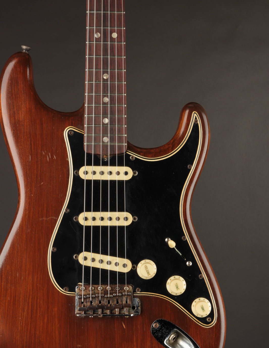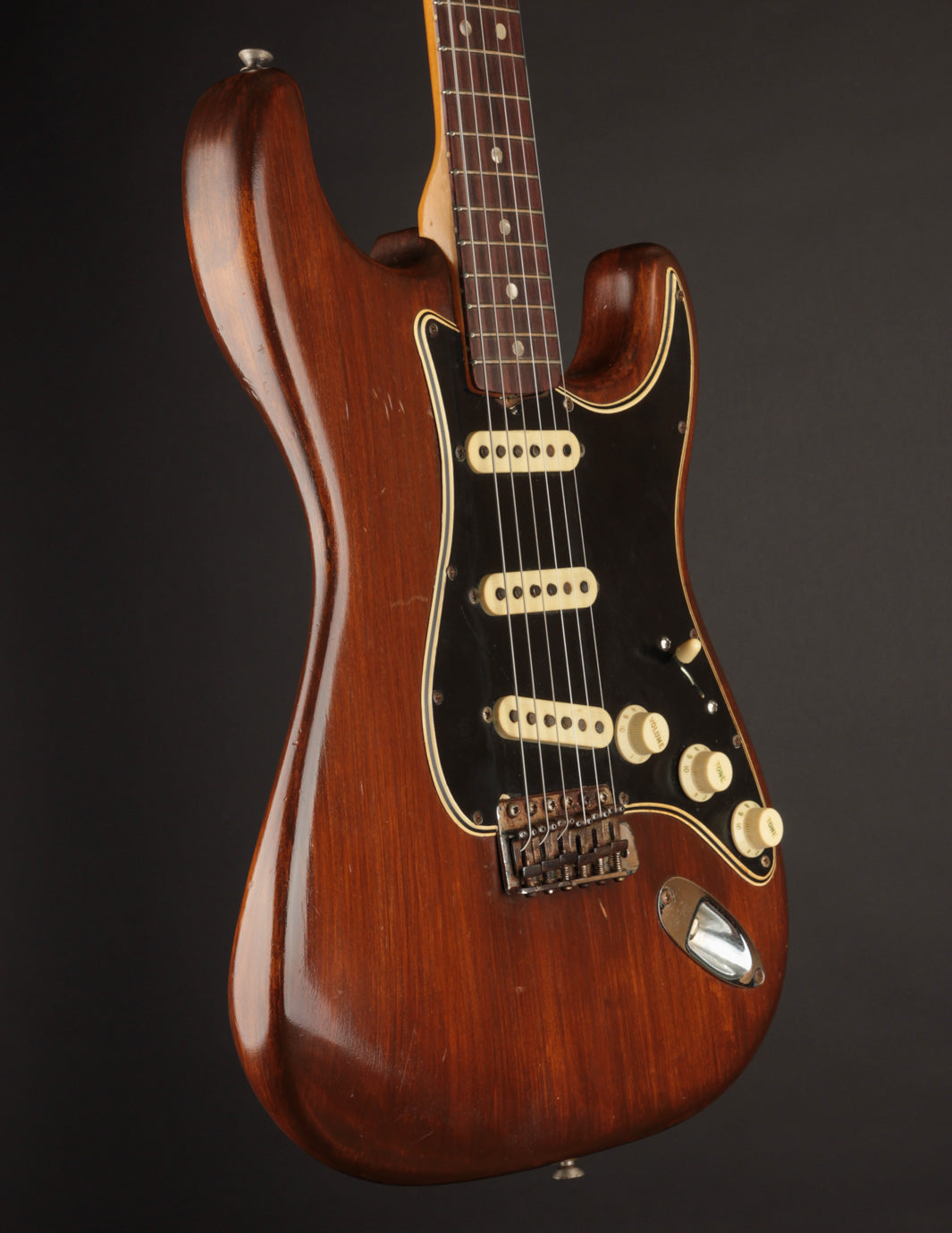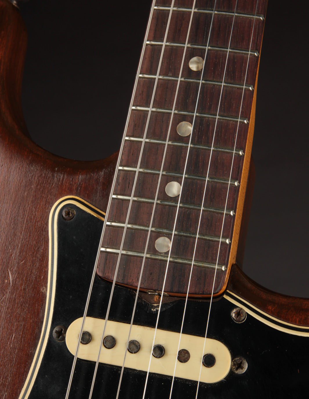 Still, with its original Alder body, Maple neck w/ Rosewood fingerboard, and fabulous sounding grey bottom pickups, it's got a distinctive mid 60s Stratocaster voice and feel. These '66 necks are a joy to play, with what is basically a zero-taper profile that is still round and full. Coming in a couple of ounces under 8lbs, it's quite balanced and has a deep, low-midrange resonant quality about it.