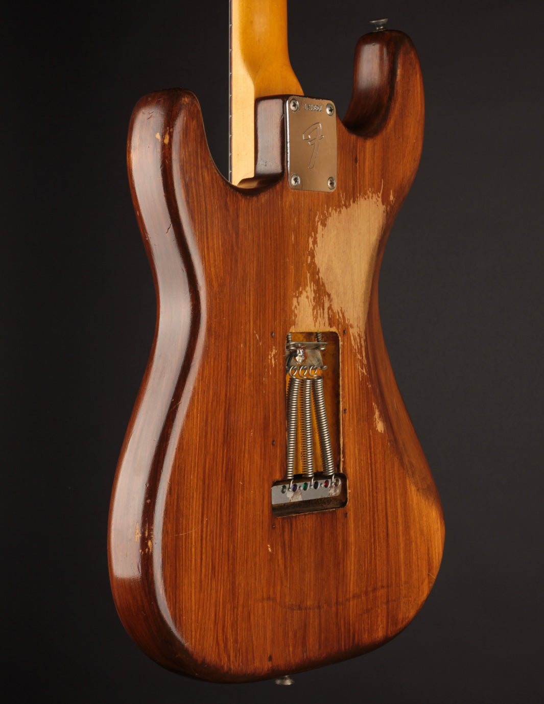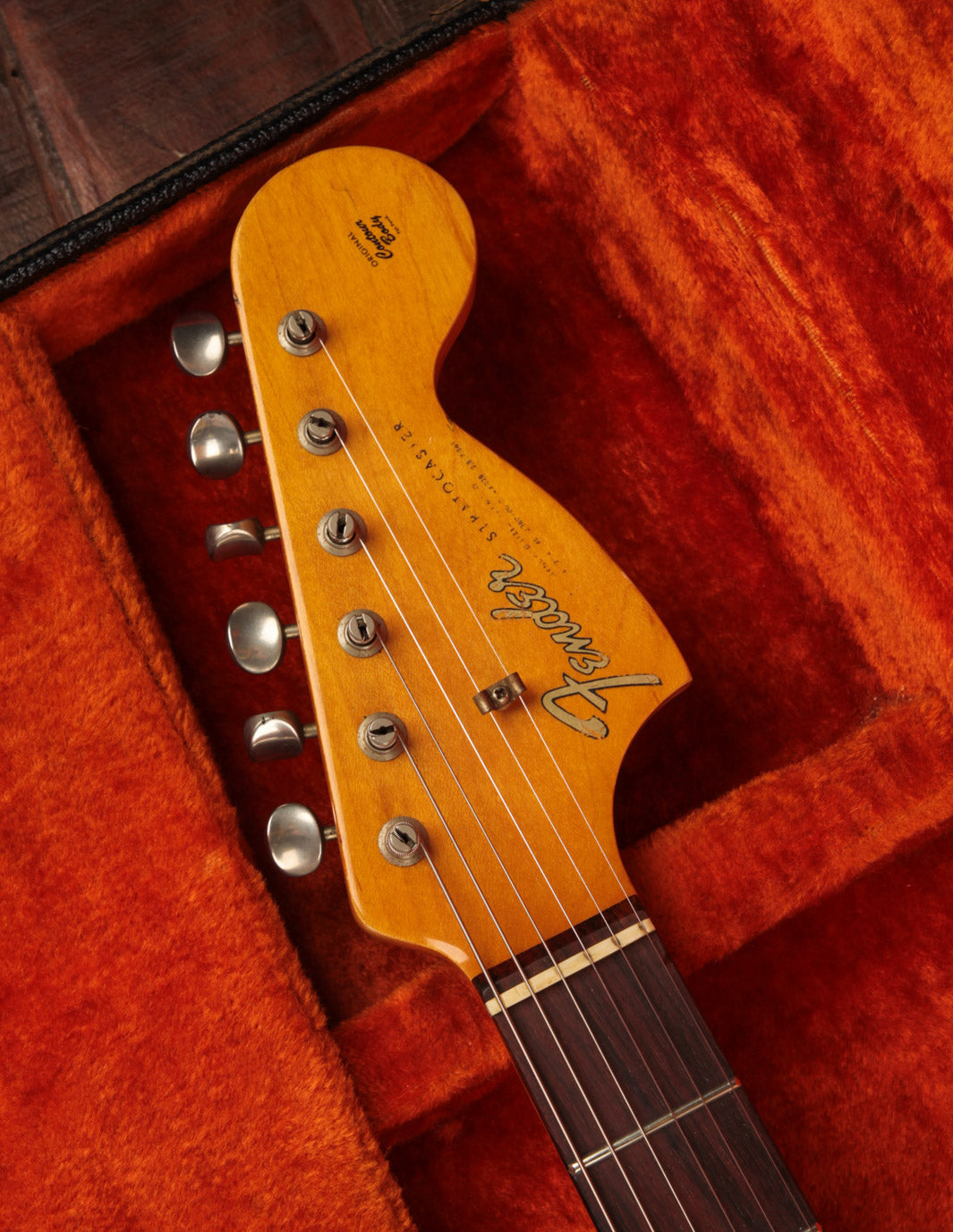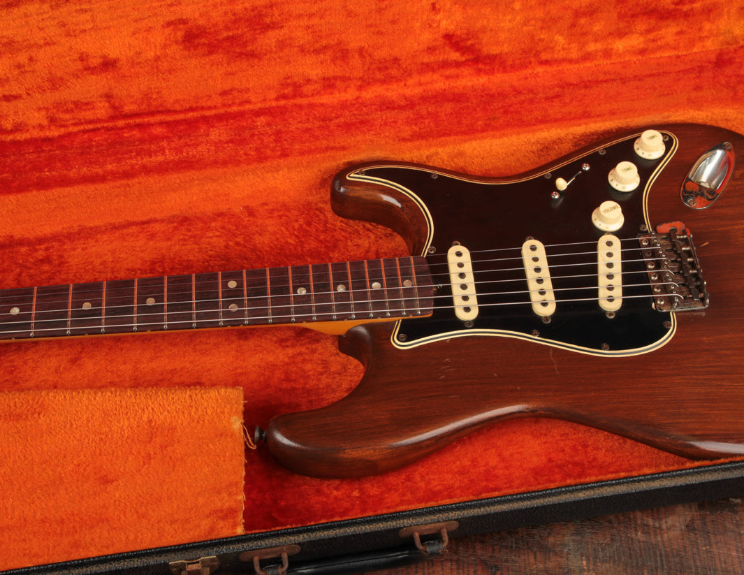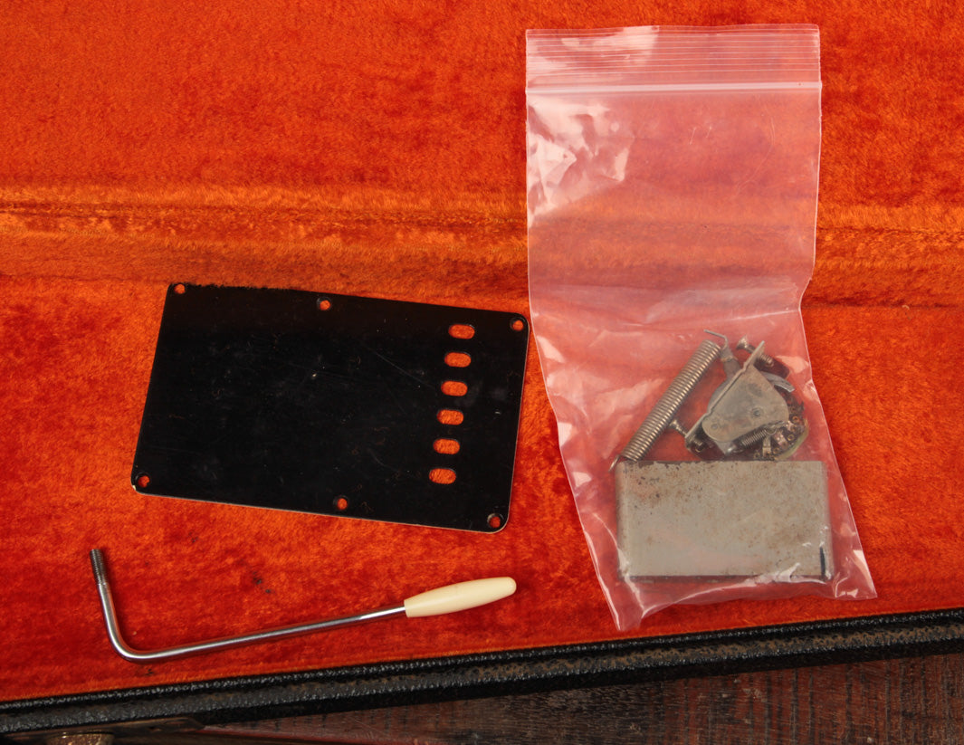 This 1966 Fender Stratocaster was subject to the "hippie refin" craze of the 1970s, where natural wood tone aesthetic boomed and DIY guitar work was nearly as common as mowing your own lawn. We can celebrate, however, that the crude but vibey refinish work was about the most notable change made. Some modified plastics (pickguard and trem cover), a replacement tremolo block (the original is included for those wondering), and the always-popular replacement of the original 3-way switch for a 5-way switch round out some parts changes, while an old pro refret completes the player-grade prerequisite. We'll also point out that the original decal had been removed at some point, with a repro decal added and a light refinish of the peghead face.