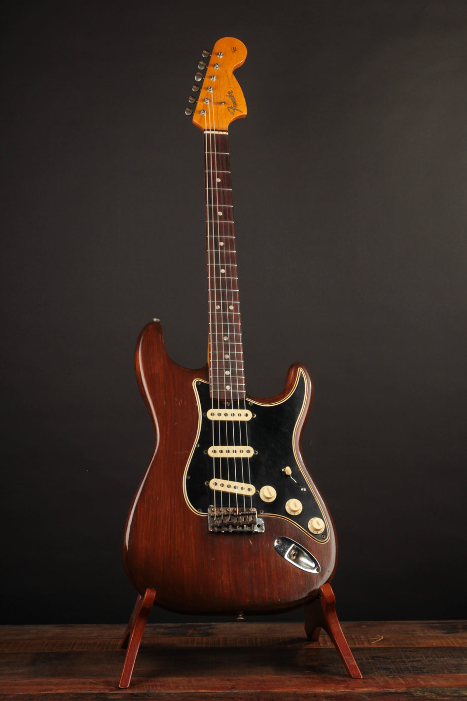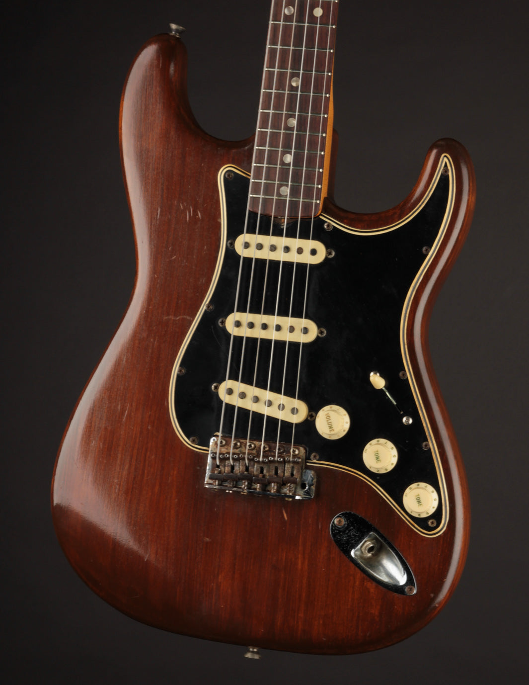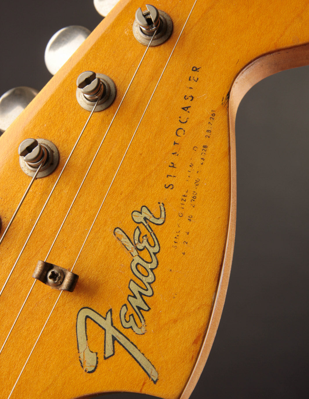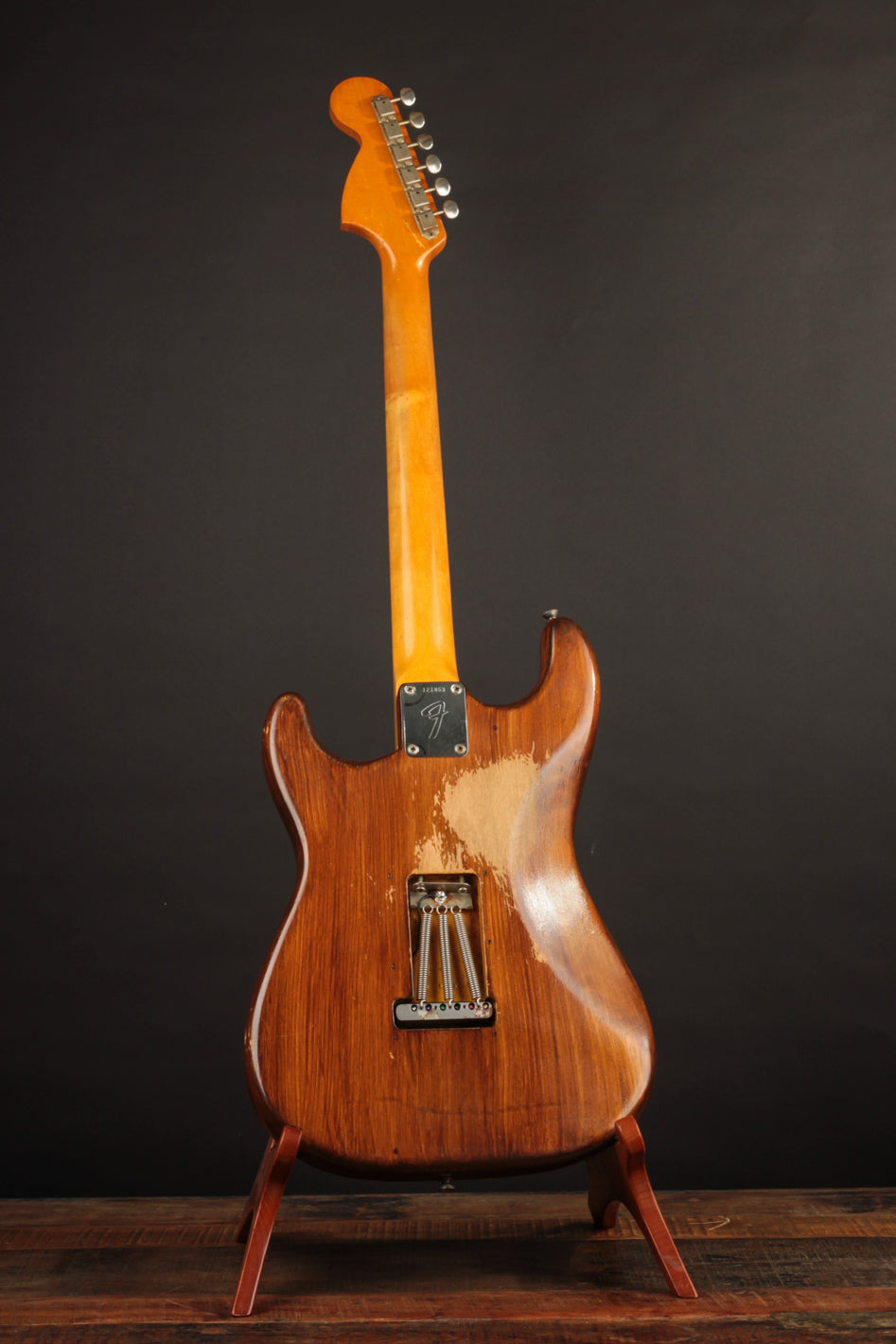 This 1966 Fender Stratocaster was subject to the "hippie refin" craze of the 1970s, where natural wood tone aesthetic boomed and DIY guitar work was nearly as common as mowing your own lawn. We can celebrate, however, that the crude but vibey refinish work was about the most notable change made. Some modified plastics (pickguard and trem cover), a replacement tremolo block (the original is included for those wondering), and the always-popular replacement of the original 3-way switch for a 5-way switch round out some parts changes, while an old pro refret completes the player-grade prerequisite. We'll also point out that the original decal had been removed at some point, with a repro decal added and a light refinish of the peghead face.
