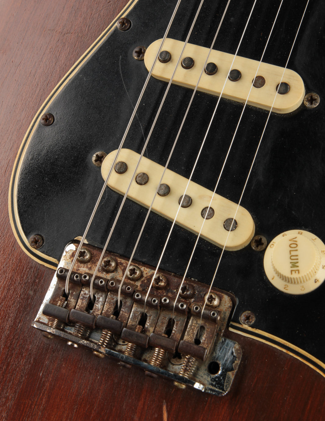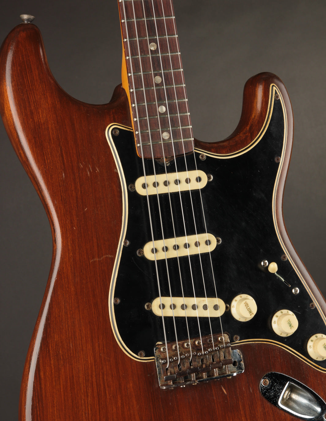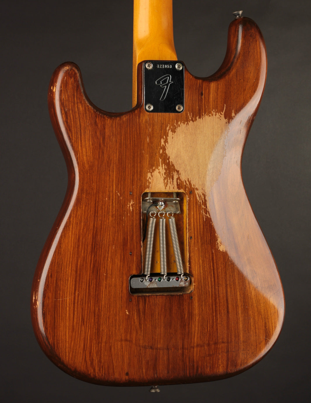 This 1966 Fender Stratocaster was subject to the "hippie refin" craze of the 1970s, where natural wood tone aesthetic boomed and DIY guitar work was nearly as common as mowing your own lawn. We can celebrate, however, that the crude but vibey refinish work was about the most notable change made. Some modified plastics (pickguard and trem cover), a replacement tremolo block (the original is included for those wondering), and the always-popular replacement of the original 3-way switch for a 5-way switch round out some parts changes, while an old pro refret completes the player-grade prerequisite. We'll also point out that the original decal had been removed at some point, with a repro decal added and a light refinish of the peghead face.