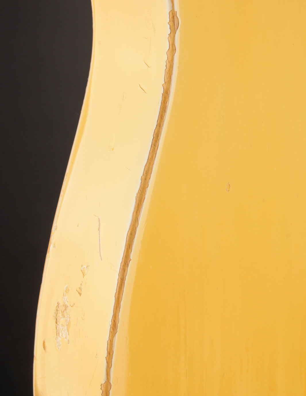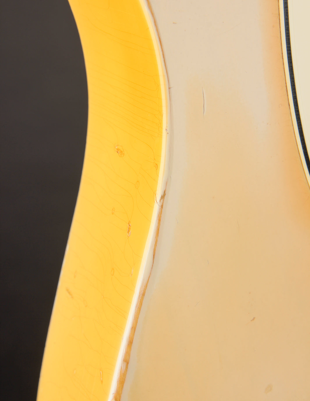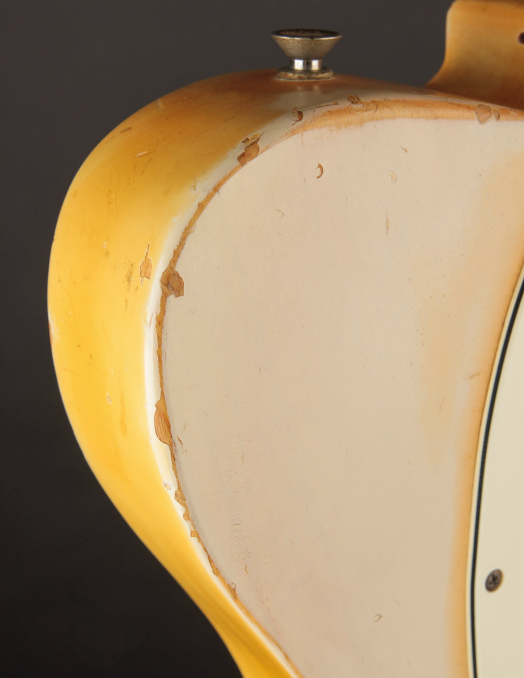 This guitar has certainly seen some playtime throughout its life, with some honest earned finish wear (mostly on the top) where the lacquer top coat had worn through into the Olympic White for some really dramatic contrasting. The back of the body likely suffered the same or worse in terms of contact wear, and looks to have had some lacquer brushed on to "preserve" the original finish. It's not the most glamorous touch-up work, but indicative of some old DIY approach that hasn't really compromised the instrument.