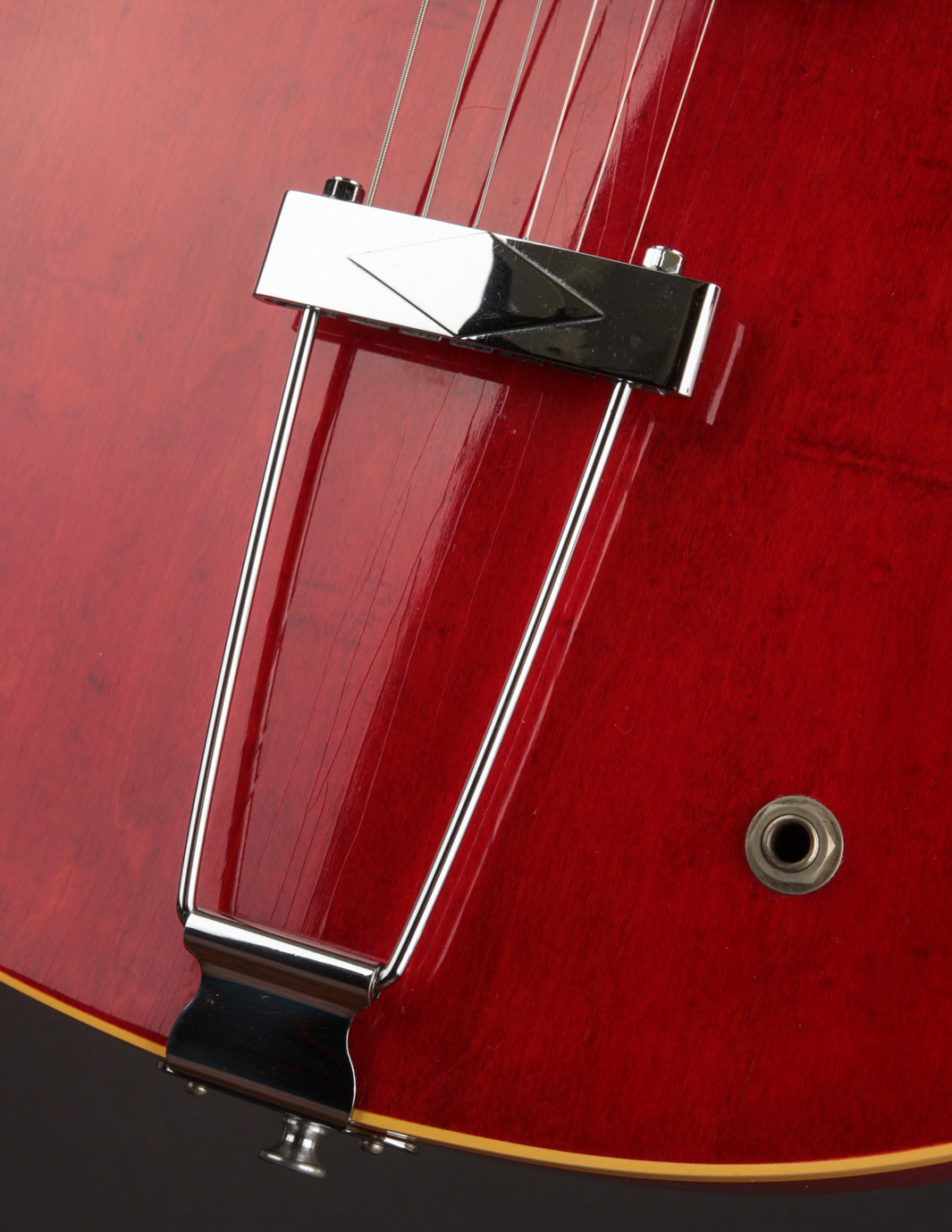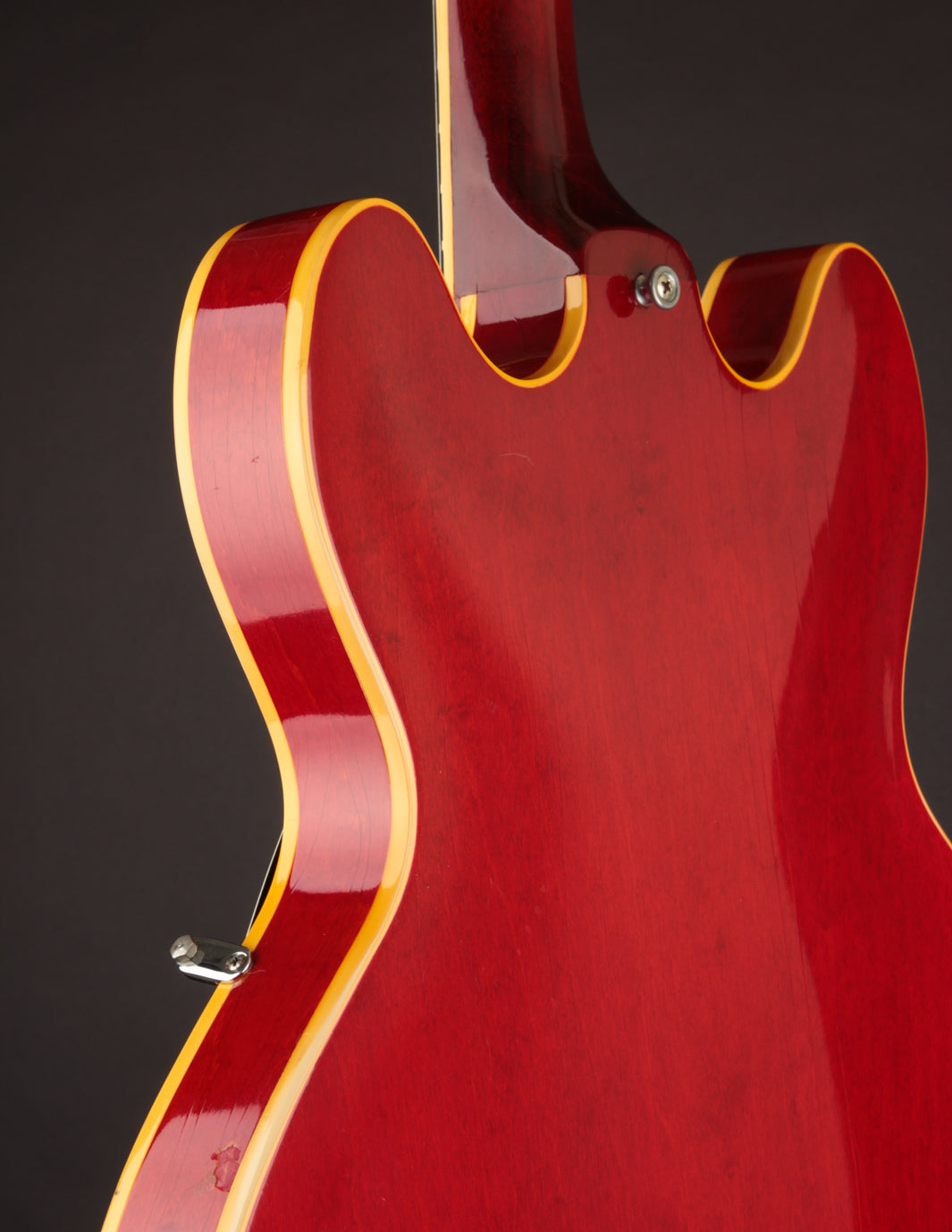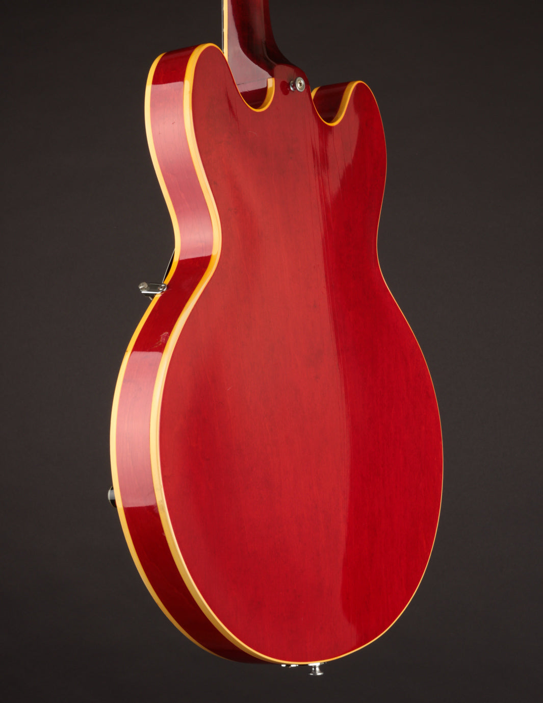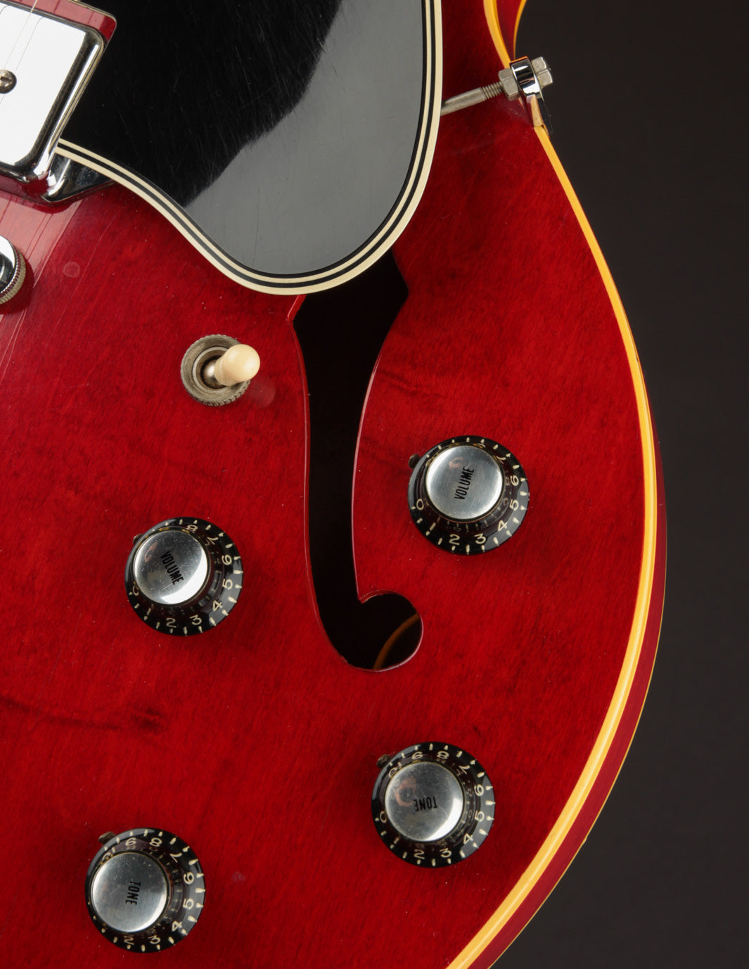 This ES-330 hasn't seen much play time in its life as evidenced by how clean it is. The unfaded Cherry finish is still incredibly vibrant despite some light lacquer checking throughout, as is all of the original chrome plated hardware throughout. The original reflector knobs appear almost New Old Stock with how clear and defined the lettering is. An original nylon saddled ABR-1 works perfectly and allows for clean string movement from the trapeze tailpiece all the way to the original nut.