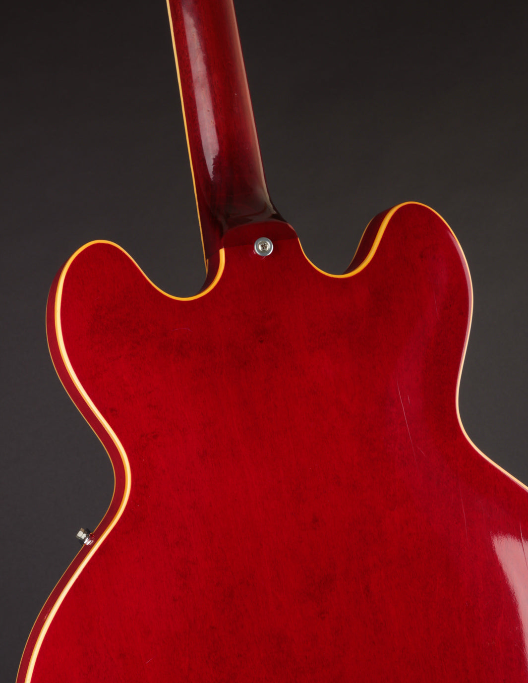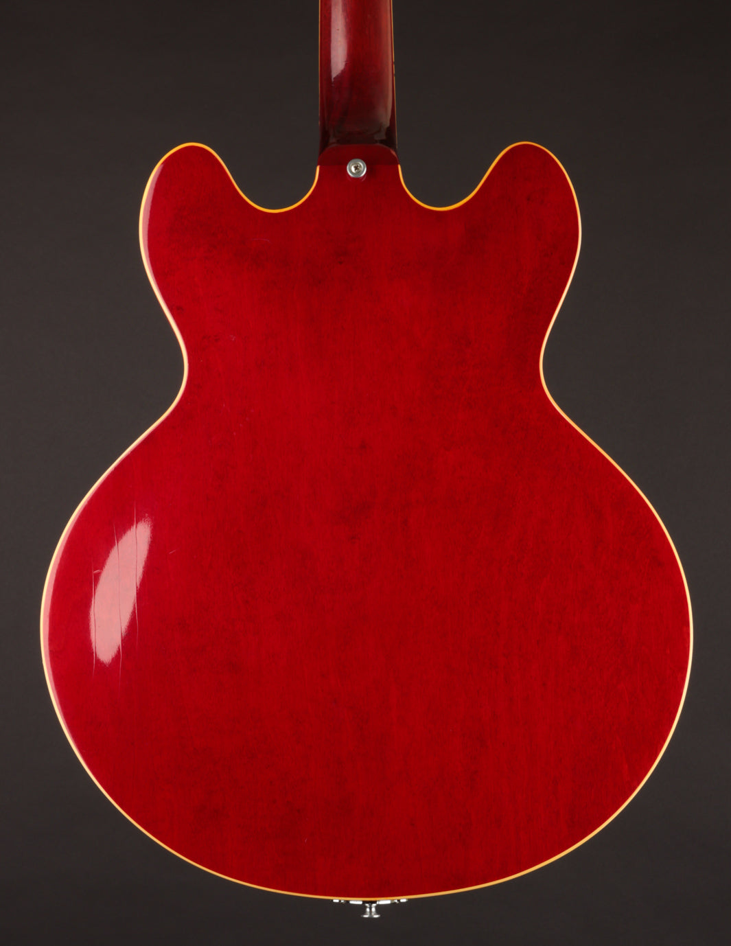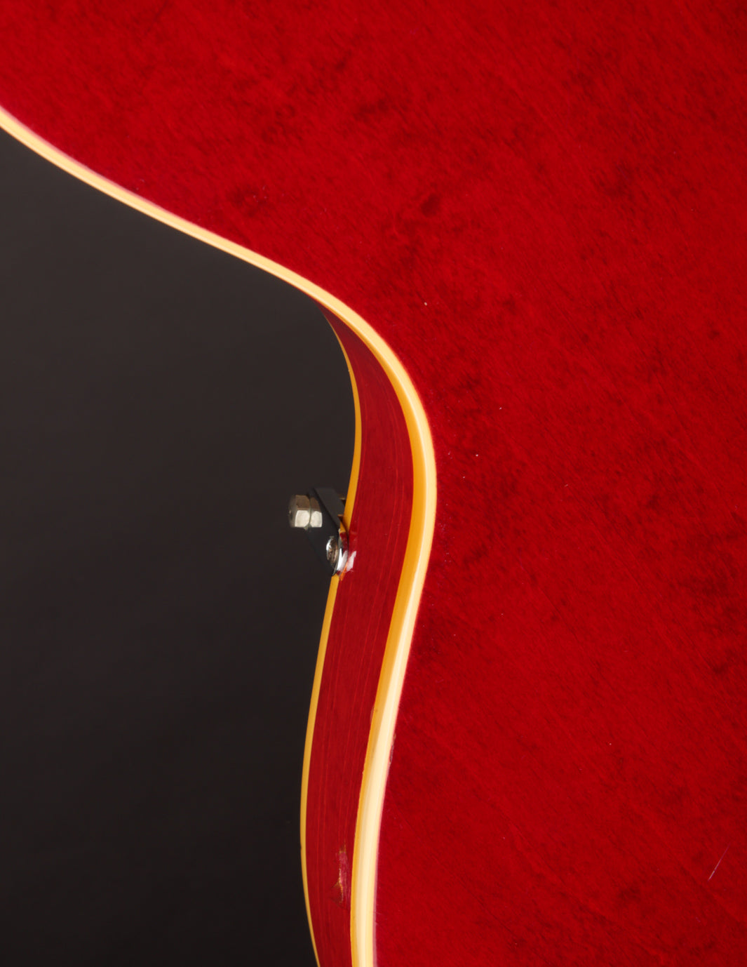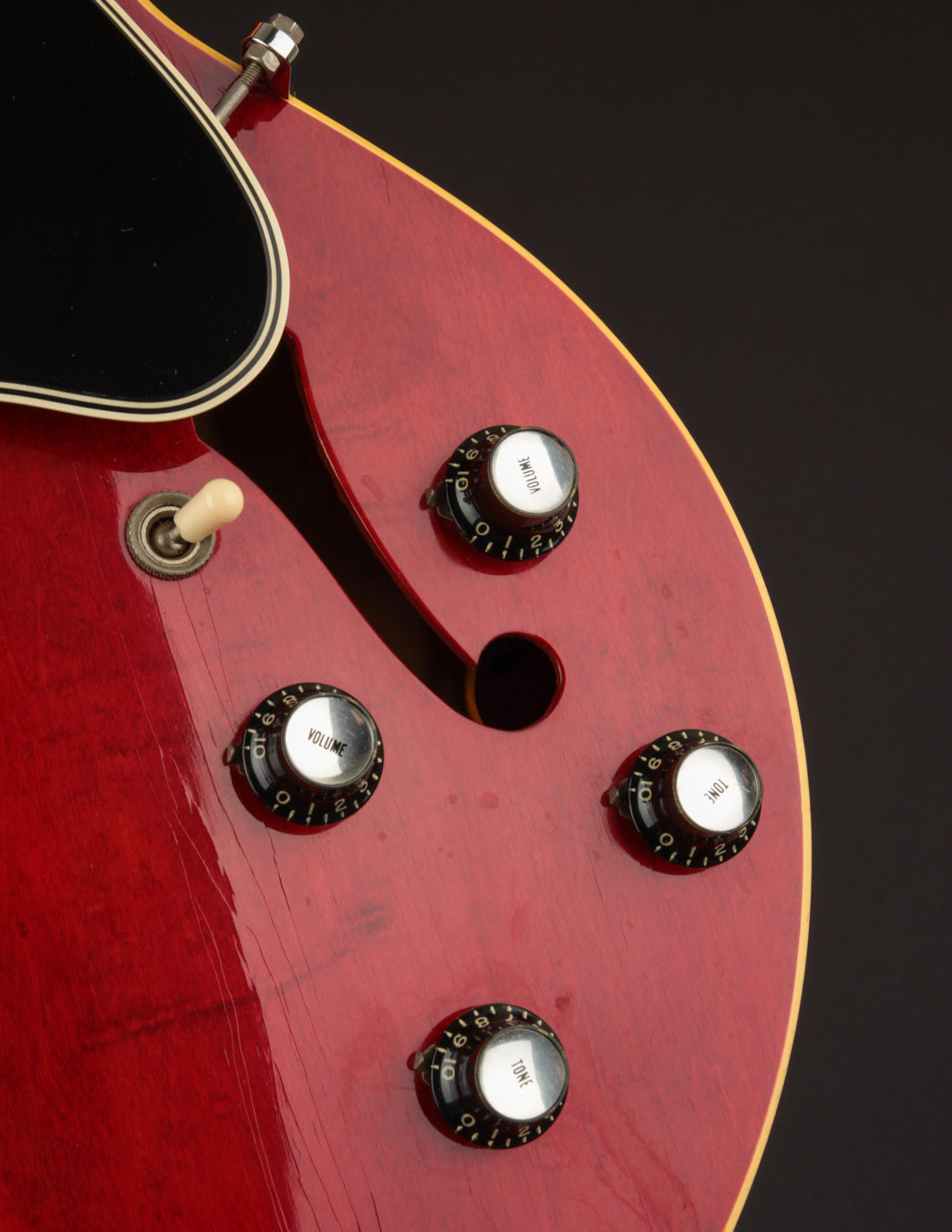 This ES-330 hasn't seen much play time in its life as evidenced by how clean it is. The unfaded Cherry finish is still incredibly vibrant despite some light lacquer checking throughout, as is all of the original chrome plated hardware throughout. The original reflector knobs appear almost New Old Stock with how clear and defined the lettering is. An original nylon saddled ABR-1 works perfectly and allows for clean string movement from the trapeze tailpiece all the way to the original nut.