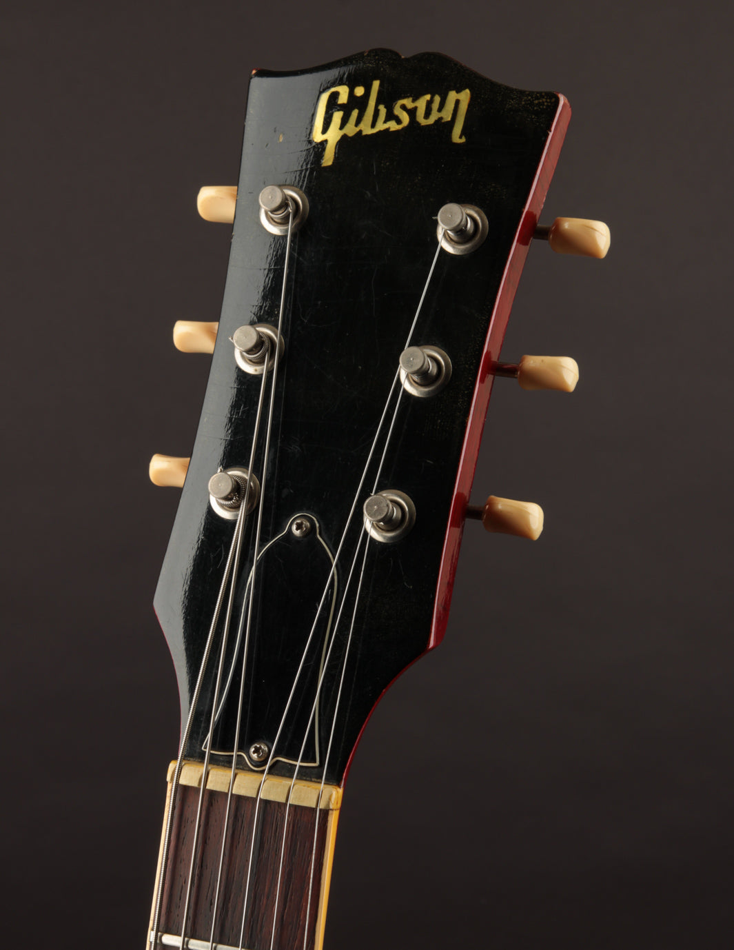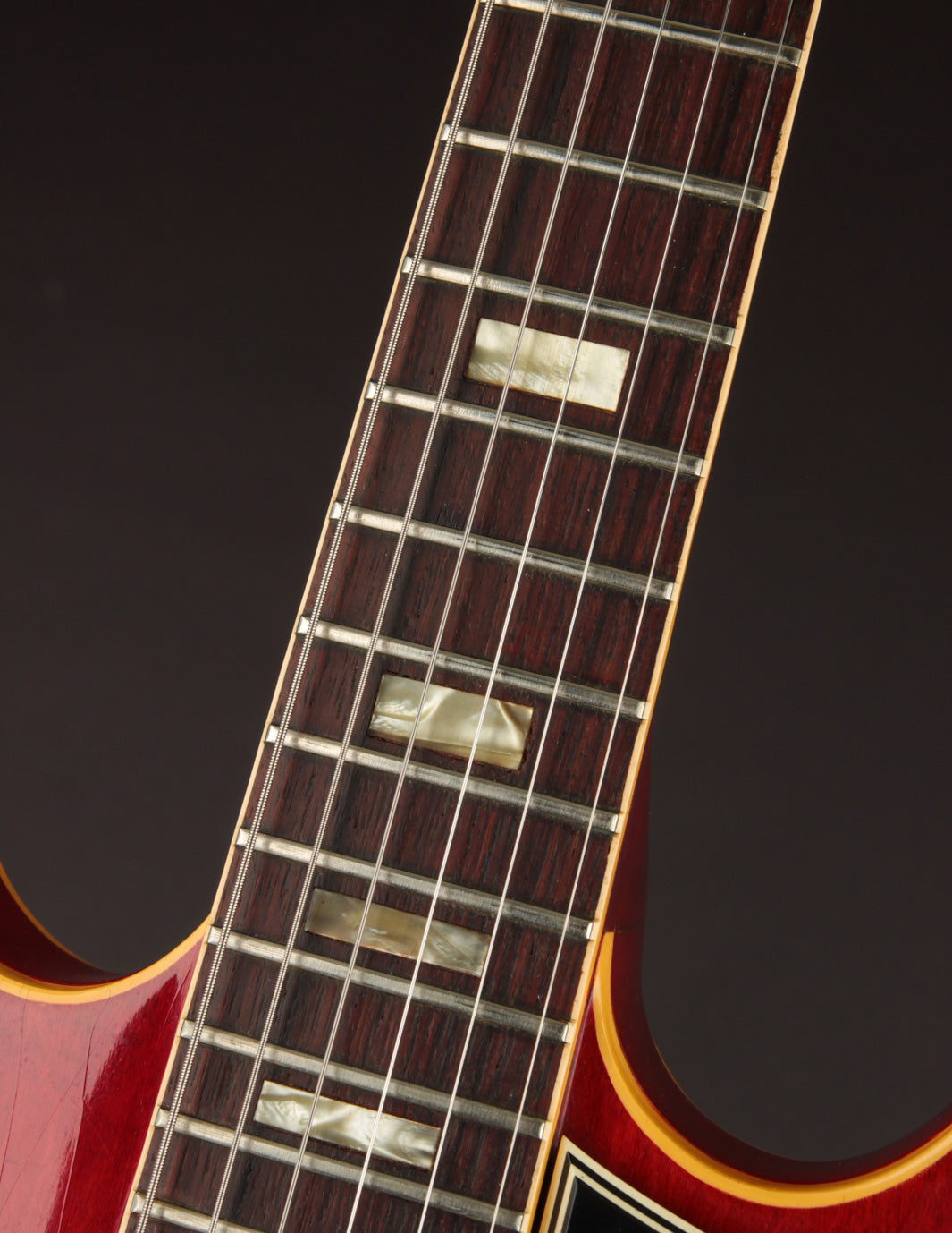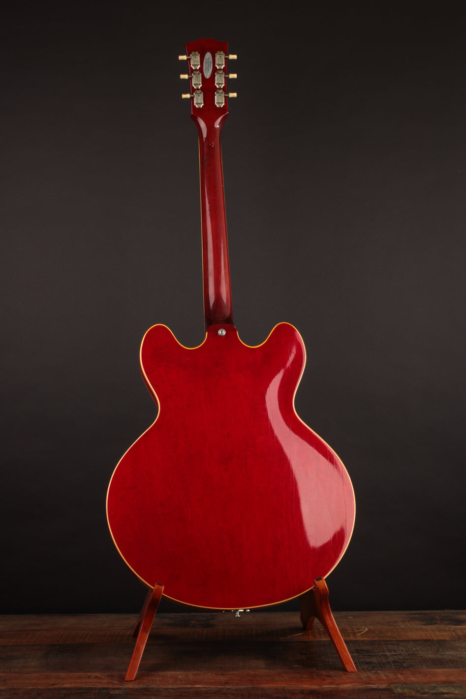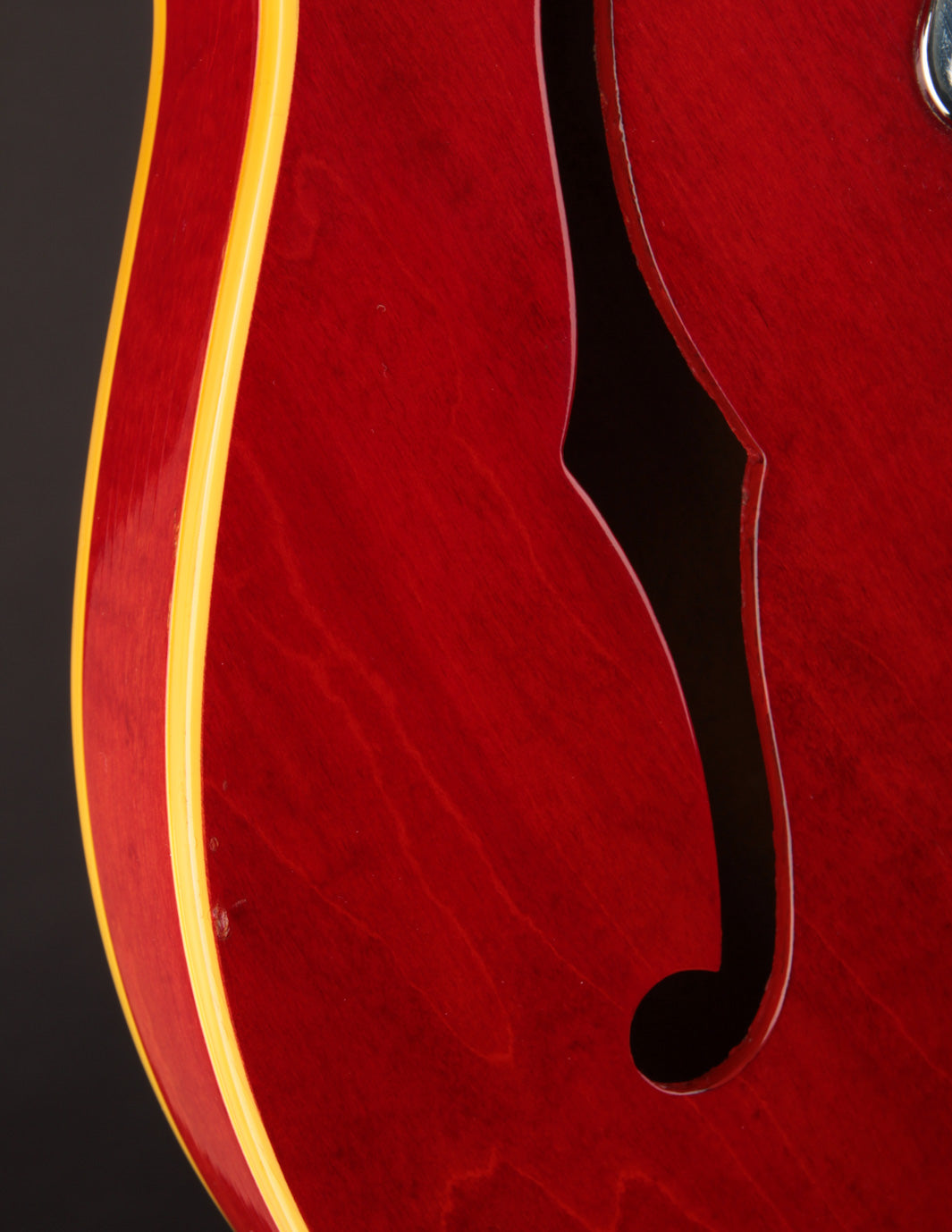 This ES-330 hasn't seen much play time in its life as evidenced by how clean it is. The unfaded Cherry finish is still incredibly vibrant despite some light lacquer checking throughout, as is all of the original chrome plated hardware throughout. The original reflector knobs appear almost New Old Stock with how clear and defined the lettering is. An original nylon saddled ABR-1 works perfectly and allows for clean string movement from the trapeze tailpiece all the way to the original nut.