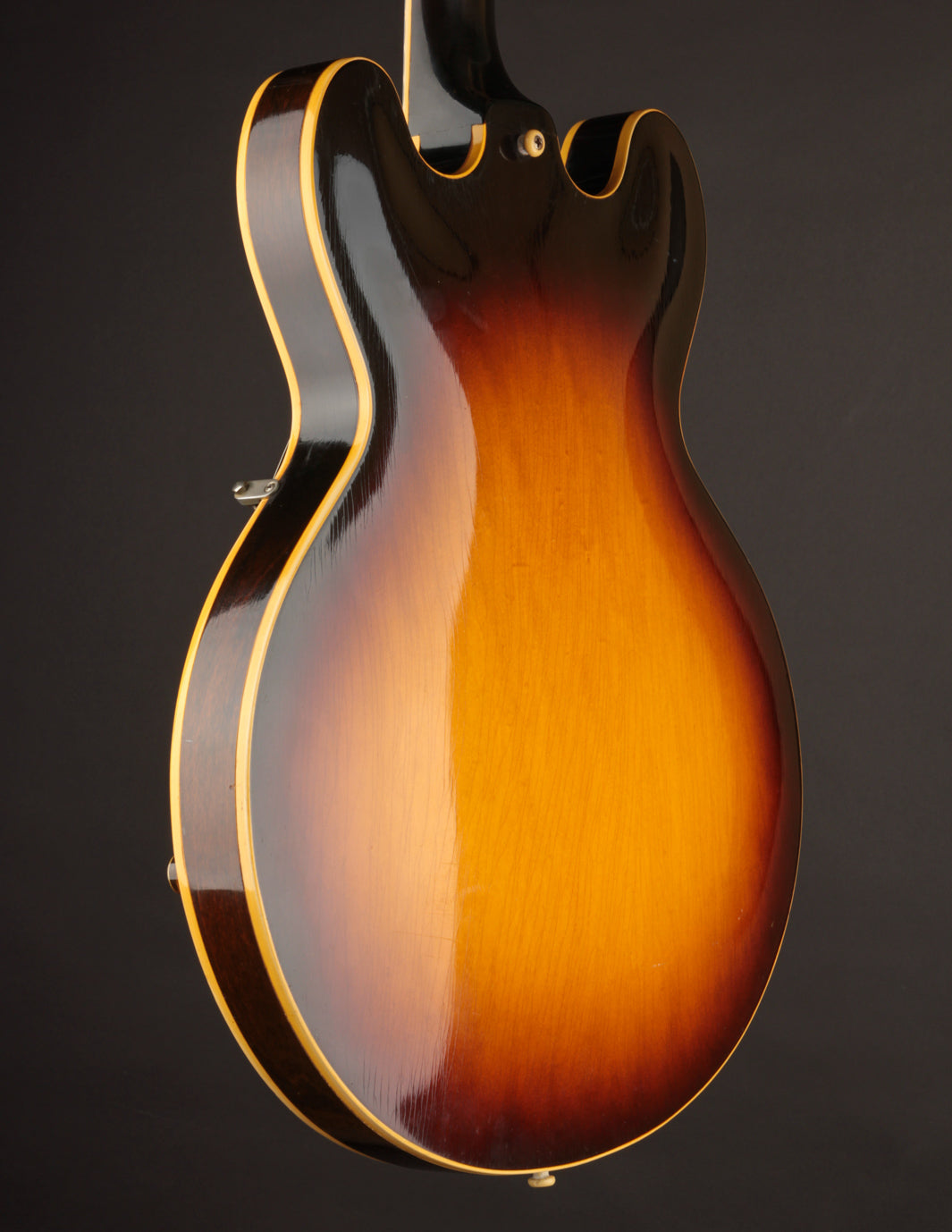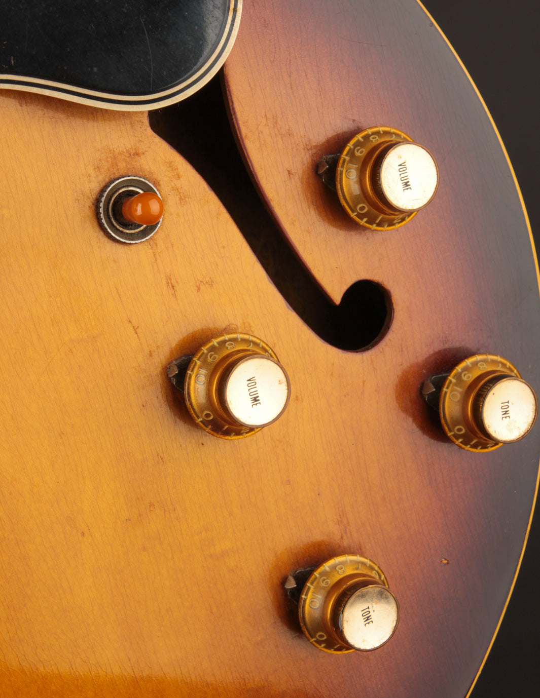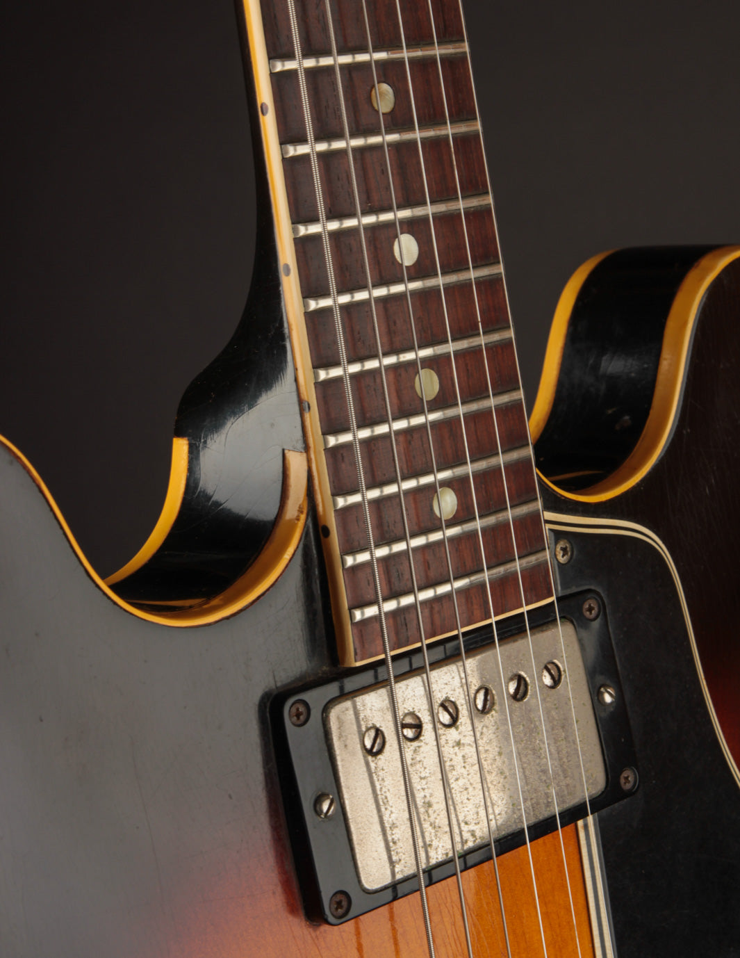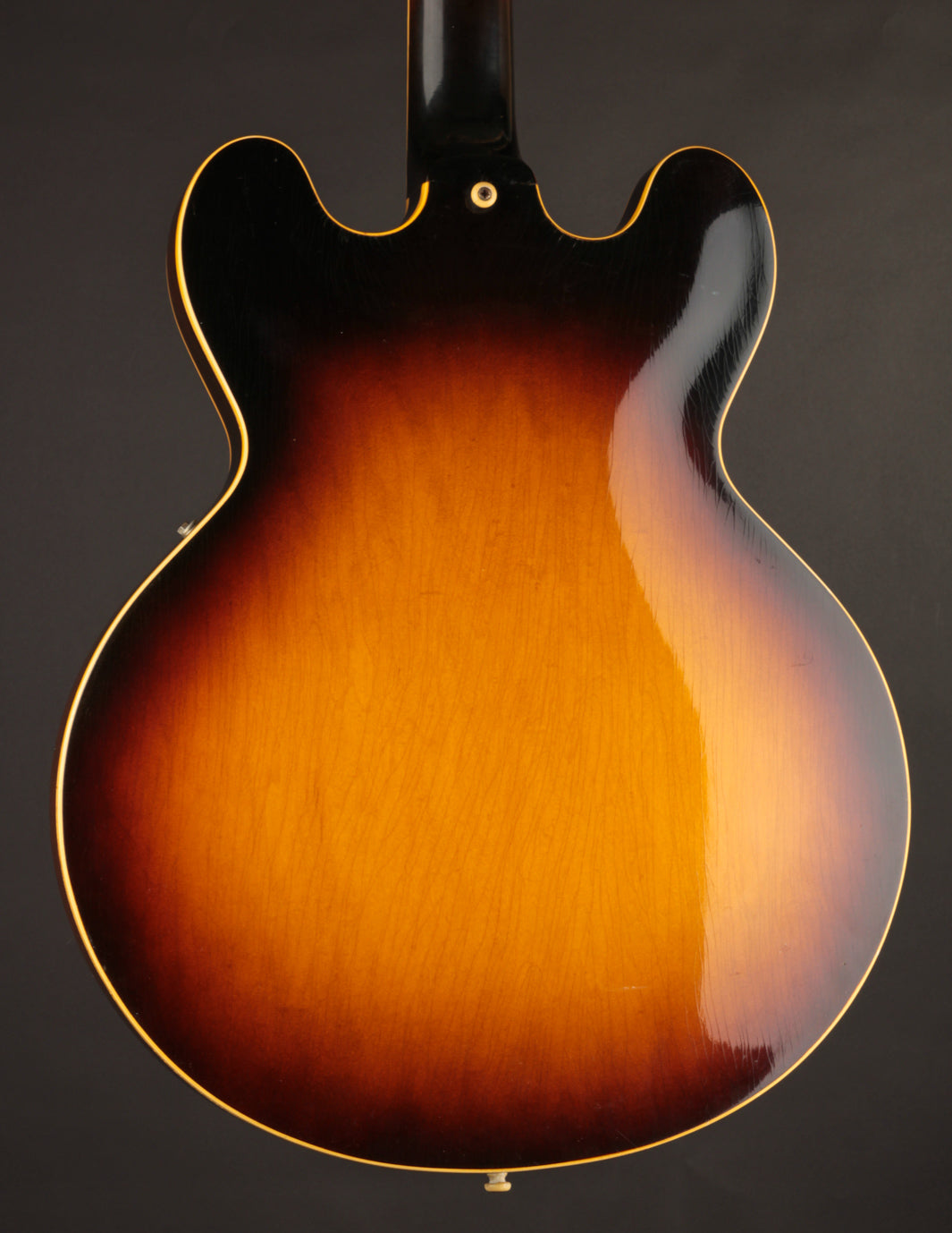 While the thin-top 335s from early 1959 have their own unique acoustic sound and energy (see the very early '59 ES-355 in our inventory), it's the ES guitars from later in '59 and onward that establish the final top thickness resulting in not only a sturdier structural design, but yielding a punchier, more focused and immediate sounding guitar. When paired up with some original PAF humbuckers, it's easy to understand why so many of the 335s from this period get nicknamed "Burst Killers".