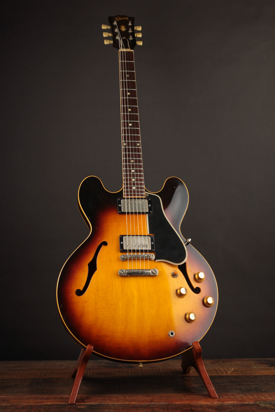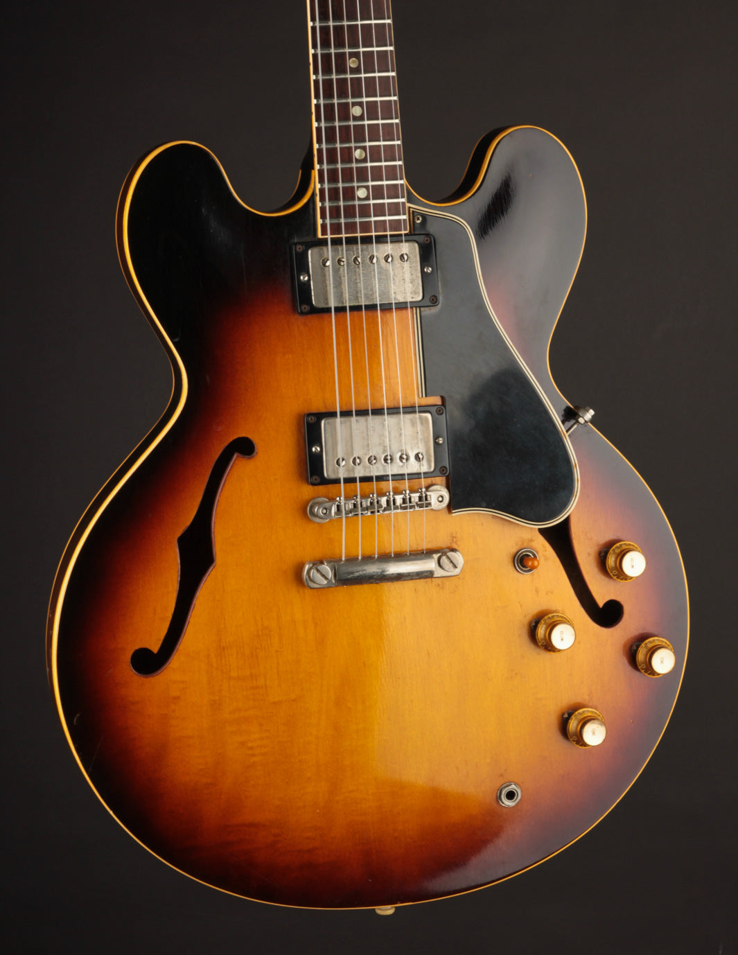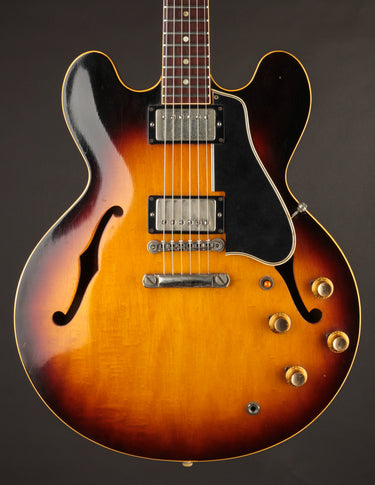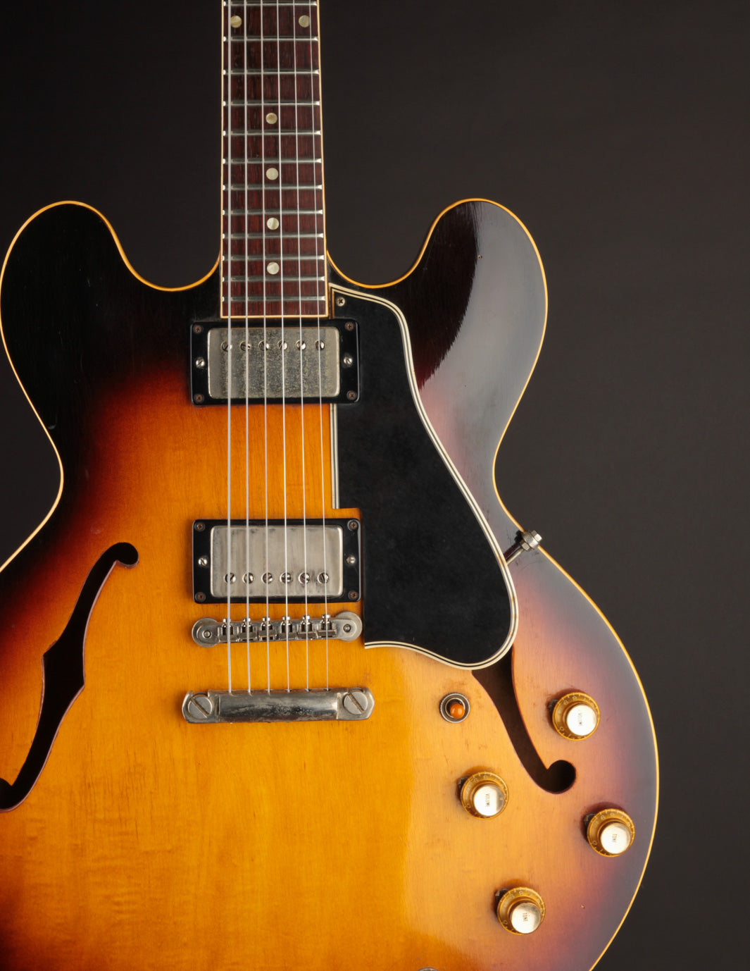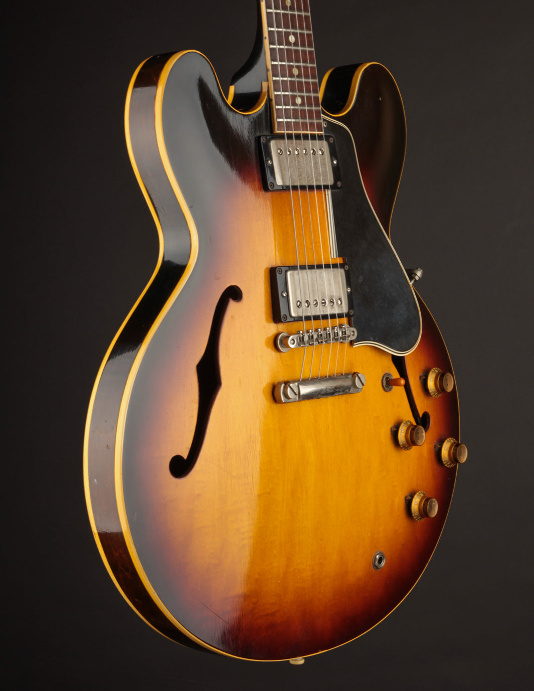 While the thin-top 335s from early 1959 have their own unique acoustic sound and energy (see the very early '59 ES-355 in our inventory), it's the ES guitars from later in '59 and onward that establish the final top thickness resulting in not only a sturdier structural design, but yielding a punchier, more focused and immediate sounding guitar. When paired up with some original PAF humbuckers, it's easy to understand why so many of the 335s from this period get nicknamed "Burst Killers".
