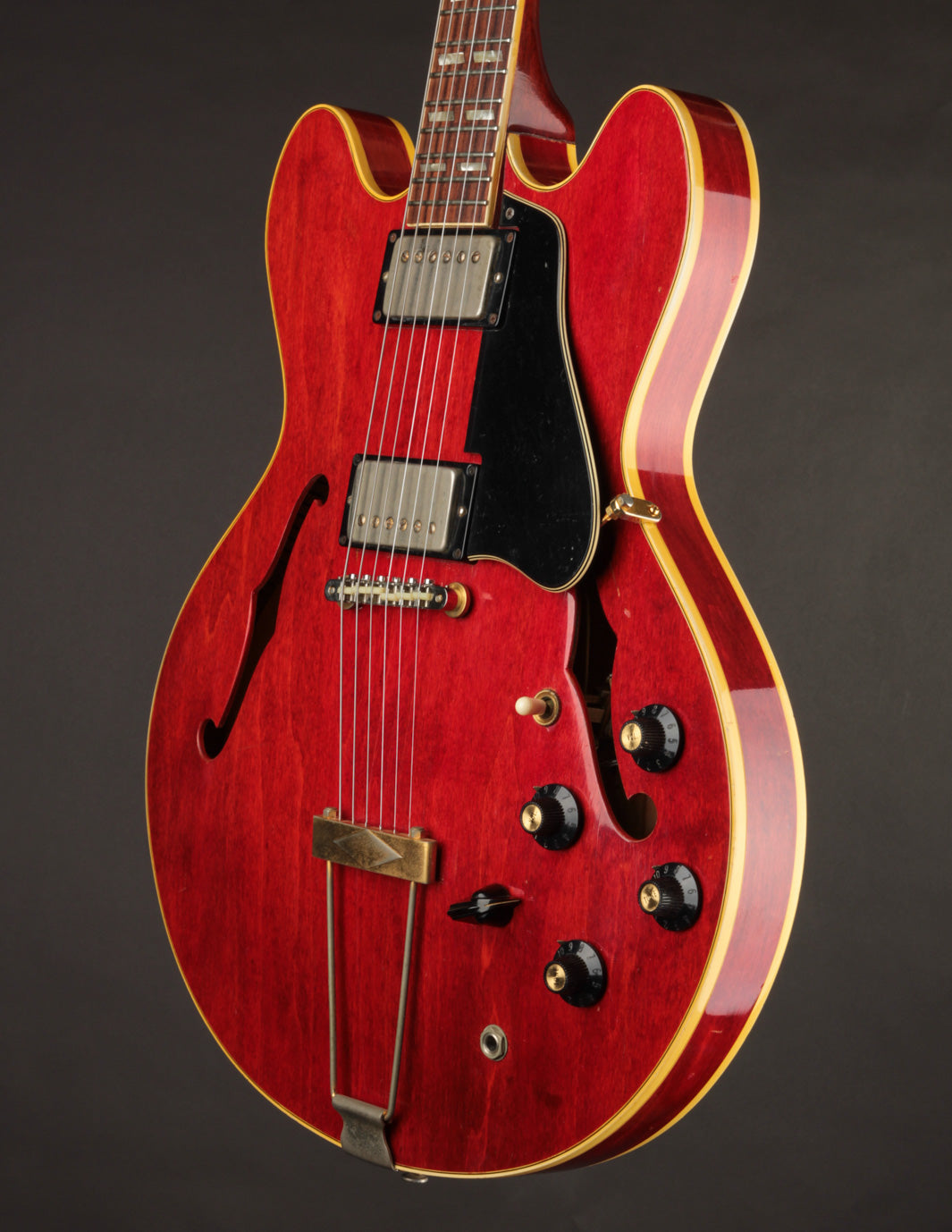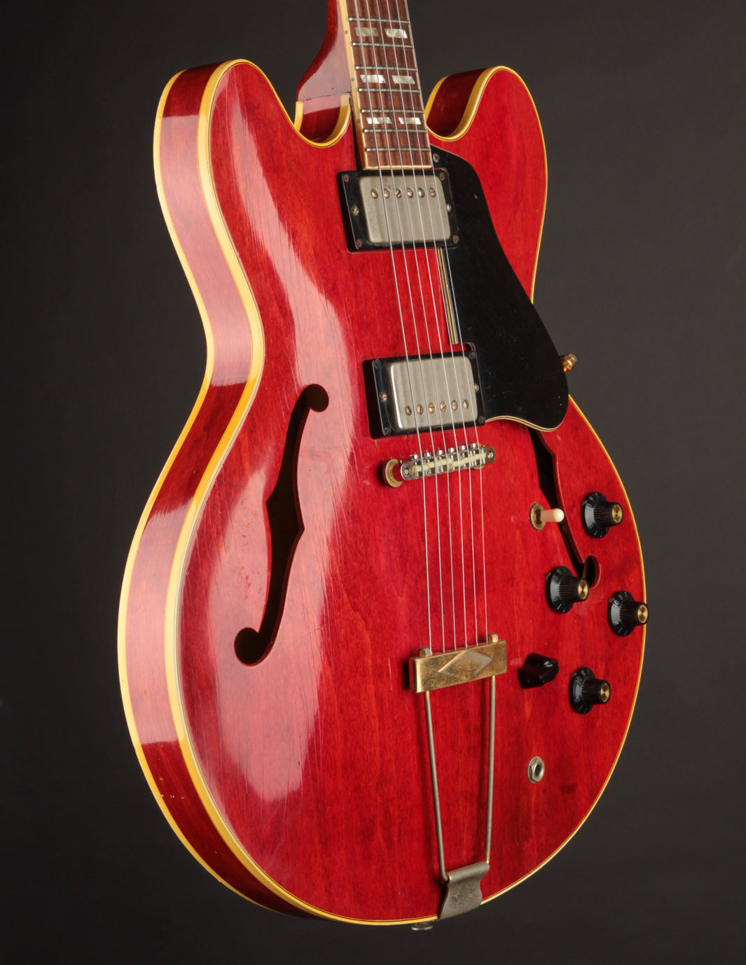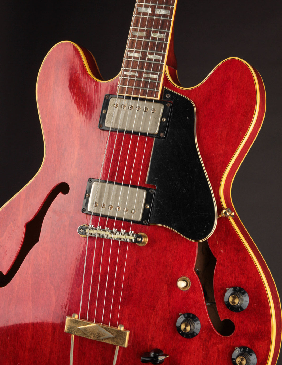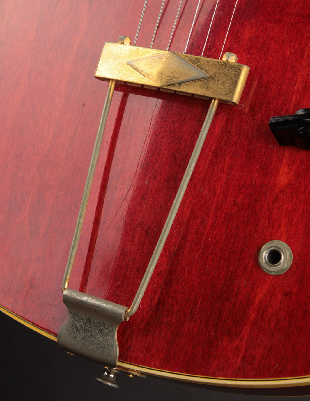 The original tuners and trapeze tailpiece show off a good deal of their original gold plating, with the latter having slightly more contact wear and patina. The ABR-1 is a quality replacement as are the control knobs, but the pickguard, switch tip, and truss rod cover are original to the guitar. The original varitone potentiometer was left installed, disconnected, with its chicken head knob in place.
