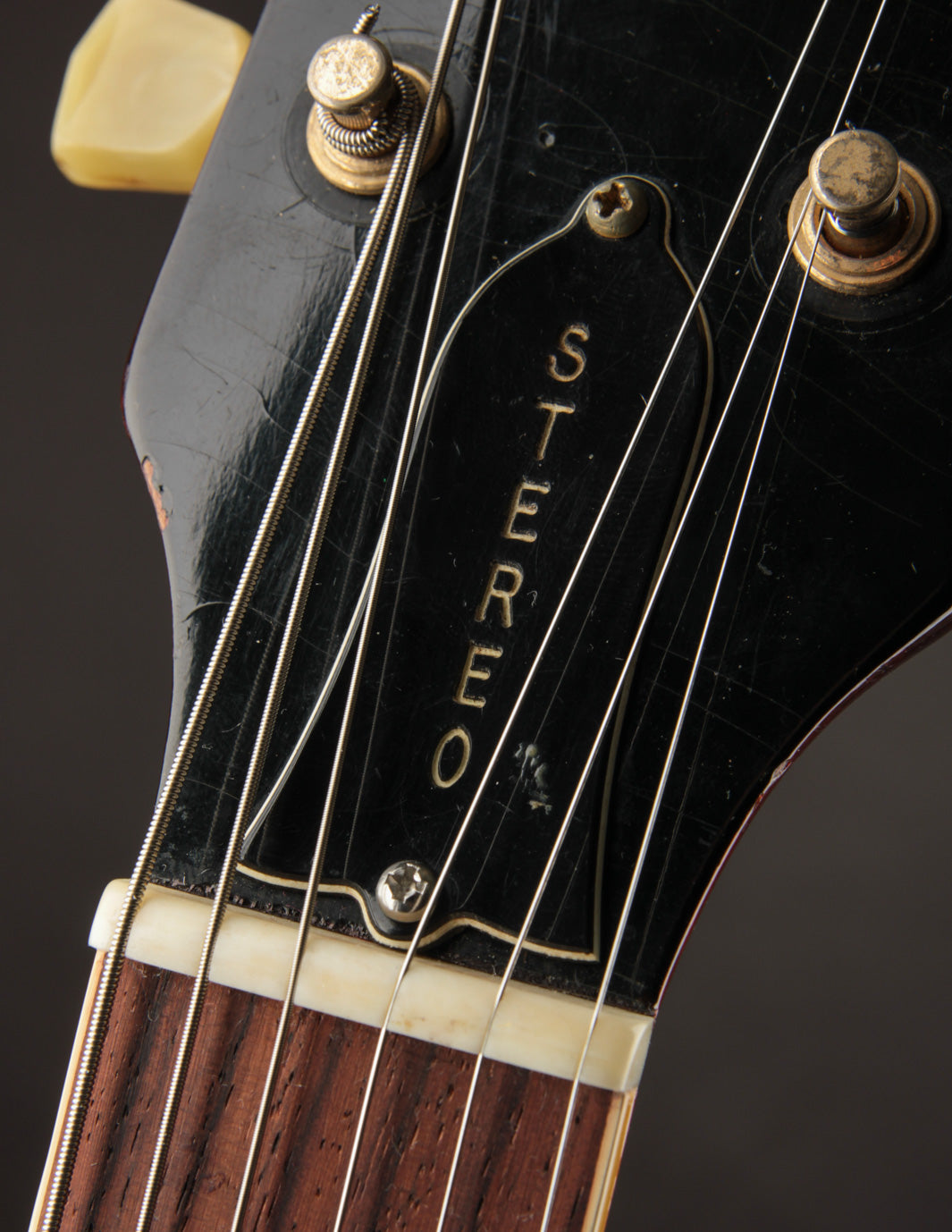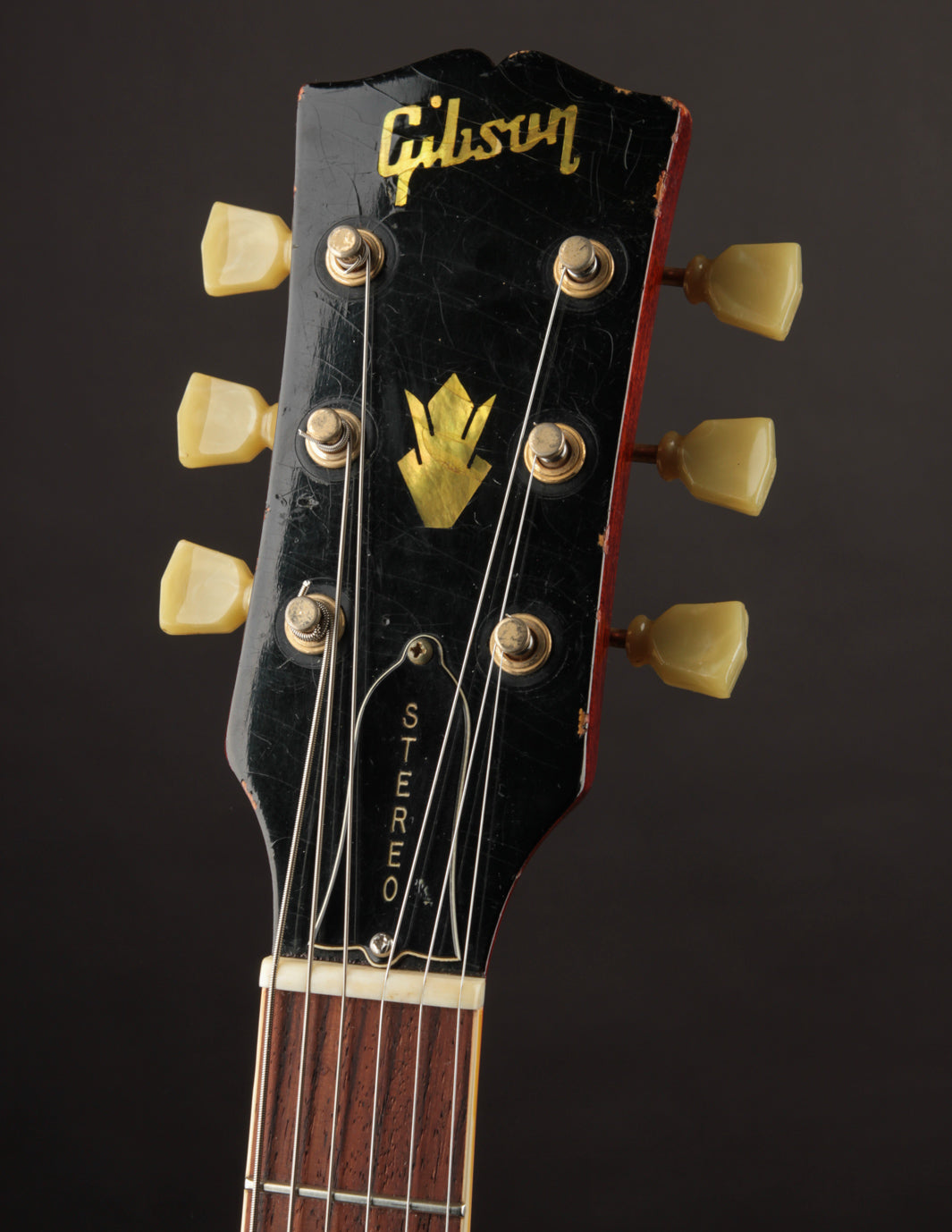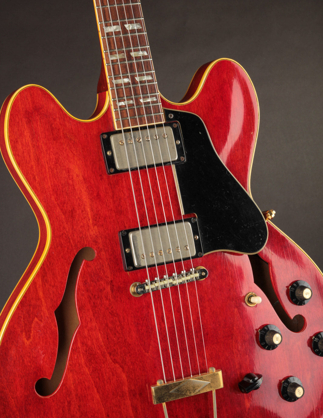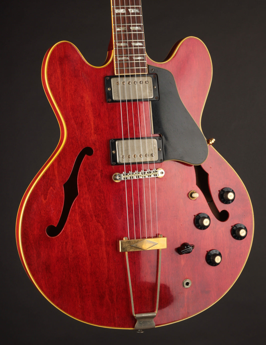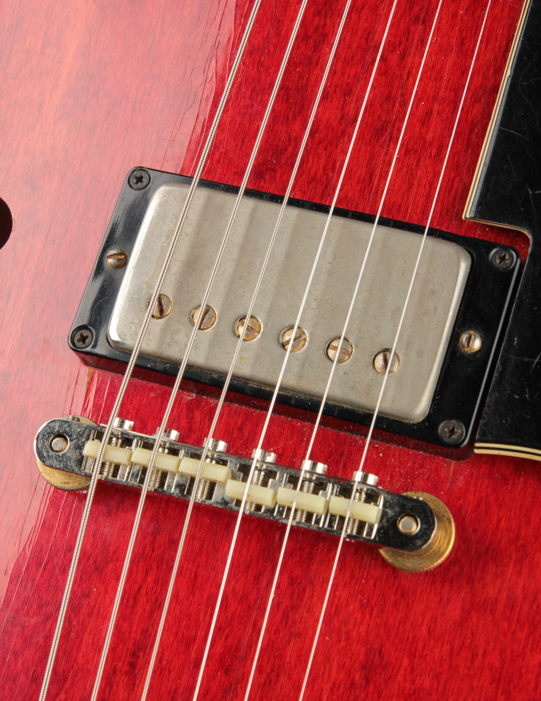 The original tuners and trapeze tailpiece show off a good deal of their original gold plating, with the latter having slightly more contact wear and patina. The ABR-1 is a quality replacement as are the control knobs, but the pickguard, switch tip, and truss rod cover are original to the guitar. The original varitone potentiometer was left installed, disconnected, with its chicken head knob in place.