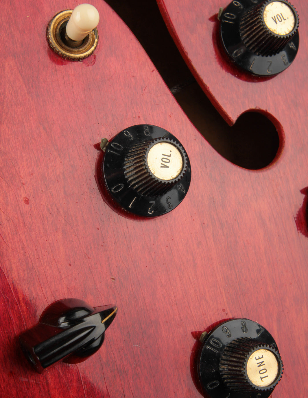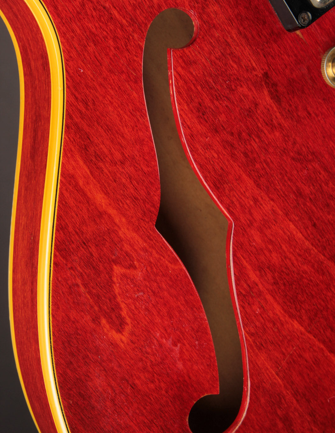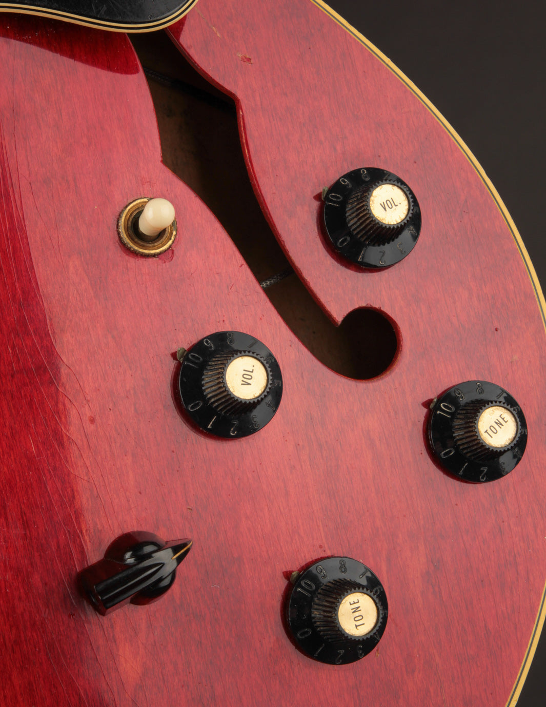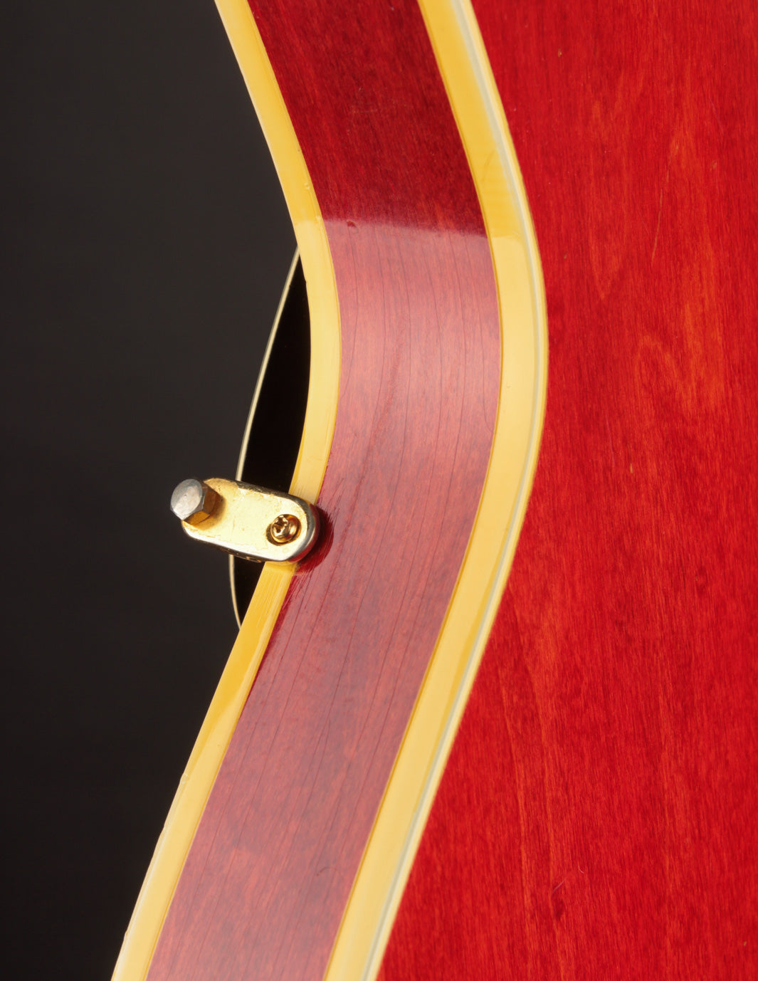 The original tuners and trapeze tailpiece show off a good deal of their original gold plating, with the latter having slightly more contact wear and patina. The ABR-1 is a quality replacement as are the control knobs, but the pickguard, switch tip, and truss rod cover are original to the guitar. The original varitone potentiometer was left installed, disconnected, with its chicken head knob in place.