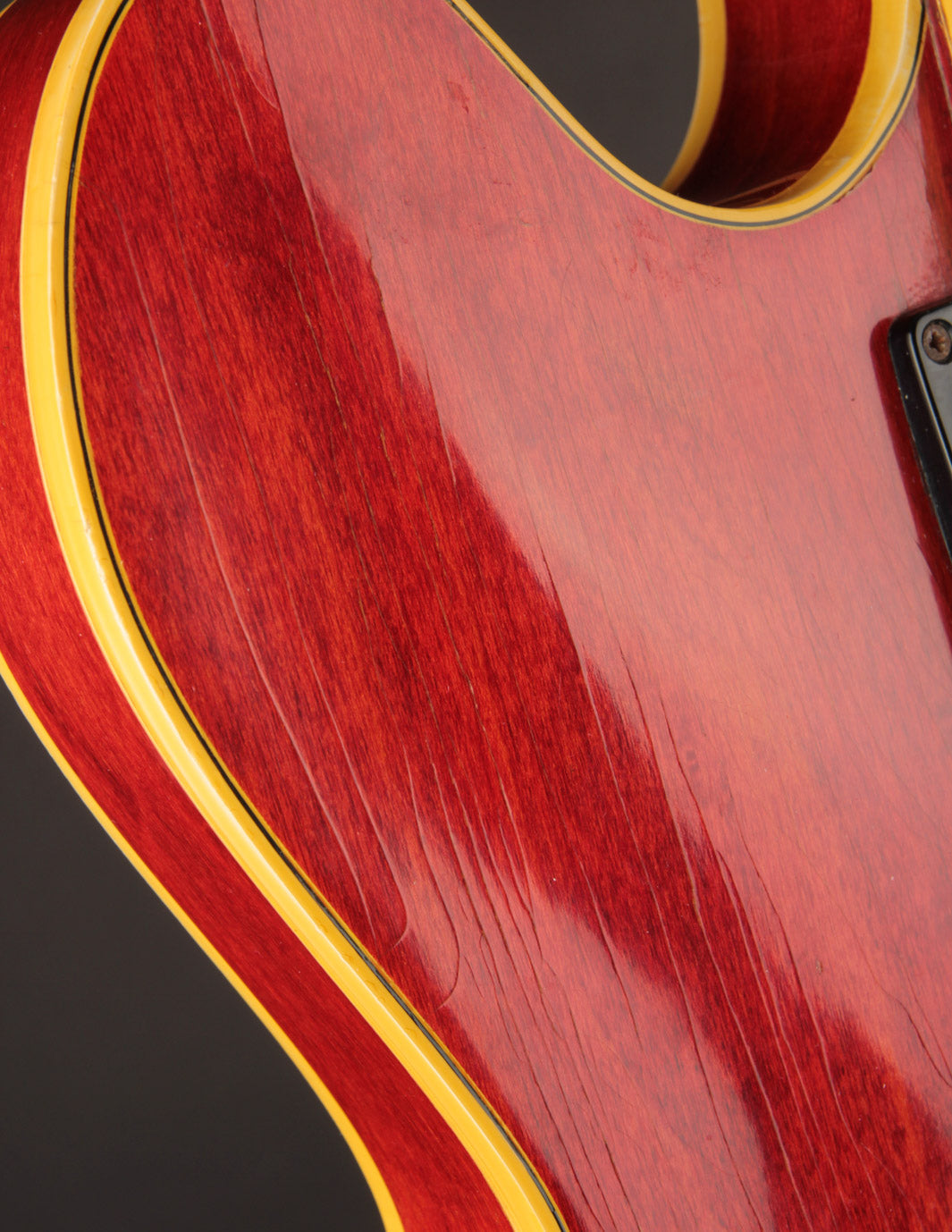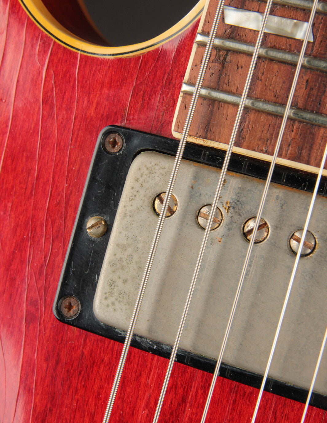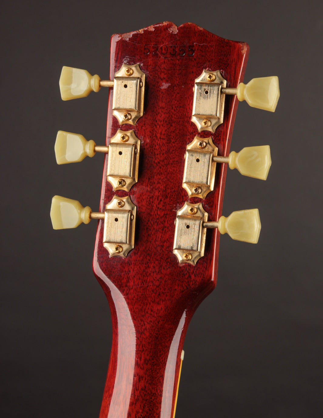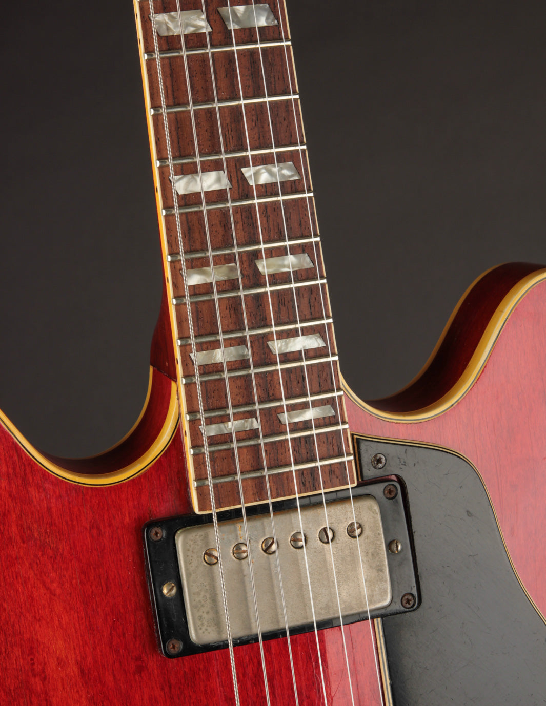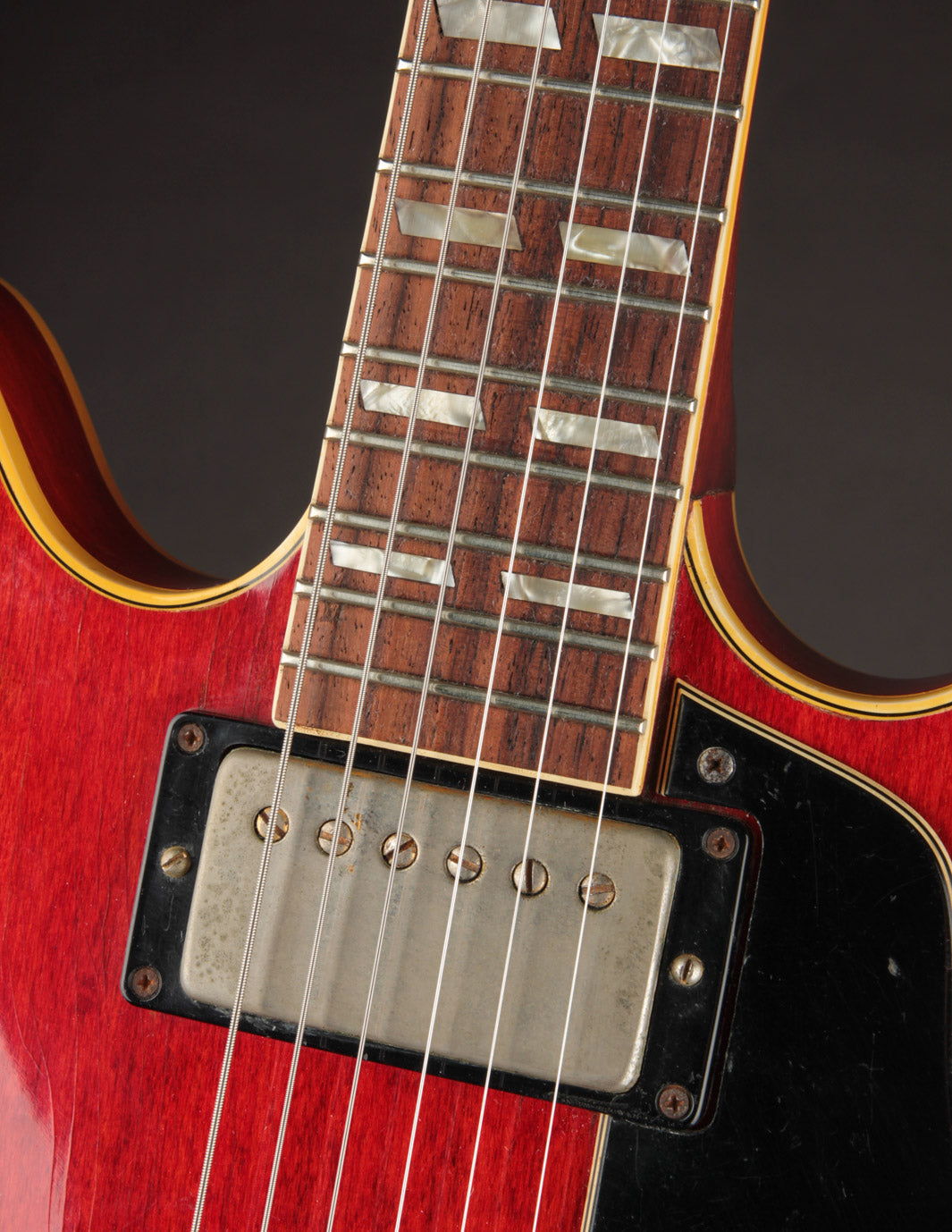 The original tuners and trapeze tailpiece show off a good deal of their original gold plating, with the latter having slightly more contact wear and patina. The ABR-1 is a quality replacement as are the control knobs, but the pickguard, switch tip, and truss rod cover are original to the guitar. The original varitone potentiometer was left installed, disconnected, with its chicken head knob in place.