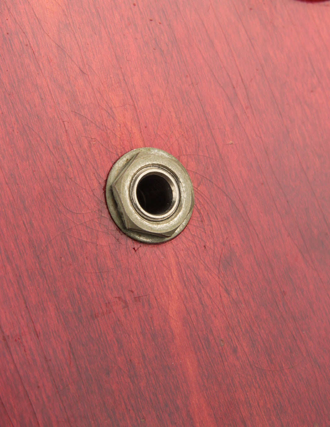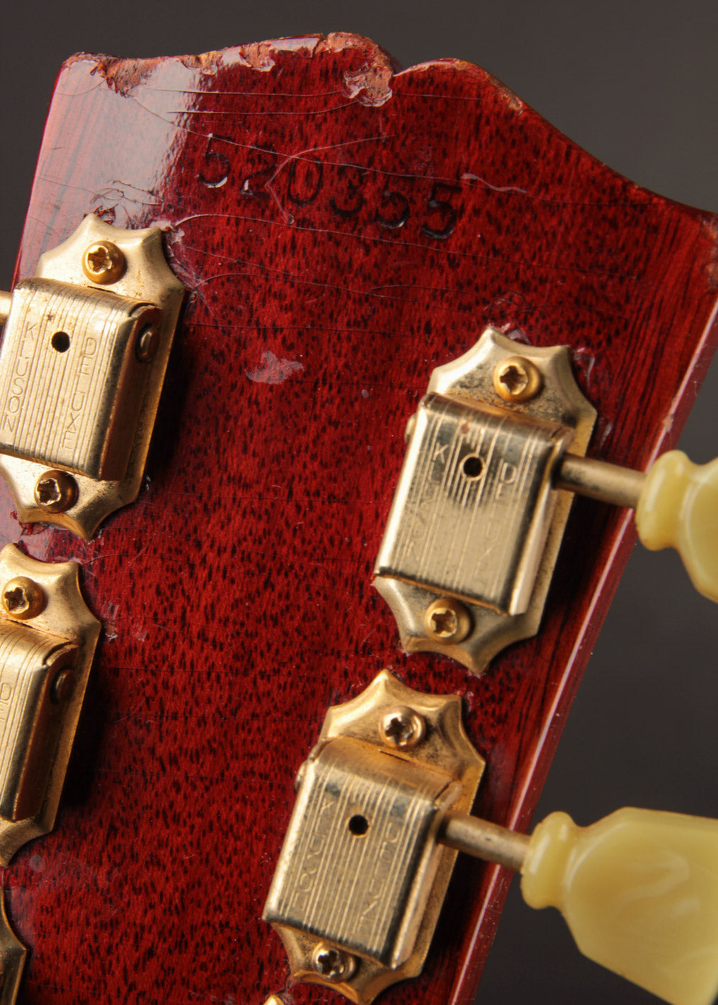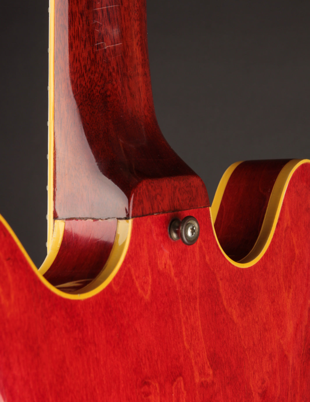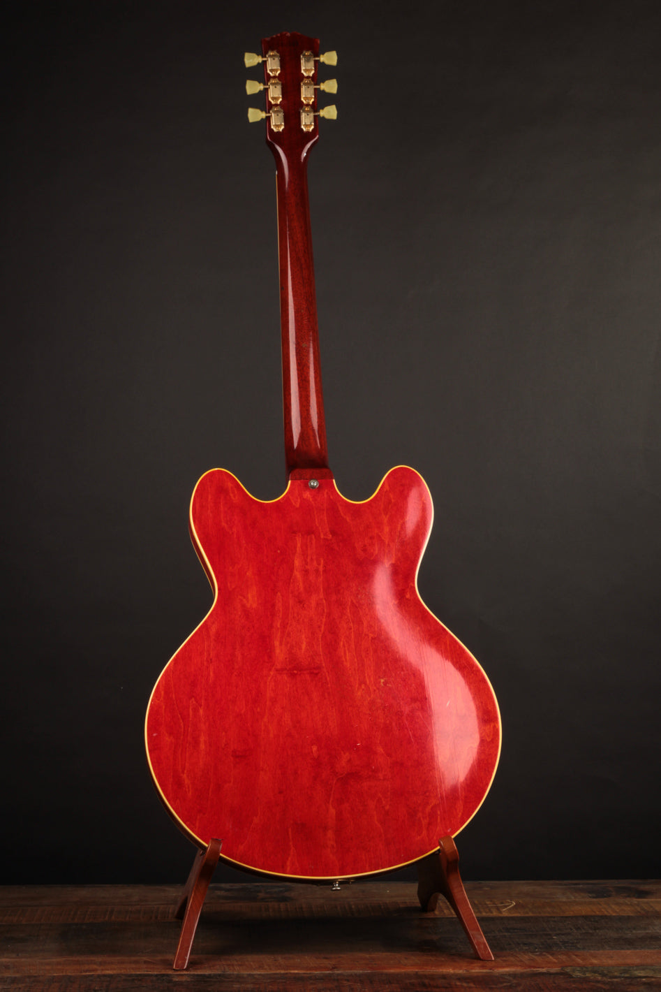 The original tuners and trapeze tailpiece show off a good deal of their original gold plating, with the latter having slightly more contact wear and patina. The ABR-1 is a quality replacement as are the control knobs, but the pickguard, switch tip, and truss rod cover are original to the guitar. The original varitone potentiometer was left installed, disconnected, with its chicken head knob in place.