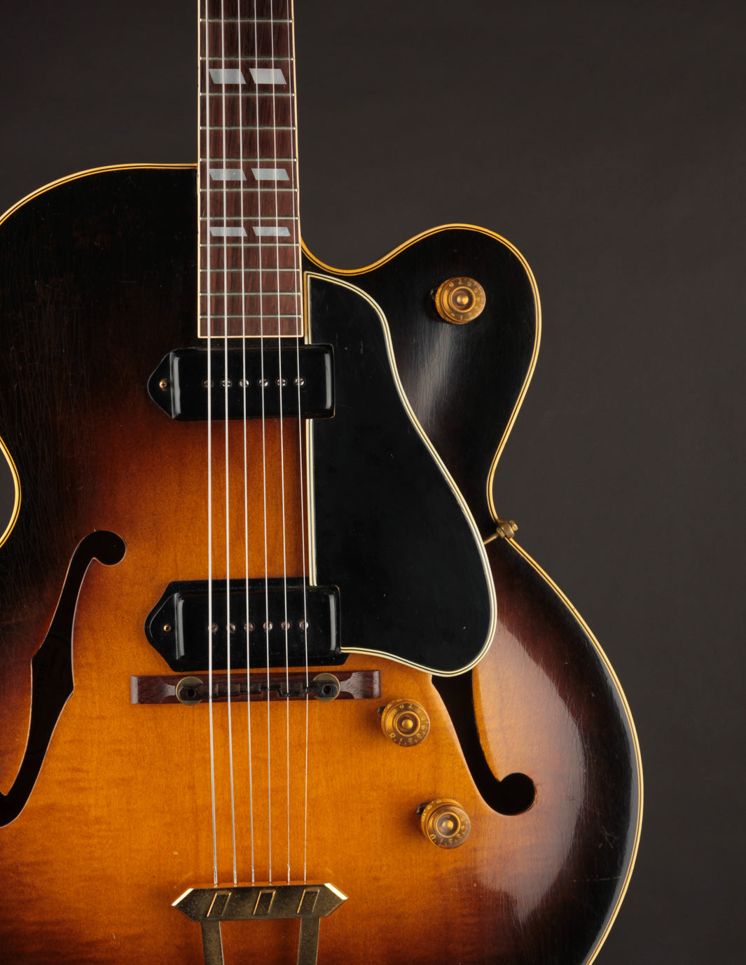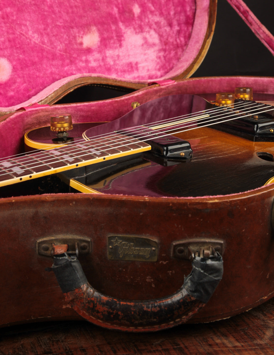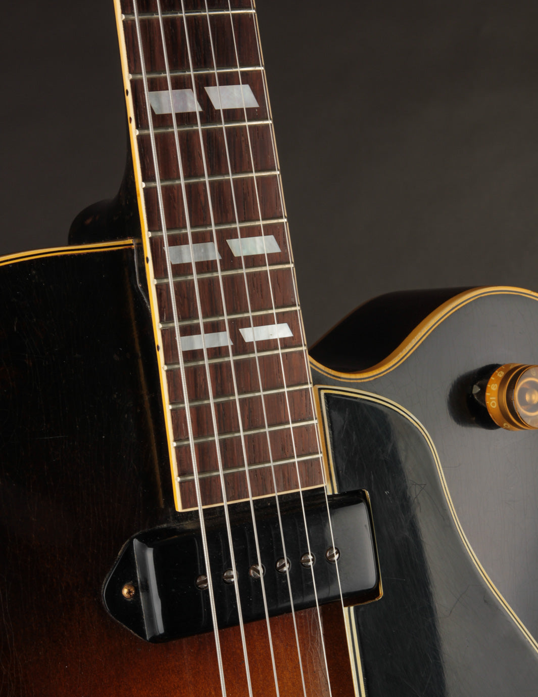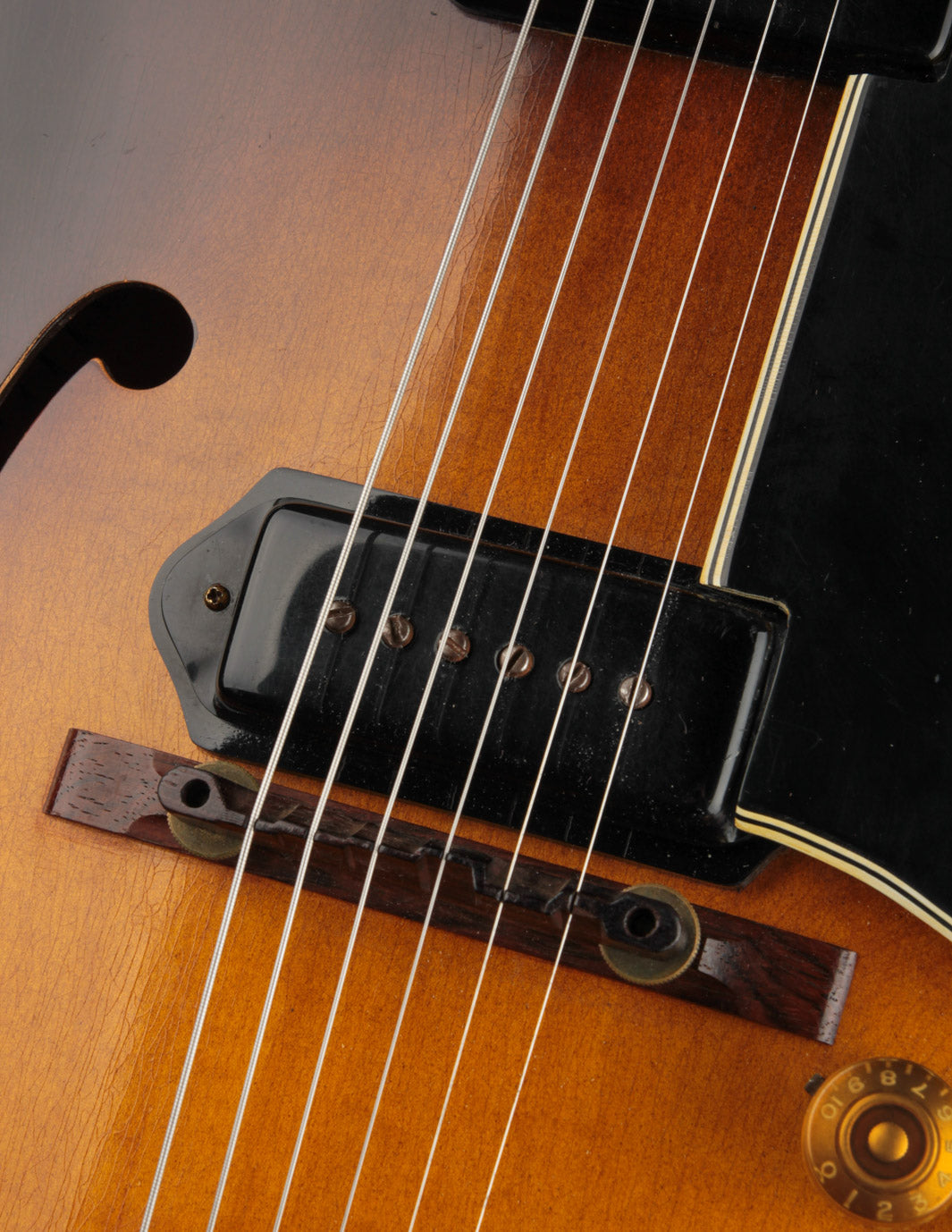 This is a great example of one of the last iterations of the dual-volume and master tone control arrangement, and offers a more simplified approach to blending and/or isolating the original P90 pickups to suit your preference. Well-played but also well-maintained, it's a supremely playable example that is lightweight and robust sounding. The original small frets were replaced with slightly larger fretwire some time ago, along with a new nut. The pickguard was also replaced while using the same mounting hardware. The tailpiece is a replacement, but the original rests inside the case.