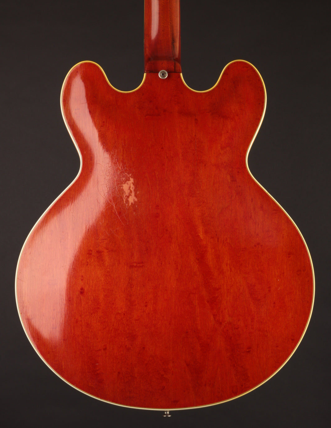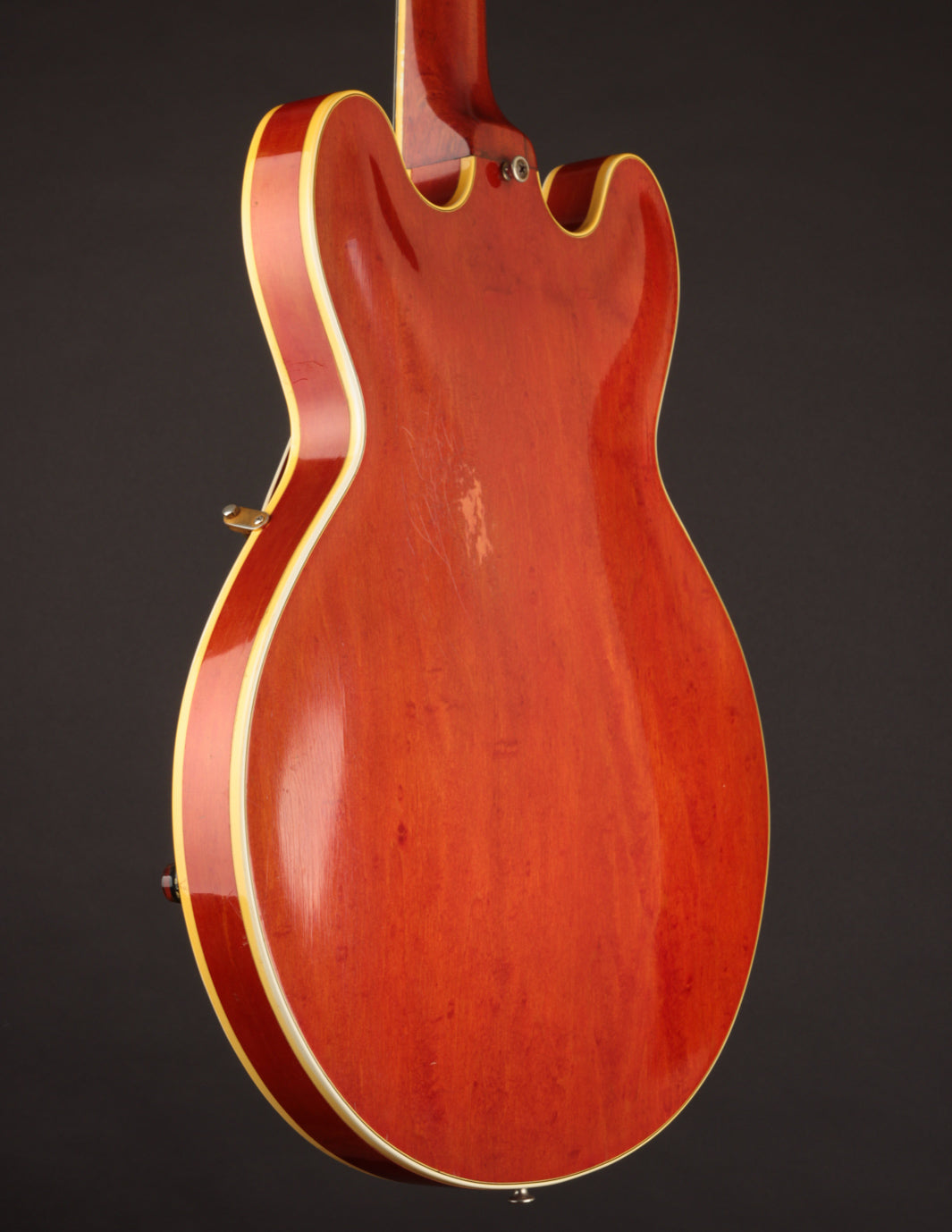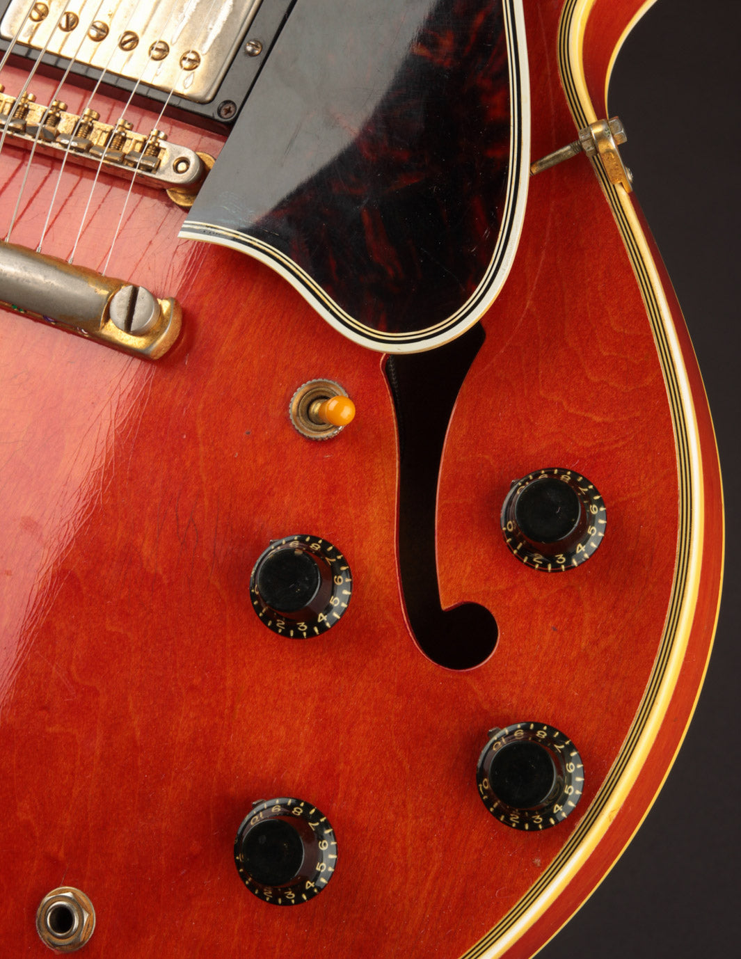 What makes this ES-355 different from the ES-335 is primarily in appointment level, but more commonly the 355s are outfitted with a Bigsby tailpiece and wired for stereo use via the Varitone circuit. For one to obtain an ES-355 with a mono input and a stop bar tailpiece, it would have to be a special order. There's no denying that this ES-355 ticks the boxes for a special order. Mechanically, we're now closer to a stock ES-335, which puts this ES-355 into the 'ultra rare' category.